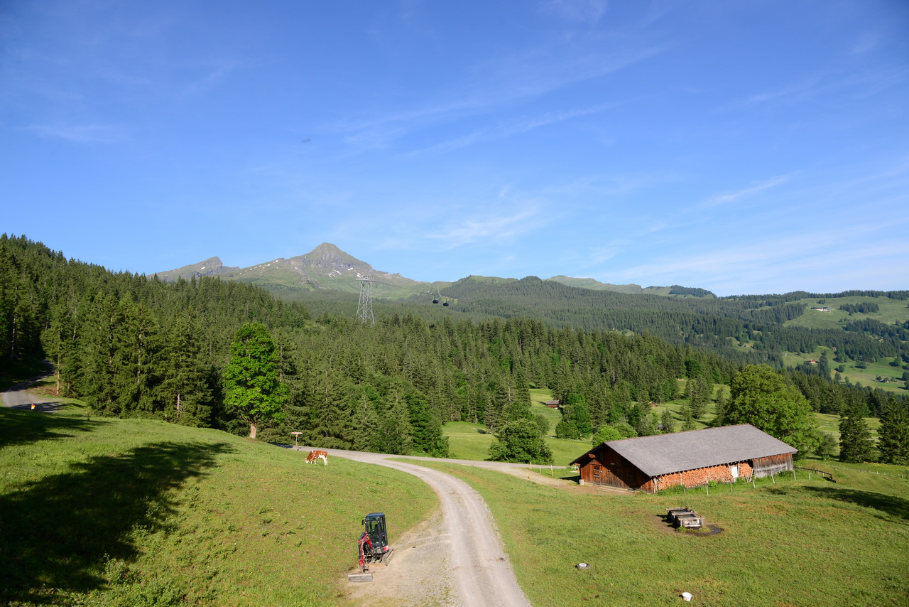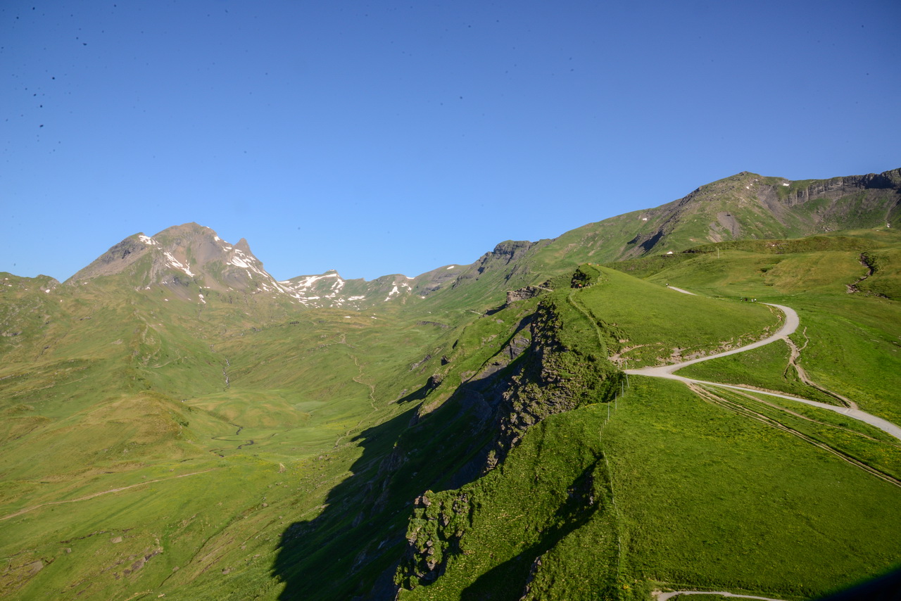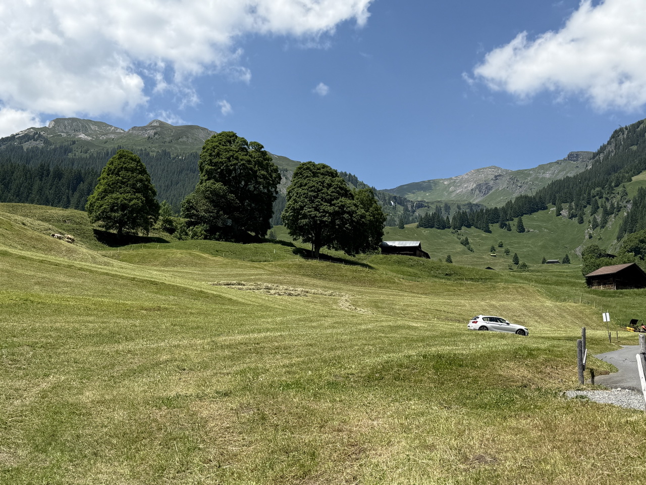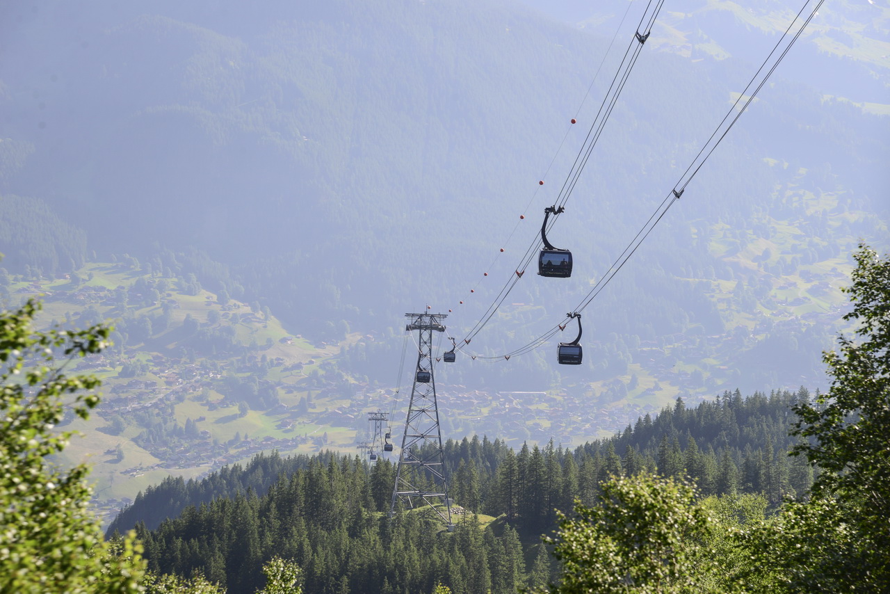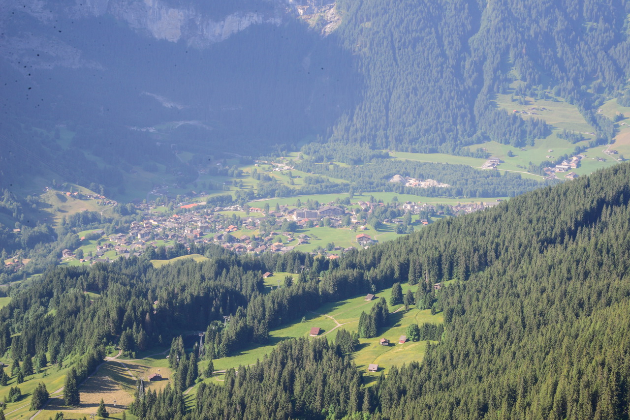 下山如果搭纜車回到格林德瓦,是非常快速的。為了體驗一下經過山間小鎮的風光,採租用山景滑板車下山。這是一種滑板車,把手具有前後輪的刹車系統,不用腳踩,只順著山坡自然的坡度向下滑,就可以抵達格林德瓦市區的 First 纜車站。山路雖然可以通行汽車,卻也不是很寬,有汽車來時得停下來讓汽車先行。另外一個重點是,經過陡坡時速度是很快的,如果刹車不當,又或是過於恐懼的人,是有可能摔車的。所以,這並不是絕對安全的器材。