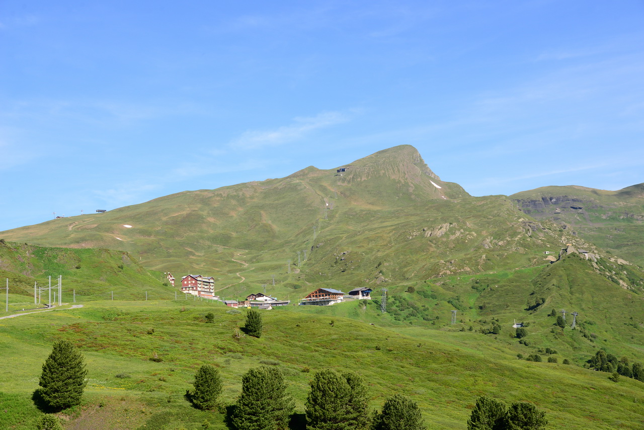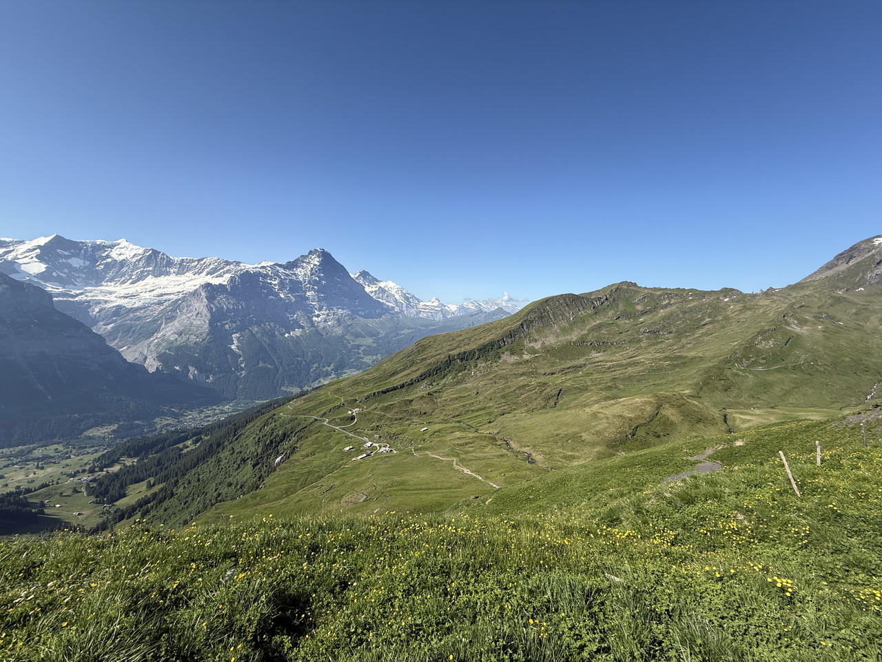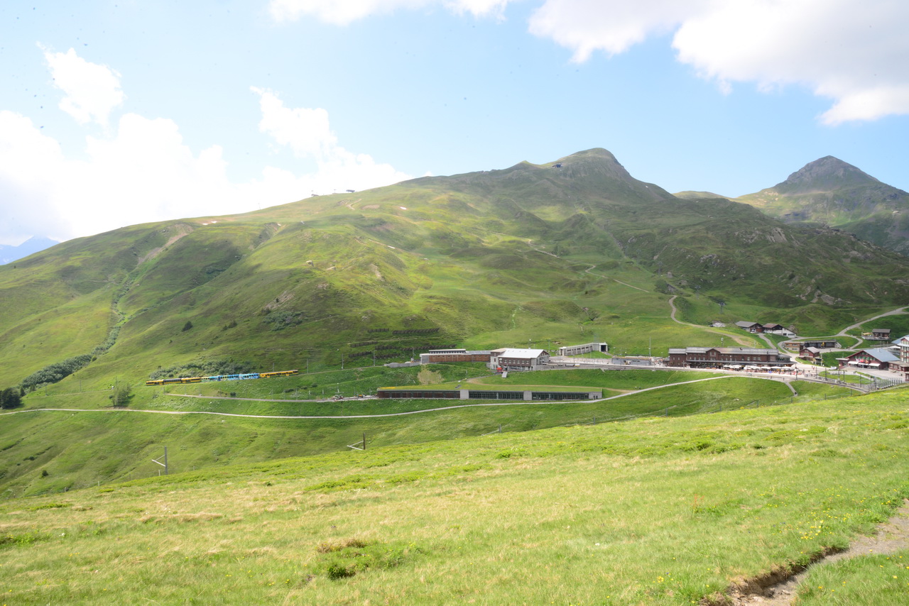 接下來是表定的四十分鐘,從艾格冰河車站健行到小夏戴克火車站。出發後全程都是下坡,起點就已經可遠望到小夏戴克,路徑十分清楚,沿途也都有指標,不必過度擔心走錯路。向小夏戴克望去,是一大片坡度和緩的山坡草原,難怪它是冬季最熱門的滑雪勝地。晴天走在野花盛開,一望無際的美麗草原上,舒服極了。