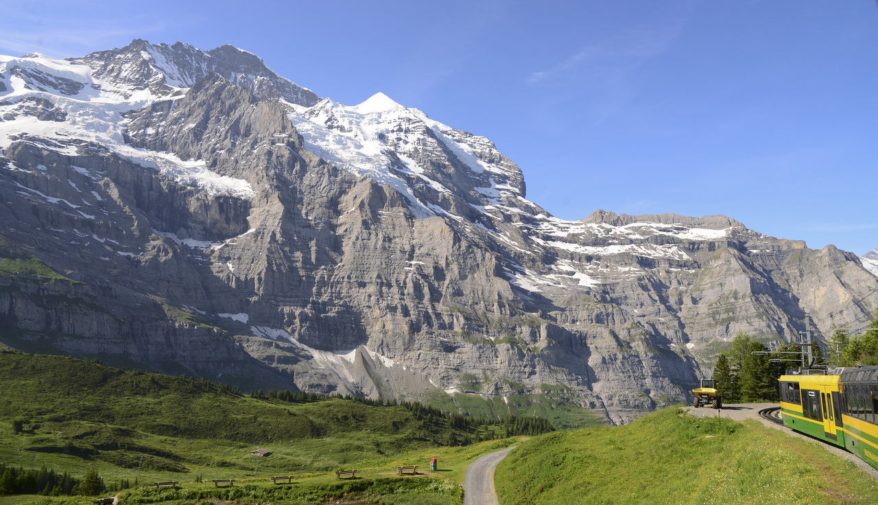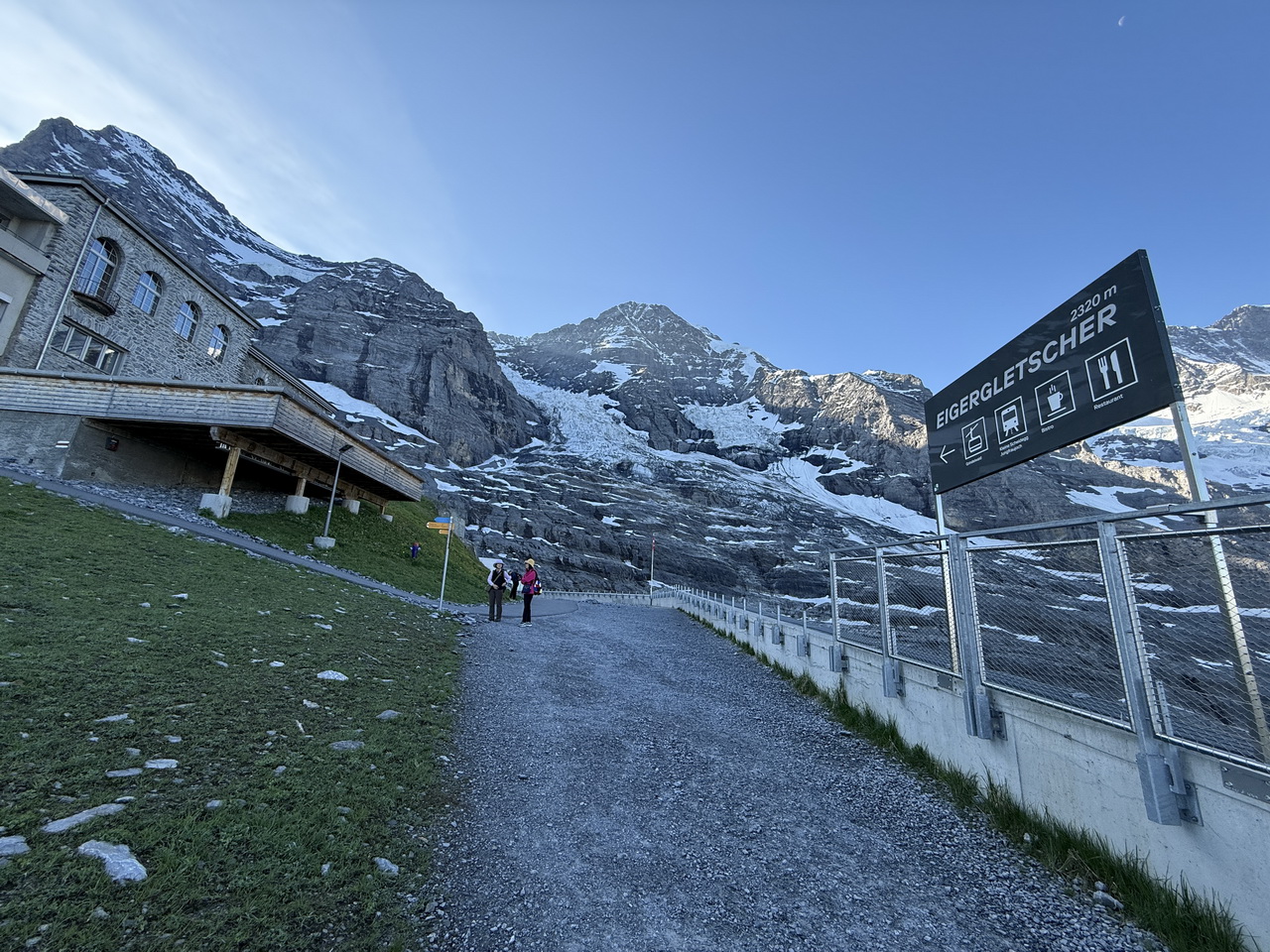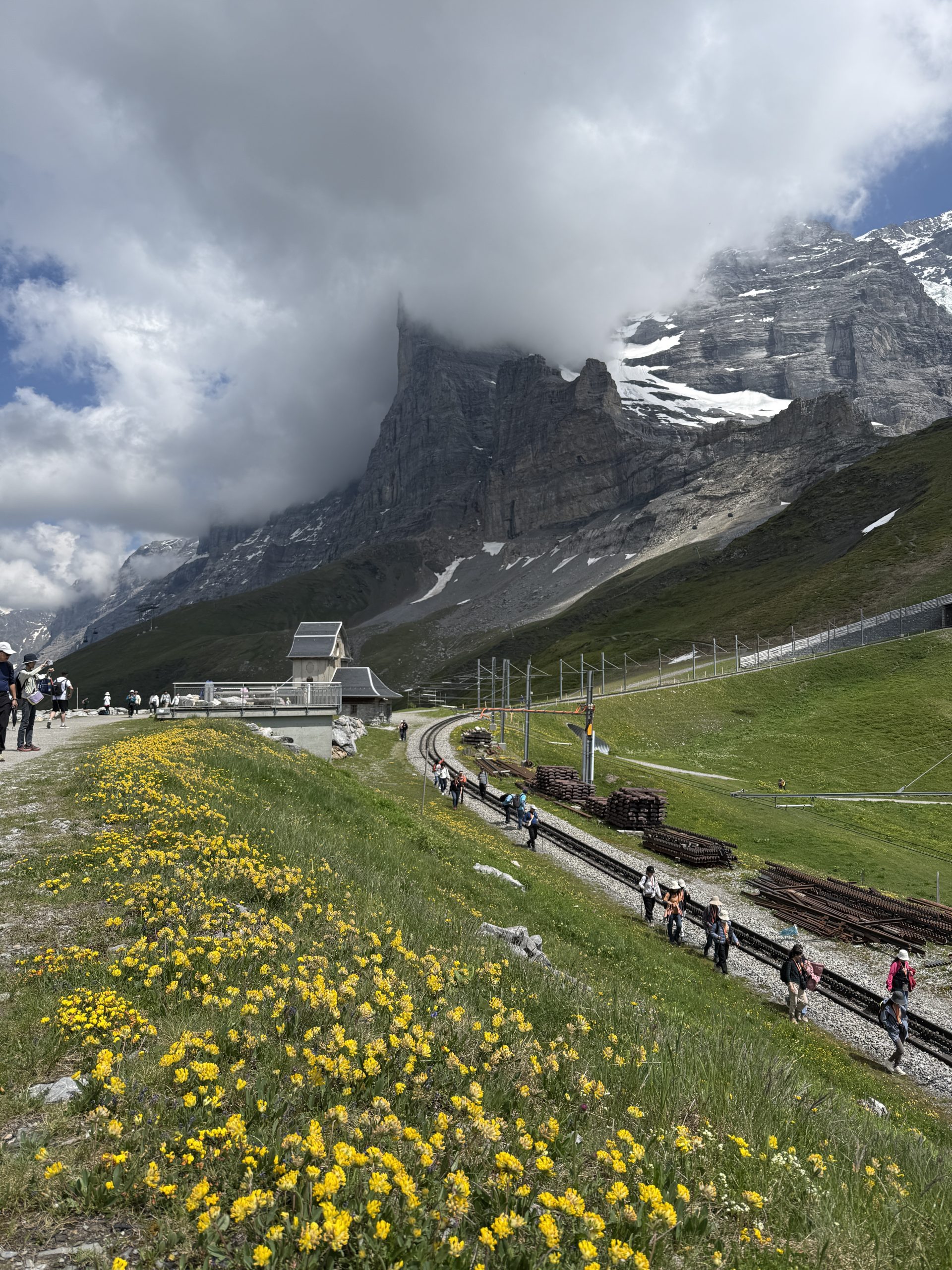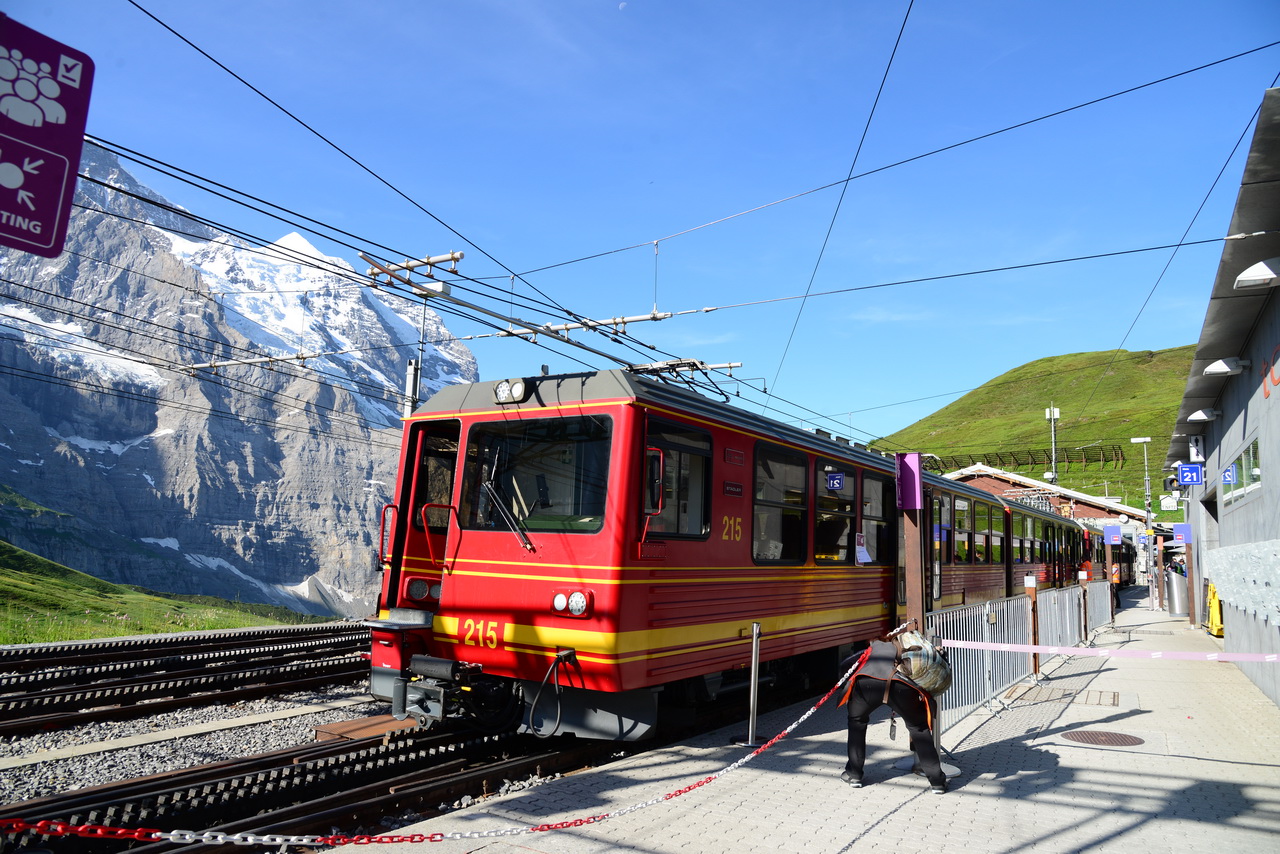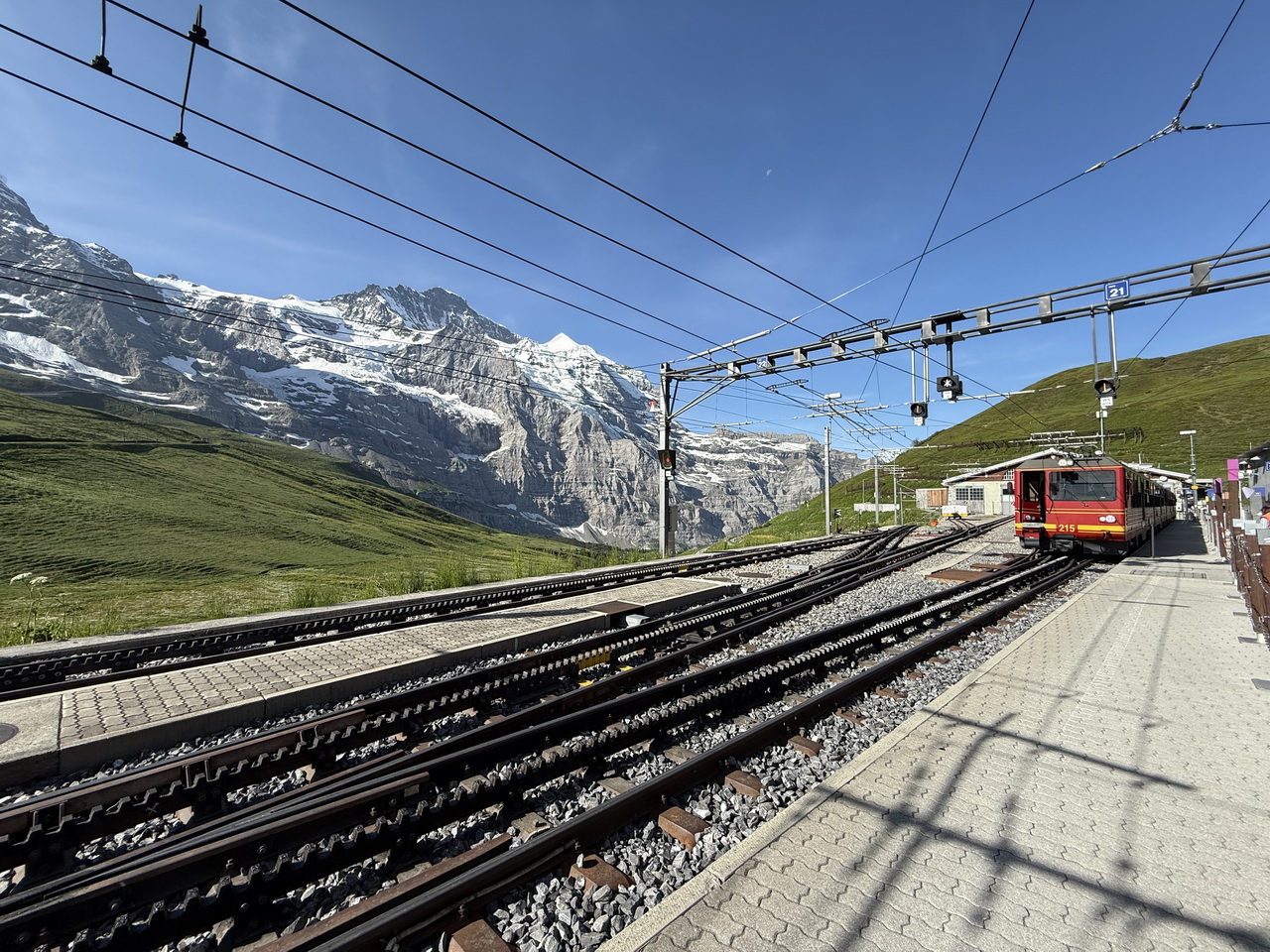 我們比預定搭少女峰火車的時間早到了許多,走到車站外,旁邊就是陡峭的艾格峰北壁,對面則是下午要走的小夏戴克步道。看著美麗的山景,等待的時間很快就過去了。