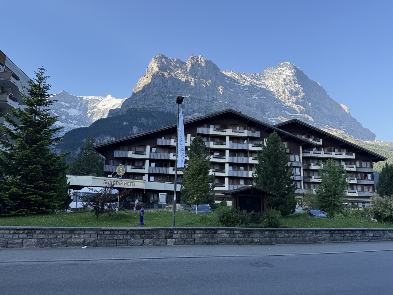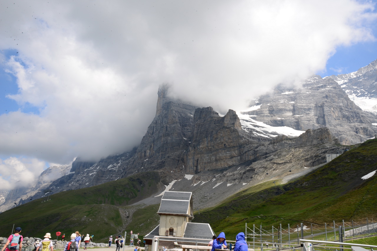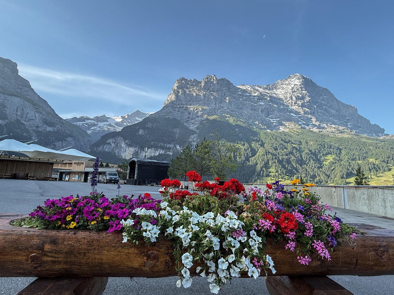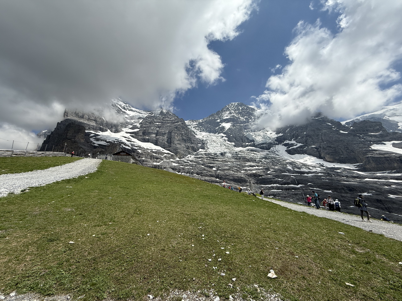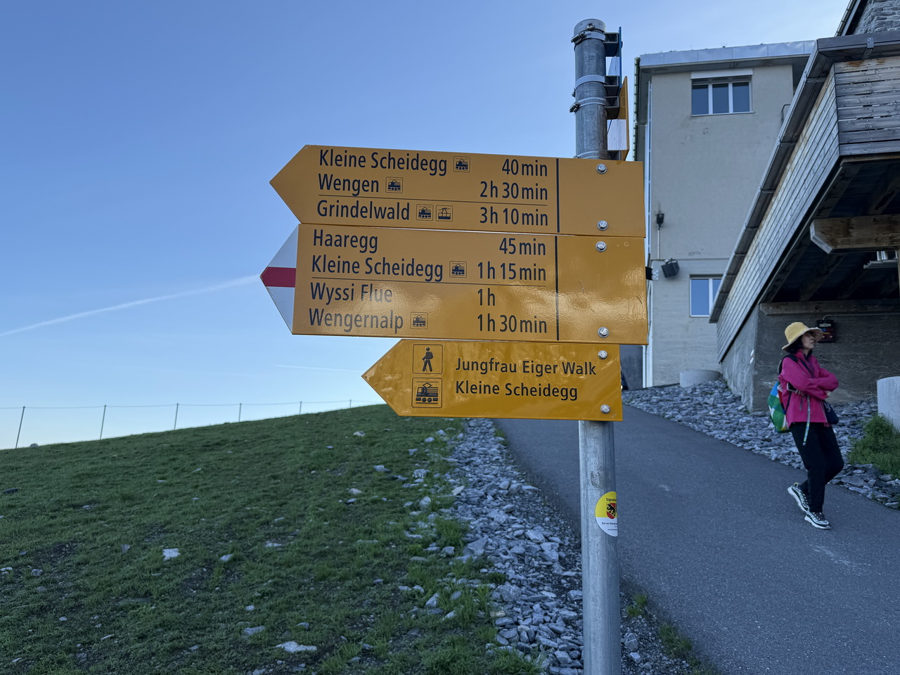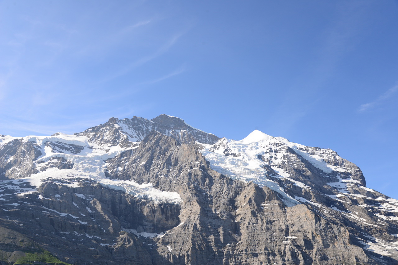 我們比預定搭少女峰火車的時間早到了許多,走到車站外,旁邊就是陡峭的艾格峰北壁,對面則是下午要走的小夏戴克步道。看著美麗的山景,等待的時間很快就過去了。