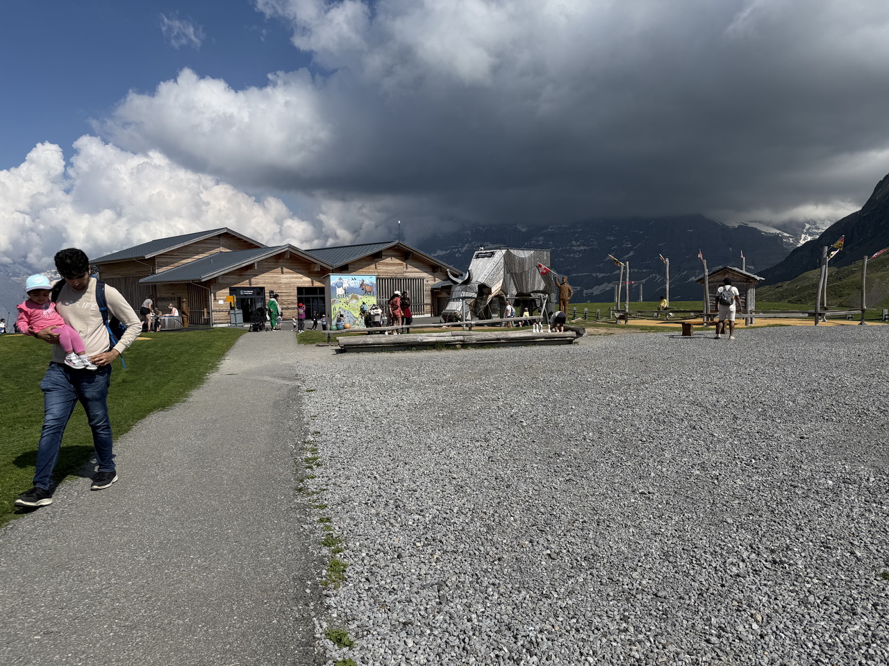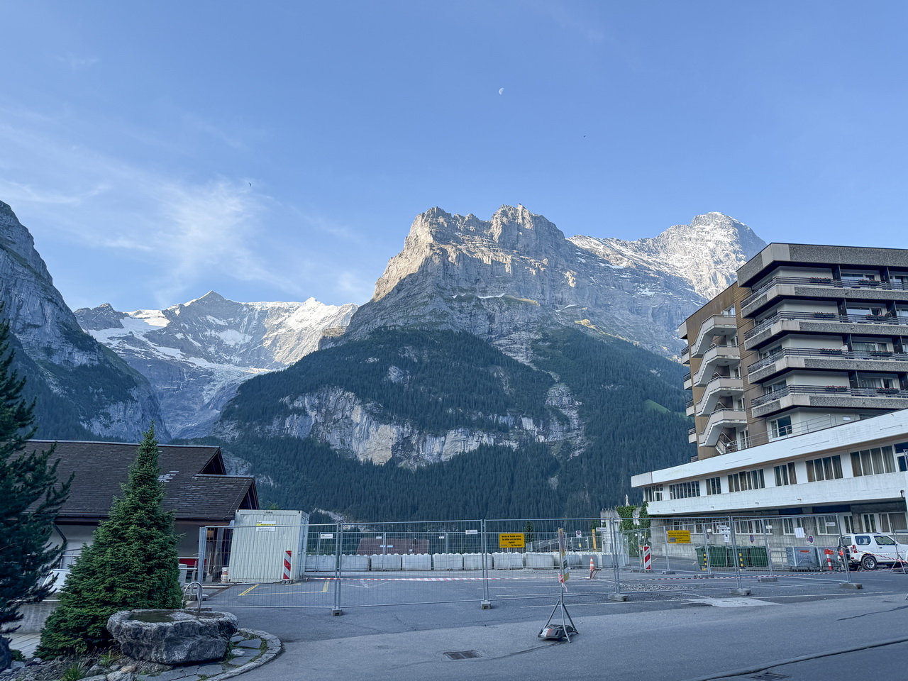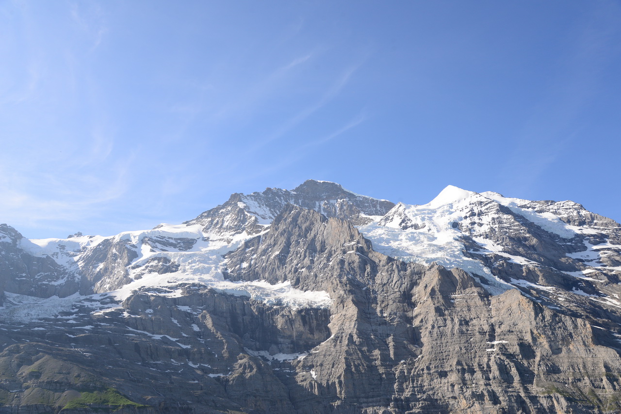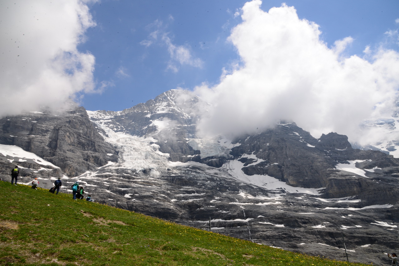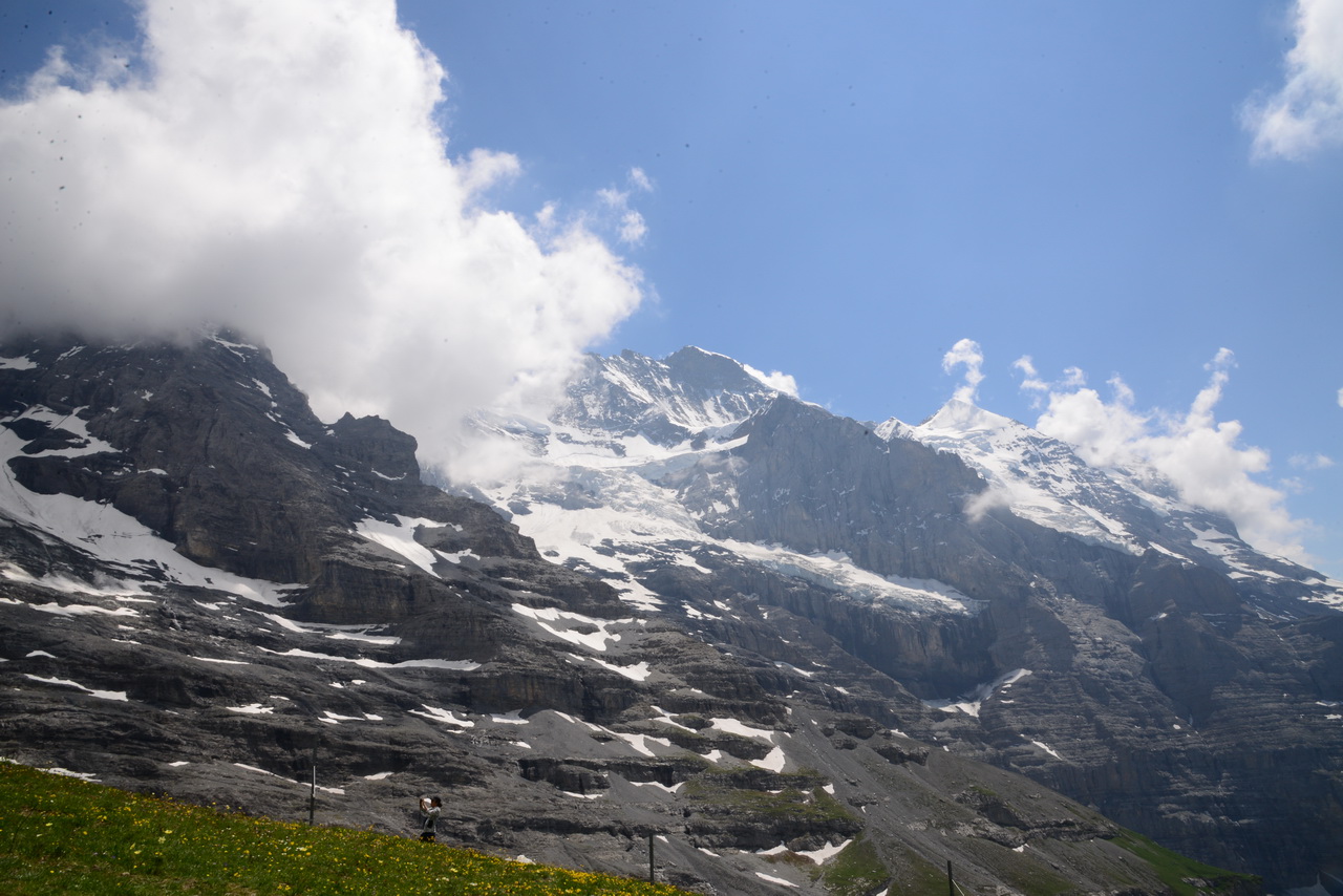 我們比預定搭少女峰火車的時間早到了許多,走到車站外,旁邊就是陡峭的艾格峰北壁,對面則是下午要走的小夏戴克步道。看著美麗的山景,等待的時間很快就過去了。
