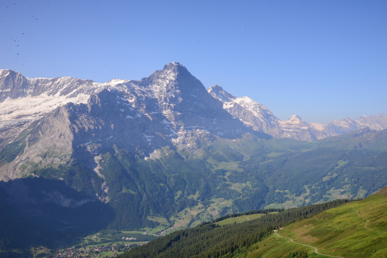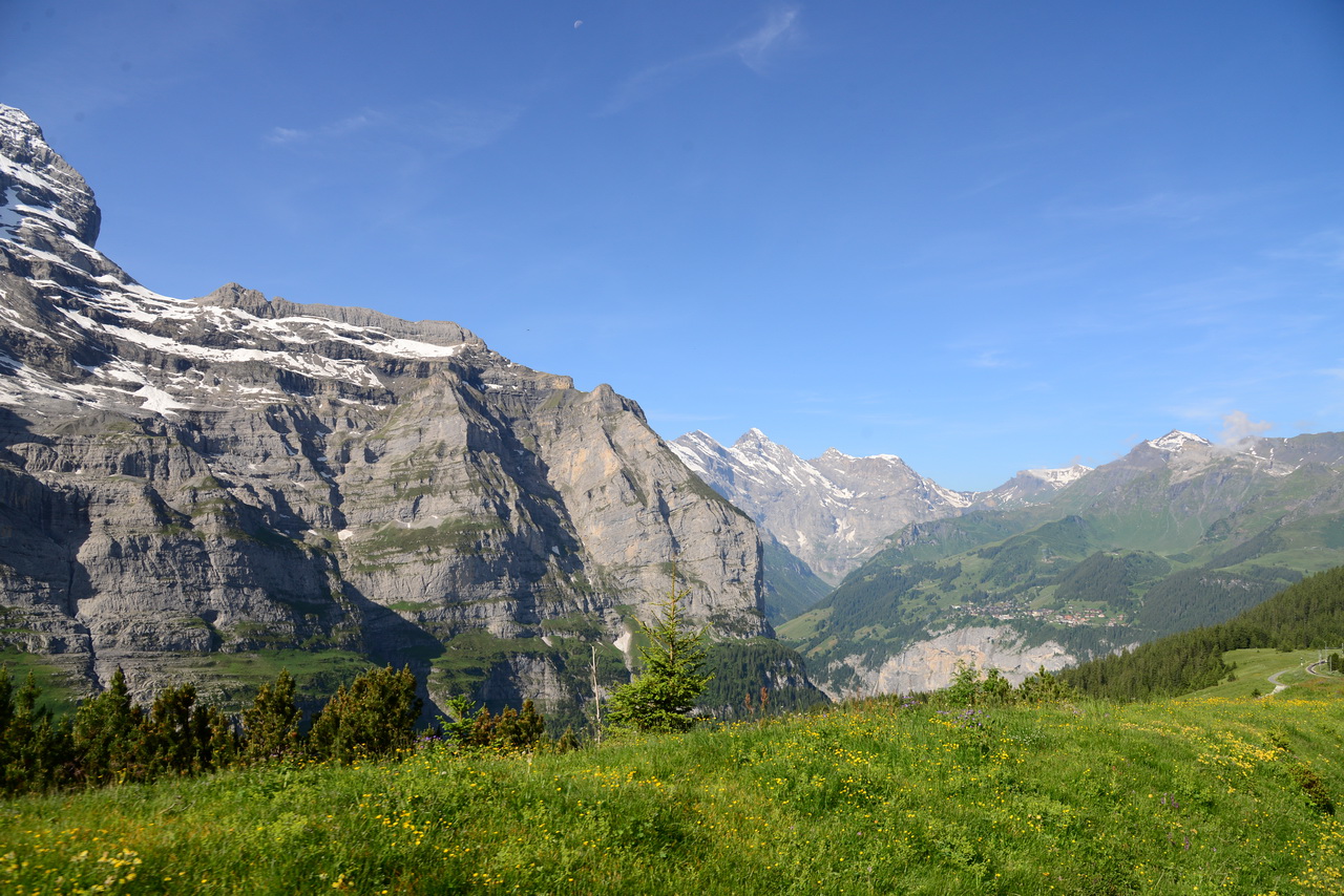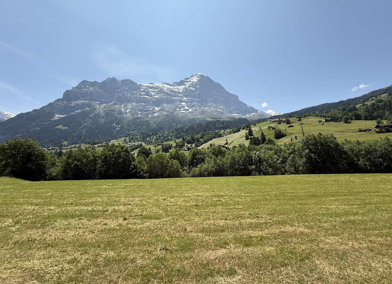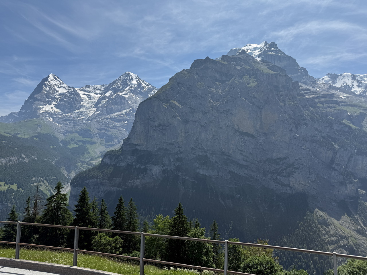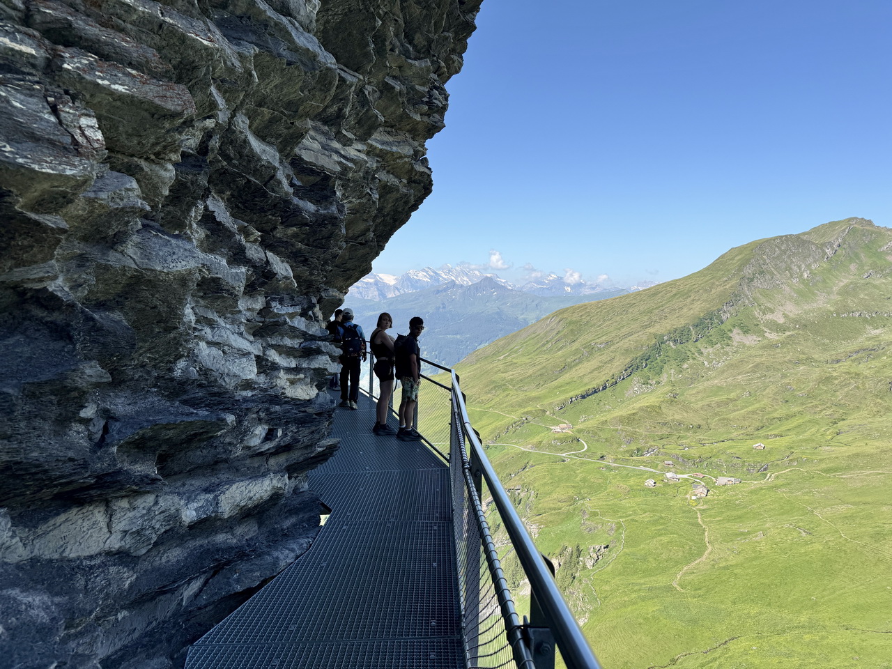 我們比預定搭少女峰火車的時間早到了許多,走到車站外,旁邊就是陡峭的艾格峰北壁,對面則是下午要走的小夏戴克步道。看著美麗的山景,等待的時間很快就過去了。