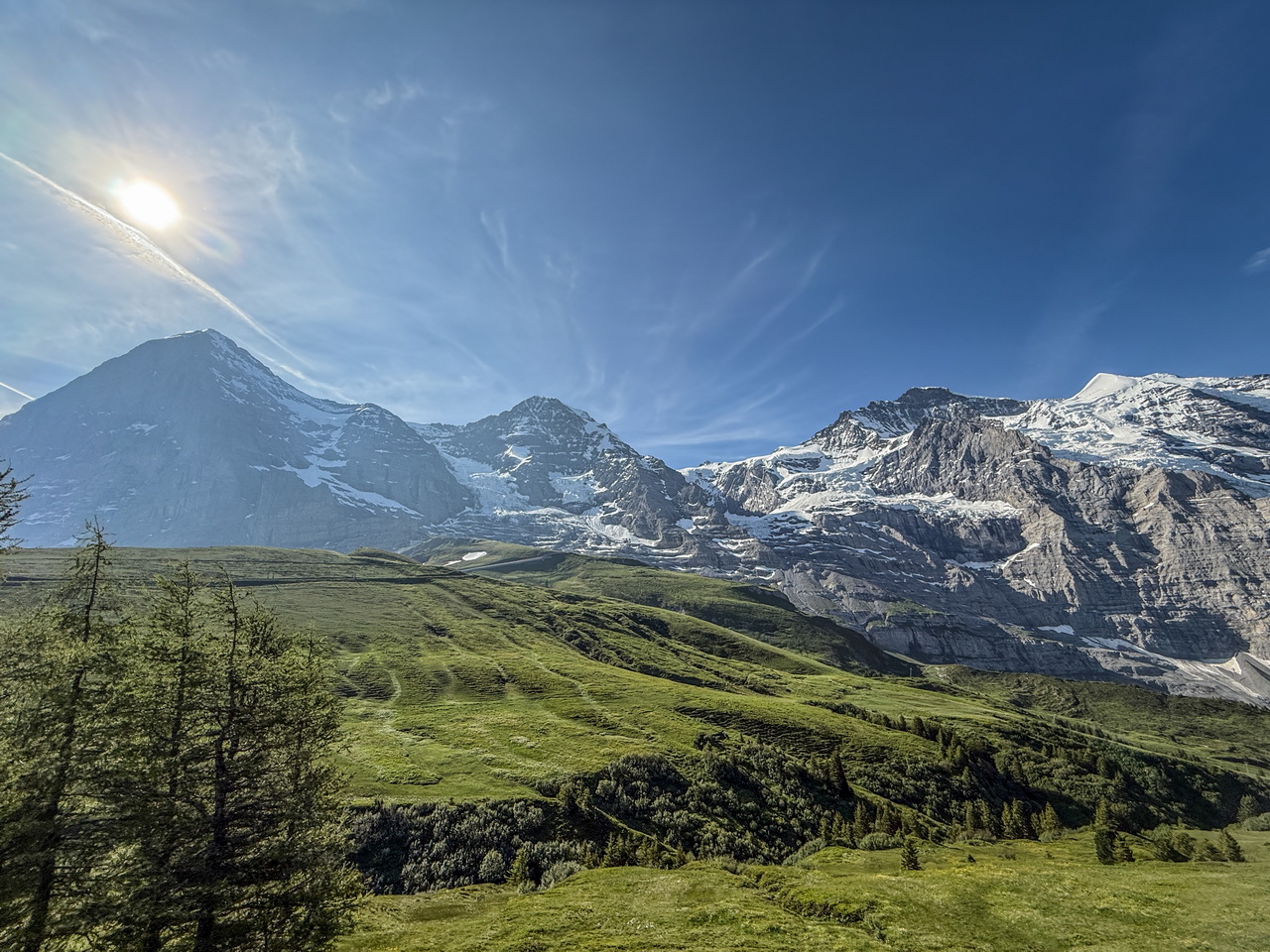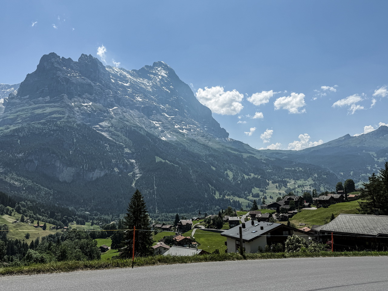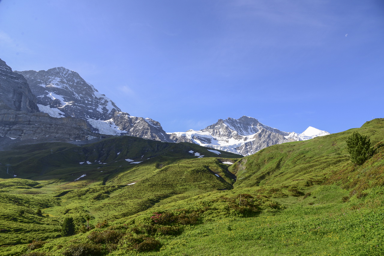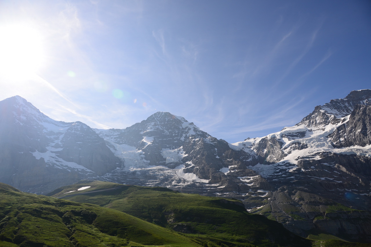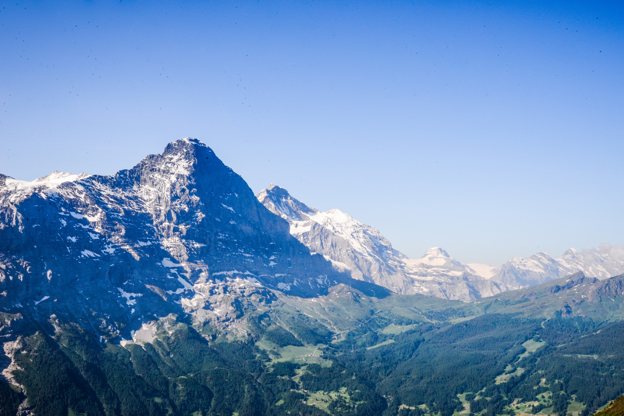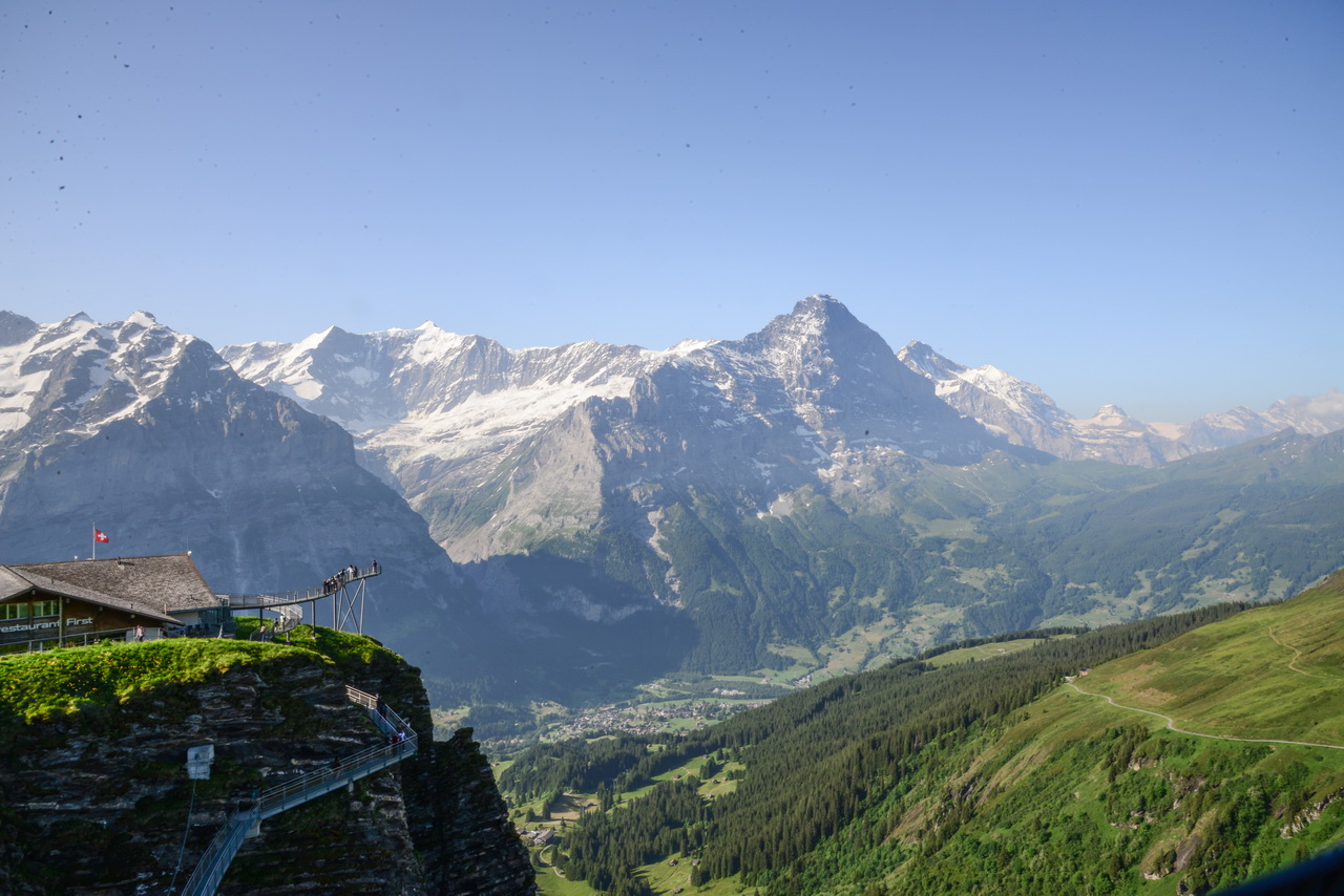 我們比預定搭少女峰火車的時間早到了許多,走到車站外,旁邊就是陡峭的艾格峰北壁,對面則是下午要走的小夏戴克步道。看著美麗的山景,等待的時間很快就過去了。