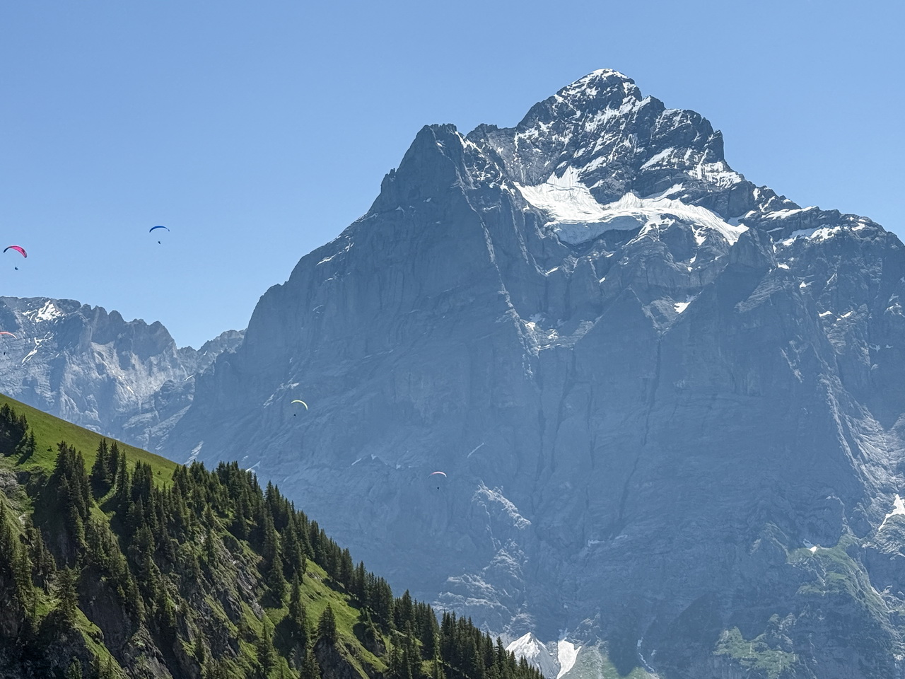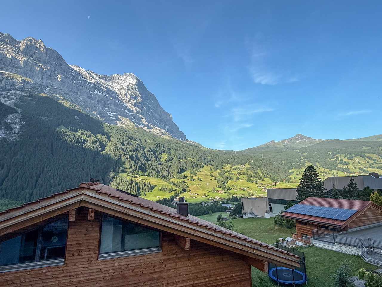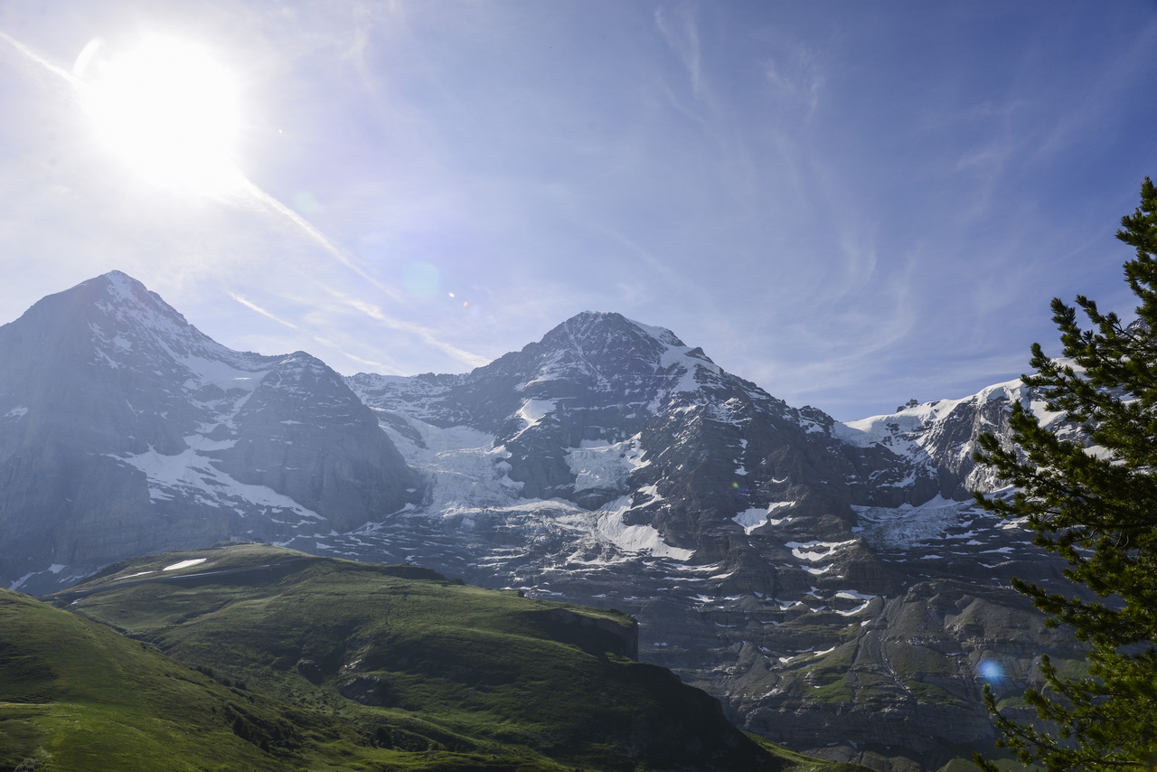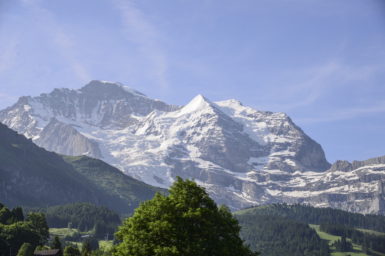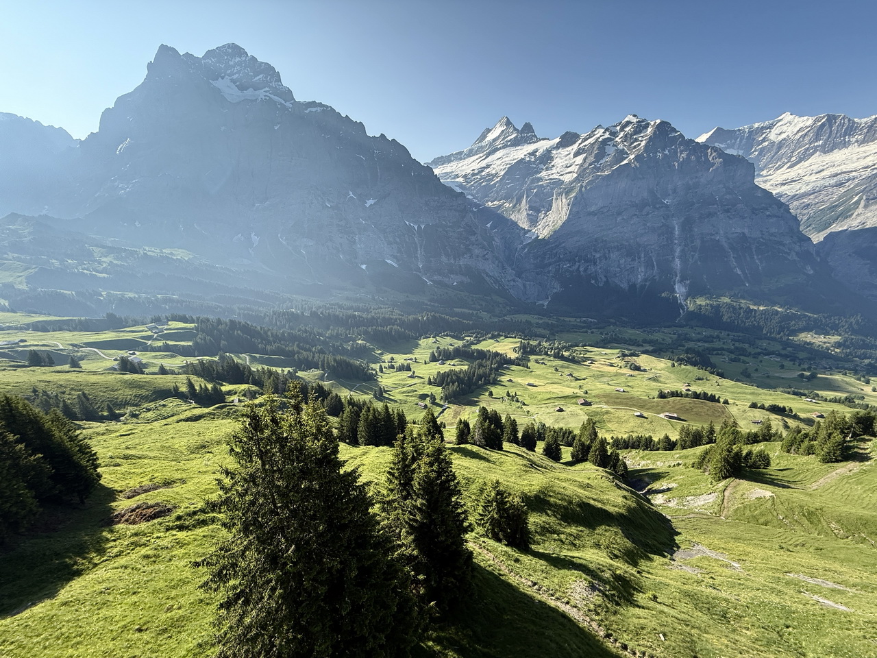 我們比預定搭少女峰火車的時間早到了許多,走到車站外,旁邊就是陡峭的艾格峰北壁,對面則是下午要走的小夏戴克步道。看著美麗的山景,等待的時間很快就過去了。