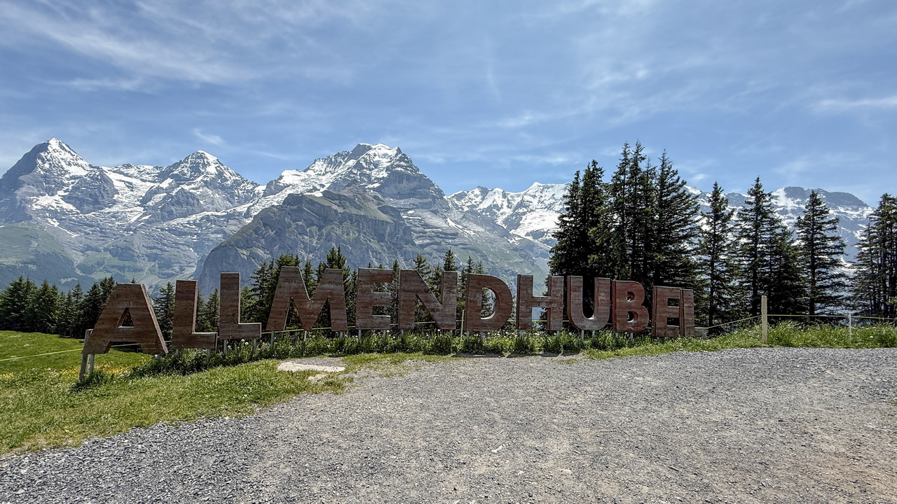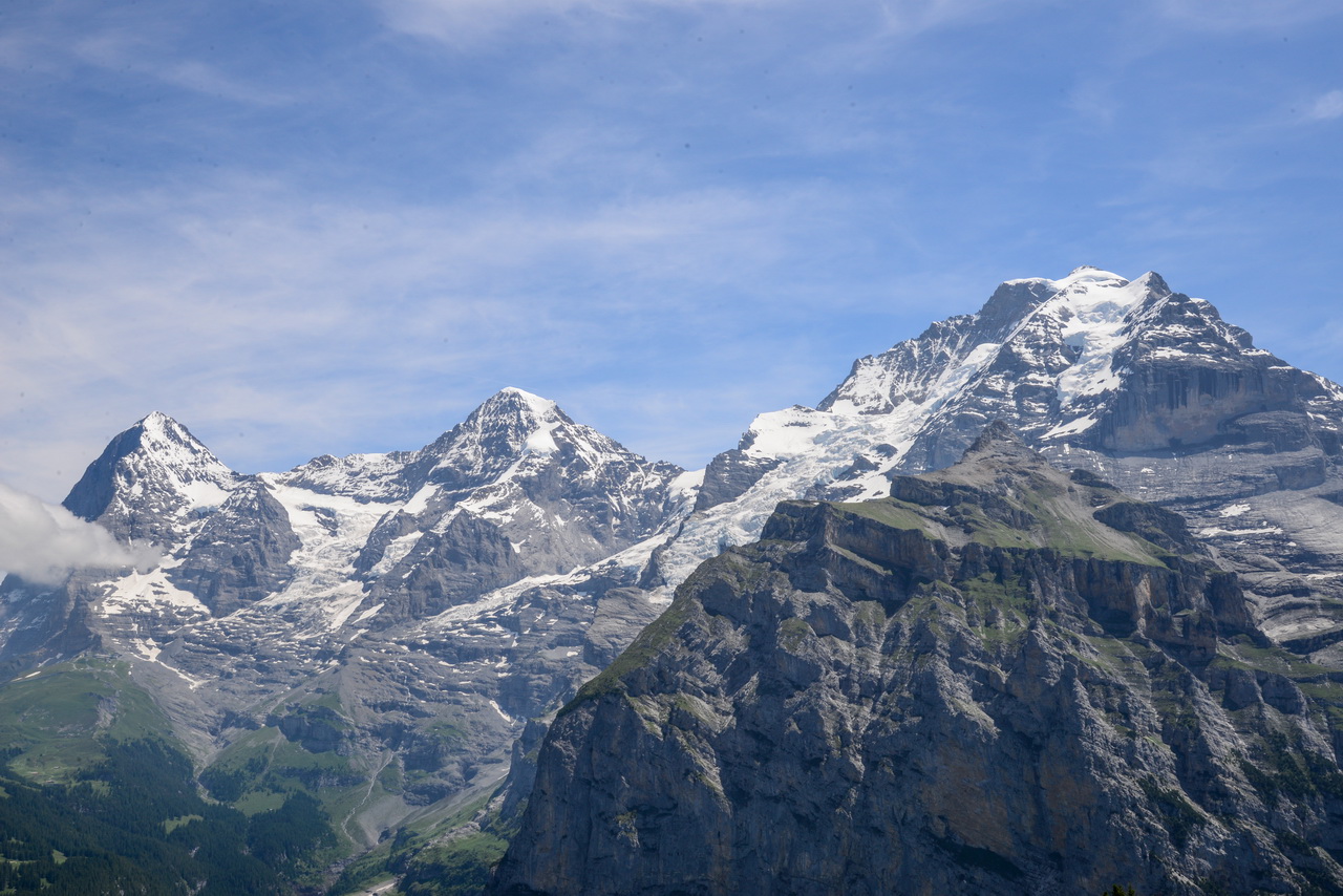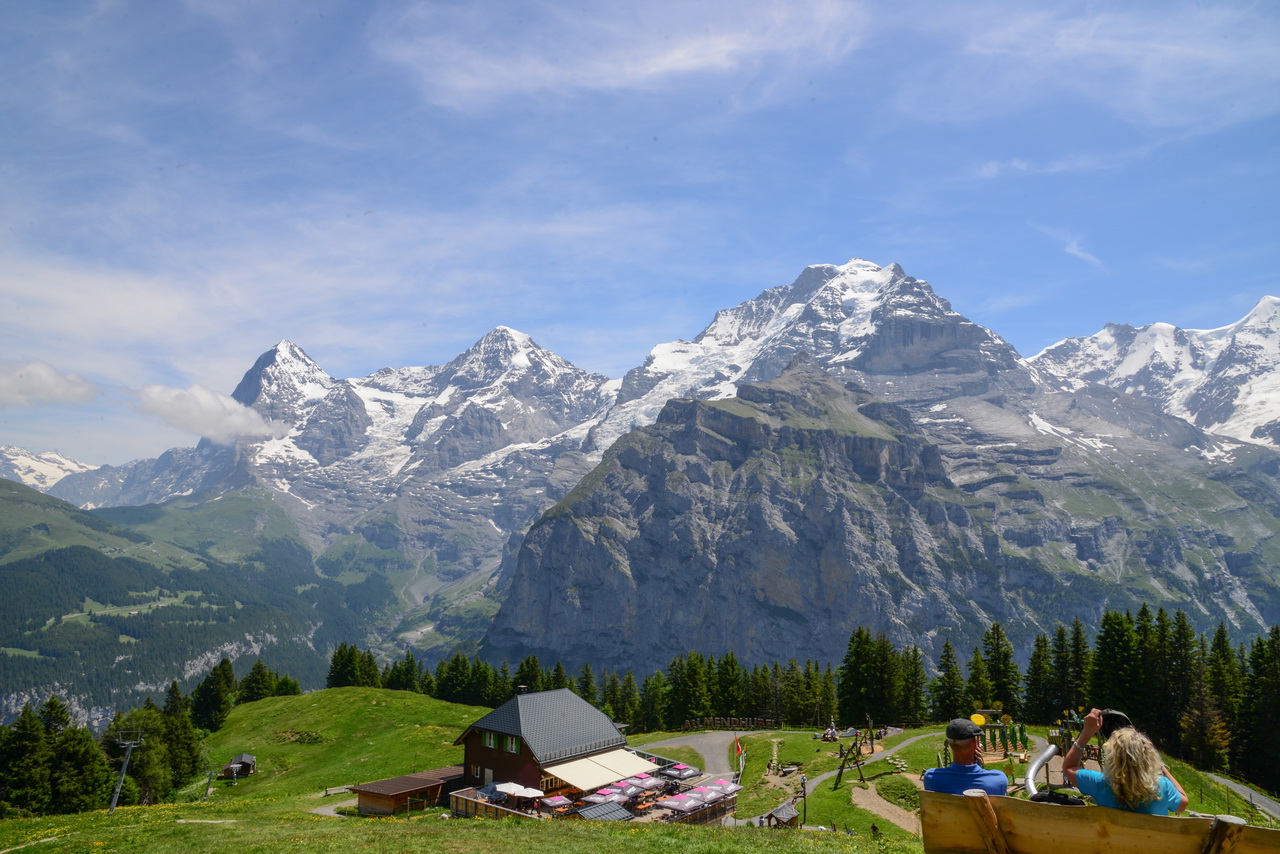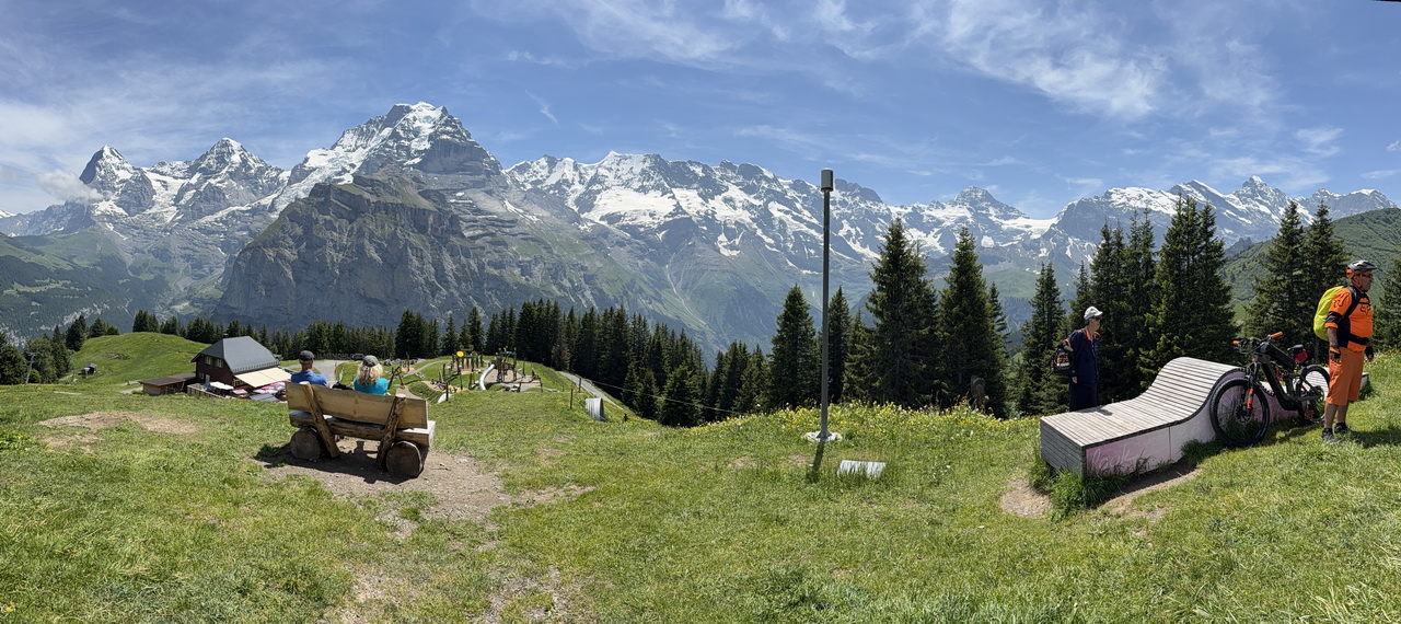 在火車站對面,先搭纜車,到山頂再轉乘火車,很快地就抵達 Murren 。穿過市區找到齒軌纜車站,直達 Allmendhubel 。這裡被稱為鮮花之谷。山上的花並不是人工大面積種植某種草花,它是自然的在山坡草原上,春天到臨時開放的各種草花,點綴在大片草原上。步道發達,健行、越野騎自行車,都是熱門的活動。在具有360度視野的高點,可以眺望艾格峰、僧侶峰、少女峰一列排開。向後轉,沿著纜車線向上延伸,雪朗峰就在那裡。好多美景,都想去走一走,可是得有充裕的時間才能得以實現。