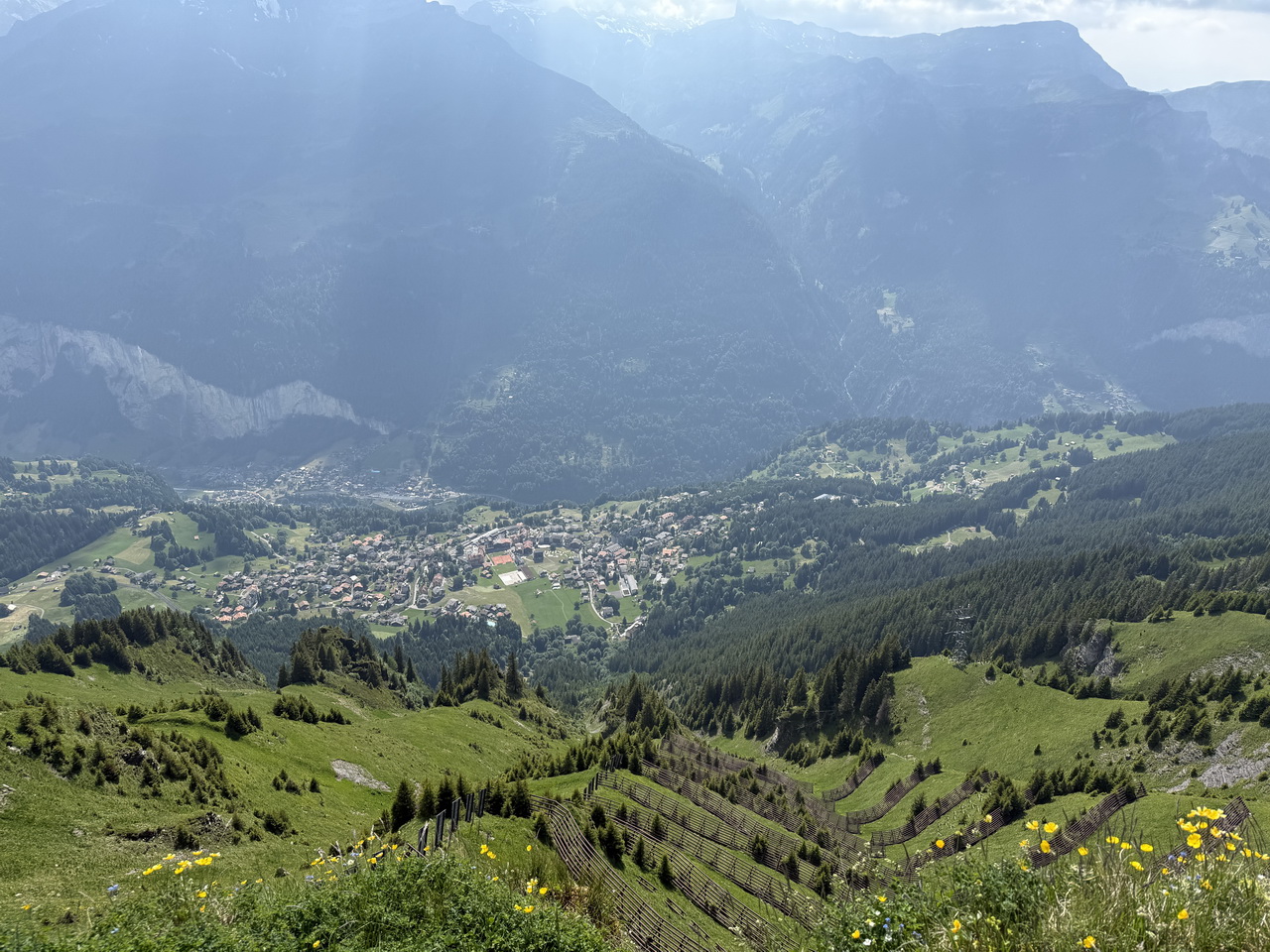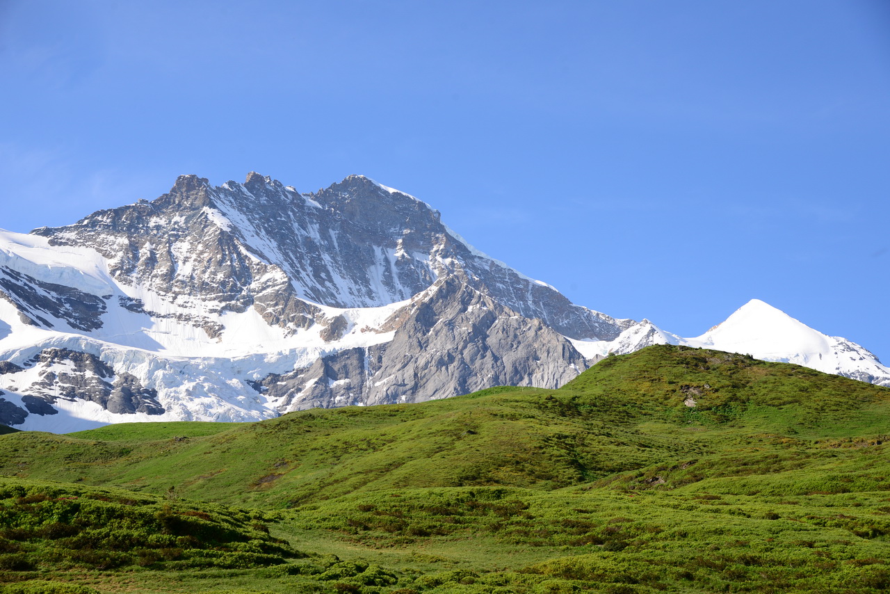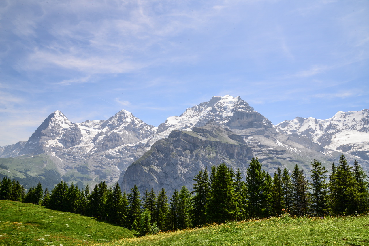 在火車站對面,先搭纜車,到山頂再轉乘火車,很快地就抵達 Murren 。穿過市區找到齒軌纜車站,直達 Allmendhubel 。這裡被稱為鮮花之谷。山上的花並不是人工大面積種植某種草花,它是自然的在山坡草原上,春天到臨時開放的各種草花,點綴在大片草原上。步道發達,健行、越野騎自行車,都是熱門的活動。在具有360度視野的高點,可以眺望艾格峰、僧侶峰、少女峰一列排開。向後轉,沿著纜車線向上延伸,雪朗峰就在那裡。好多美景,都想去走一走,可是得有充裕的時間才能得以實現。