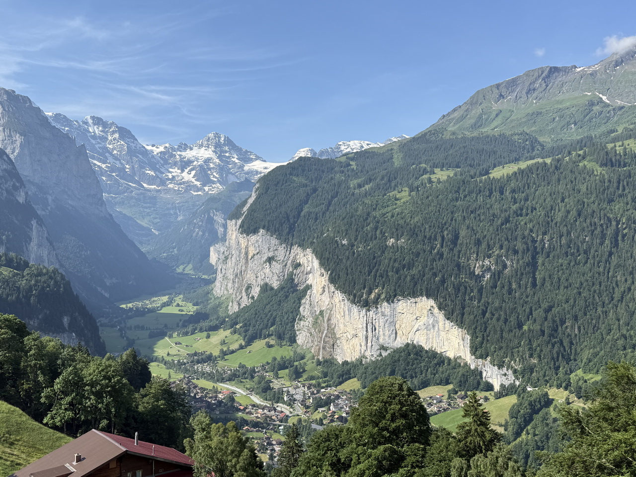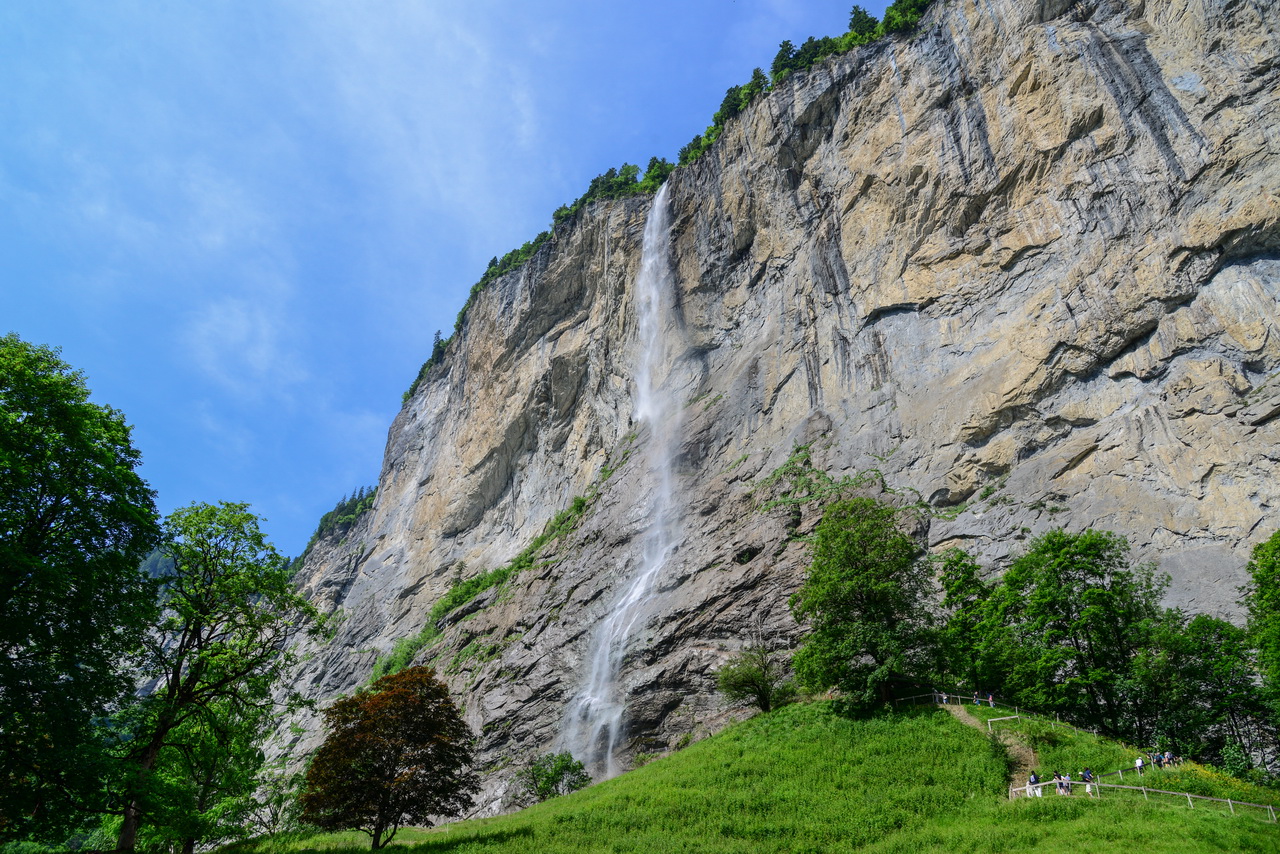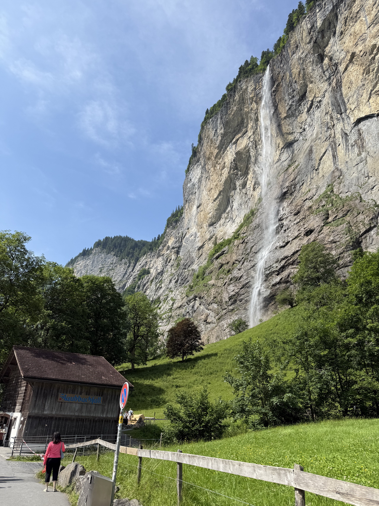 從茵特拉肯開來的火車,只開到小夏戴克,我們要搭這班開回茵特拉肯的車,計劃在Lauterbrunnen 下車。Lauterbrunnen 有瀑布小鎮之稱,據統計72個大大小小瀑布。走出車站,照著導航找據稱很棒的瀑布觀景點,可是沒找著。不找了,直接走到離市區最近的地標瀑布 Staubbachfall ,和近處另一瀑布 。今天的Staubbachfal瀑布的水並不是非常大,氣勢略顯不足,顯得十分嬌柔。步行走完全程山谷步道,是我的理想目標,但是大家腳程有差異,這一段走了一公里多,夠了。往回走回火車站,轉往 Murren 。