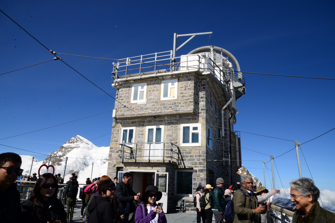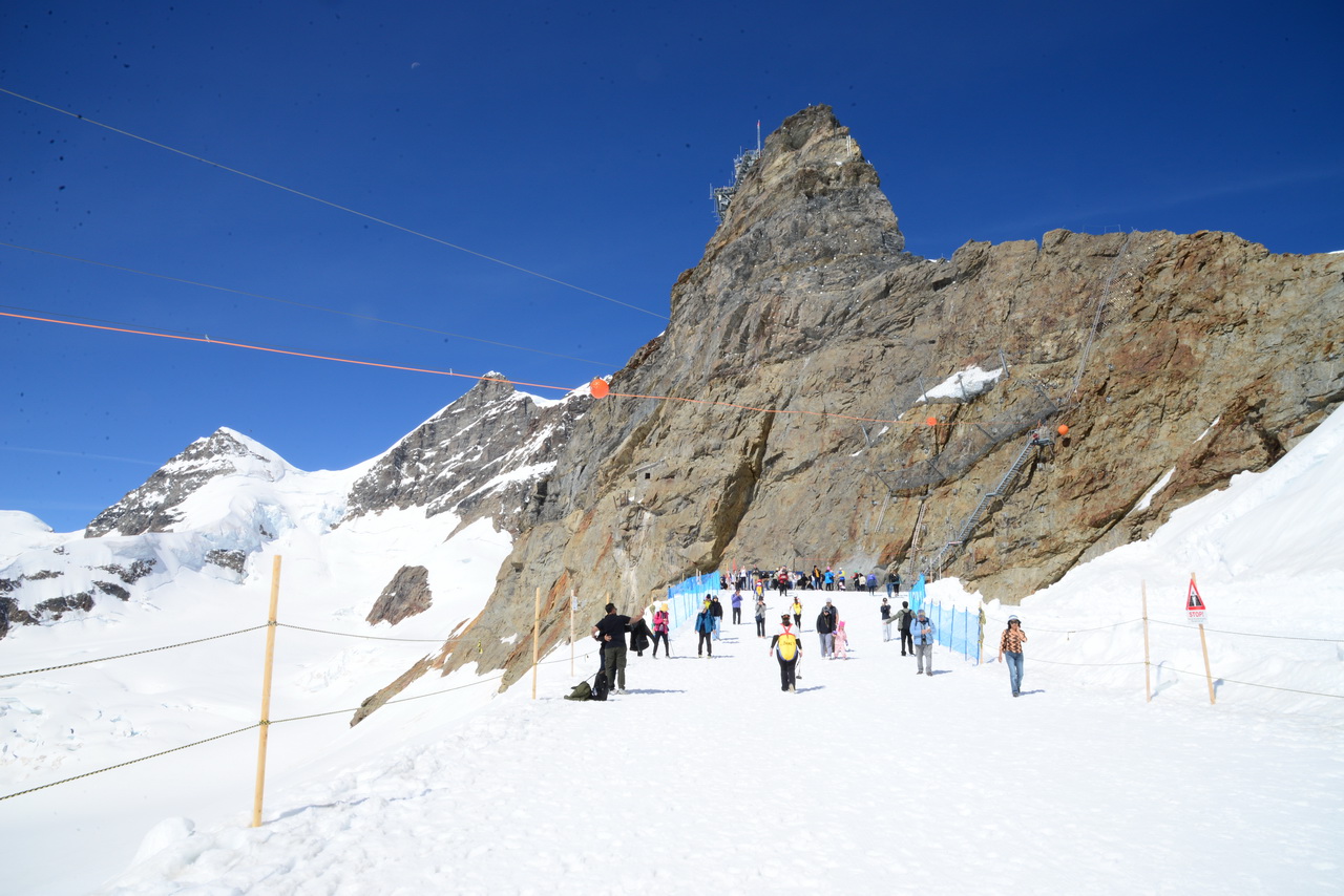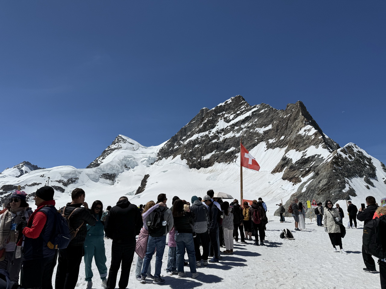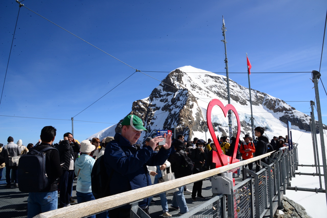 最後一個景點是走出主建築物的戶外,從這裡看到的才是少女峰。此時的賞景廣場上,人山人海,在一支掛有瑞士國旗旗杆前,排了一隊長龍,都是為了要在旗杆下,留下一張一手拉開旗杆下方另一面瑞士國旗的照片。我們不流行這個,找個比較空曠的地方,背景包含了少女峰和瑞士國旗的畫面即可。