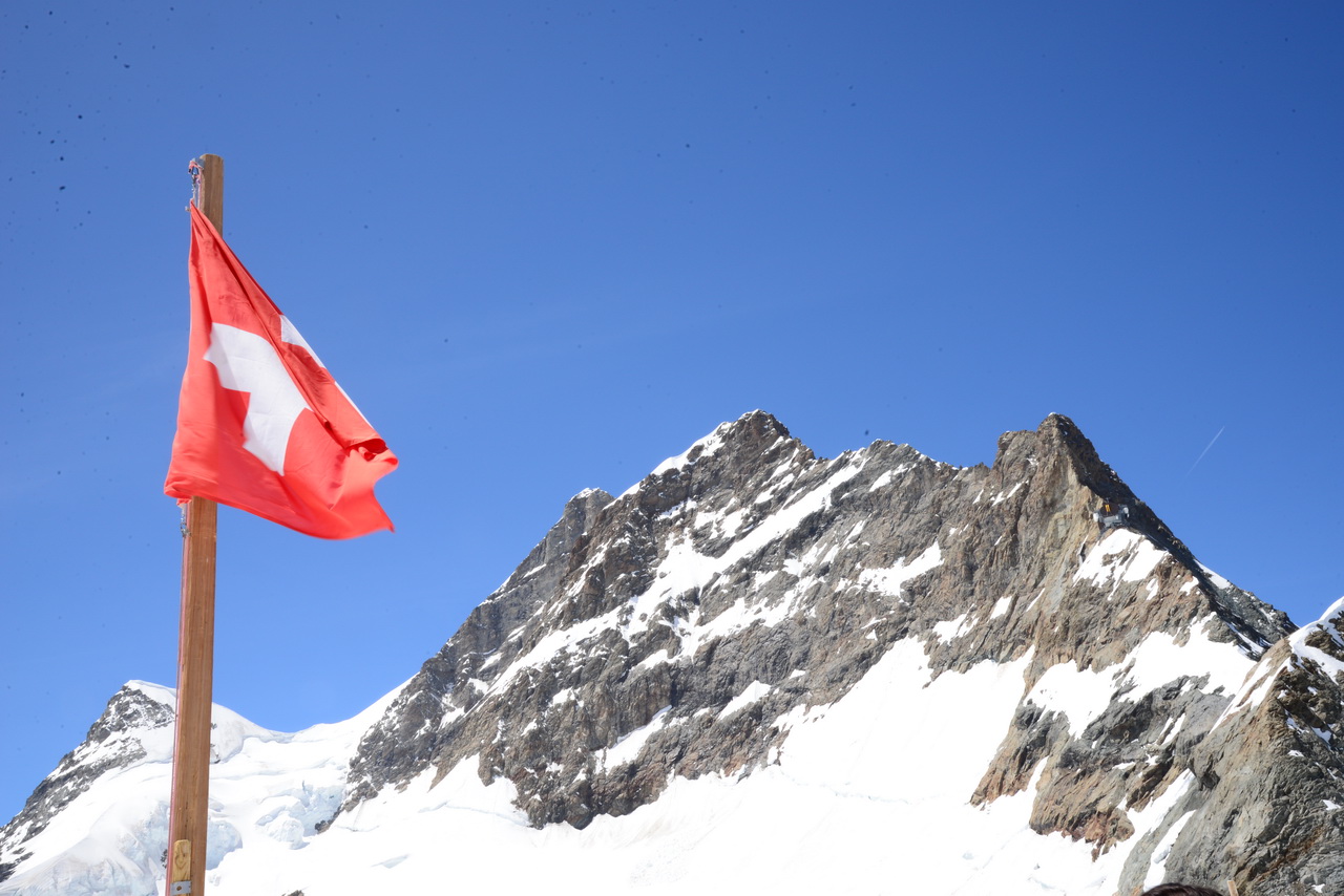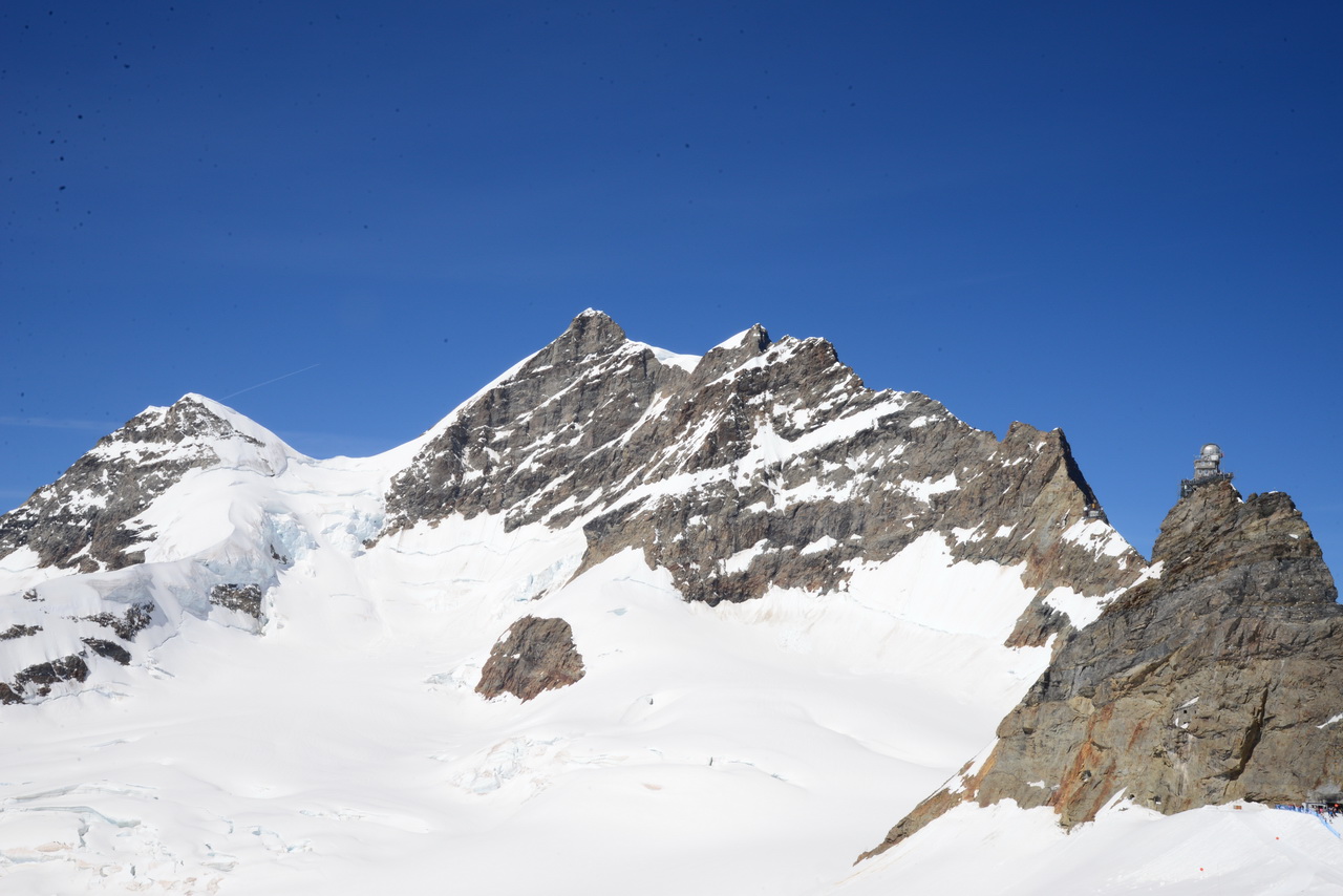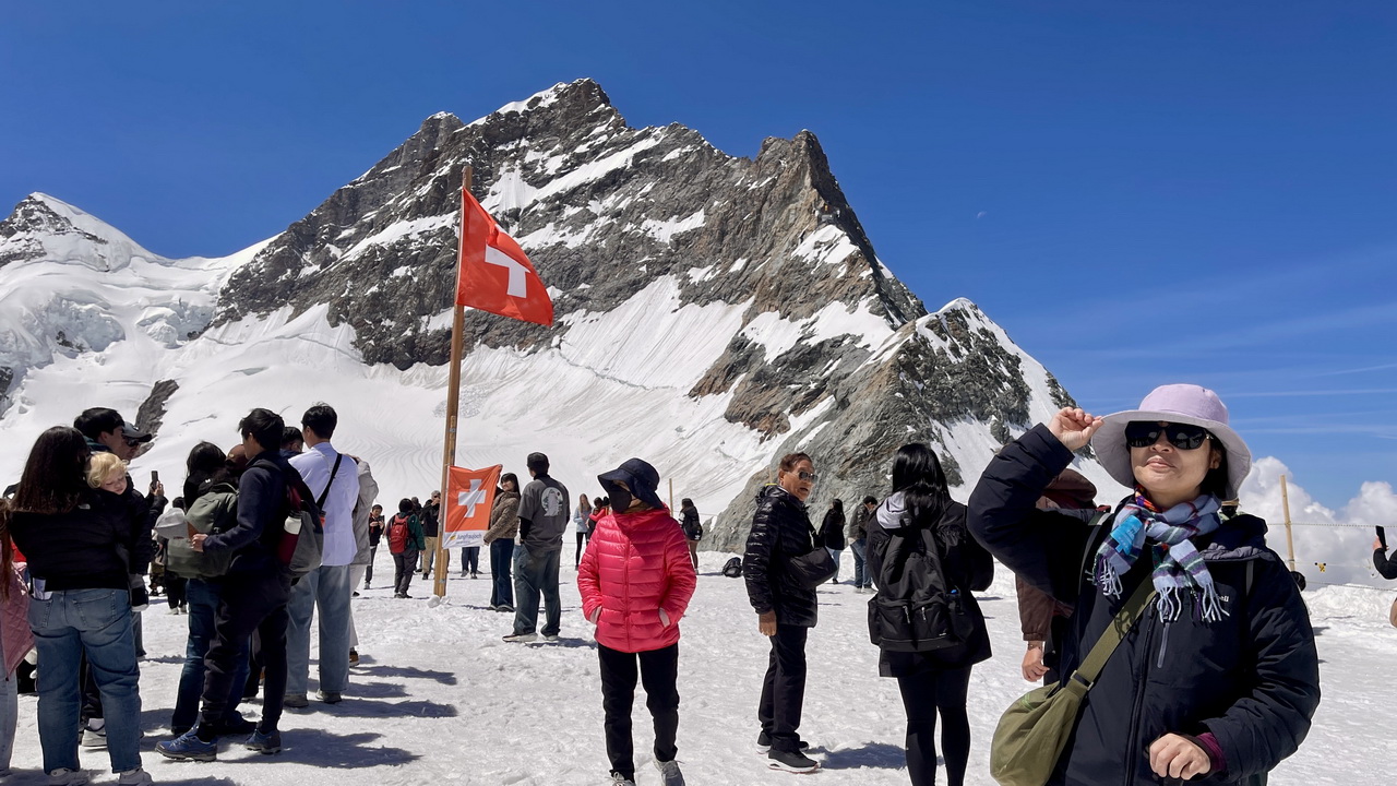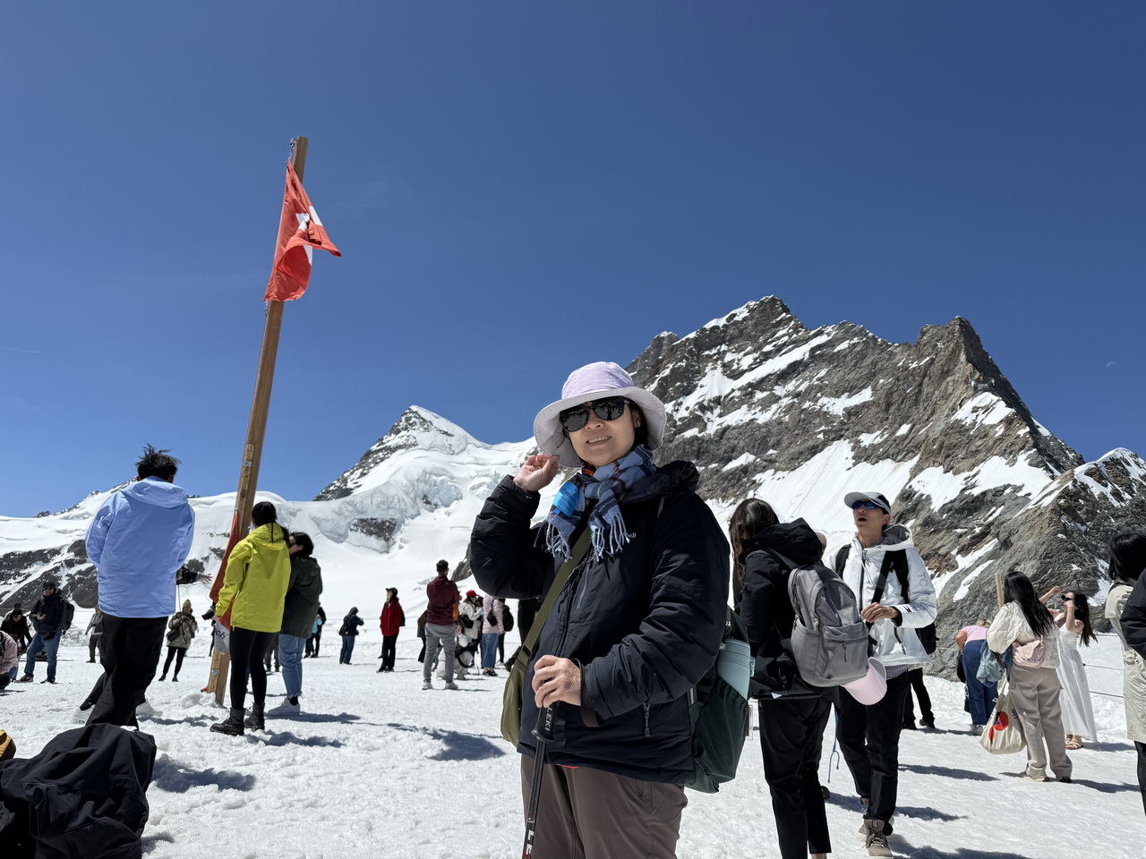 最後一個景點是走出主建築物的戶外,從這裡看到的才是少女峰。此時的賞景廣場上,人山人海,在一支掛有瑞士國旗旗杆前,排了一隊長龍,都是為了要在旗杆下,留下一張一手拉開旗杆下方另一面瑞士國旗的照片。我們不流行這個,找個比較空曠的地方,背景包含了少女峰和瑞士國旗的畫面即可。