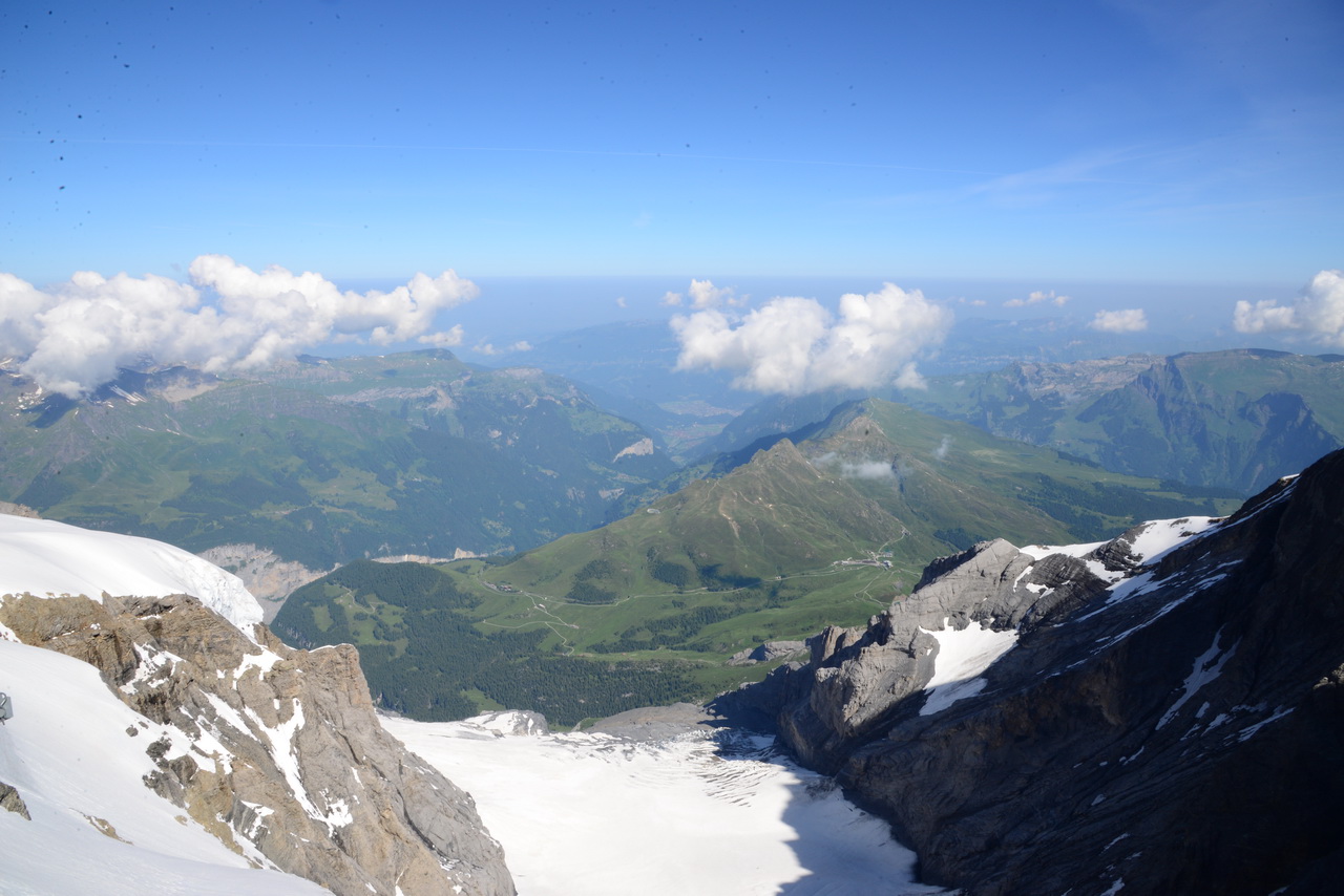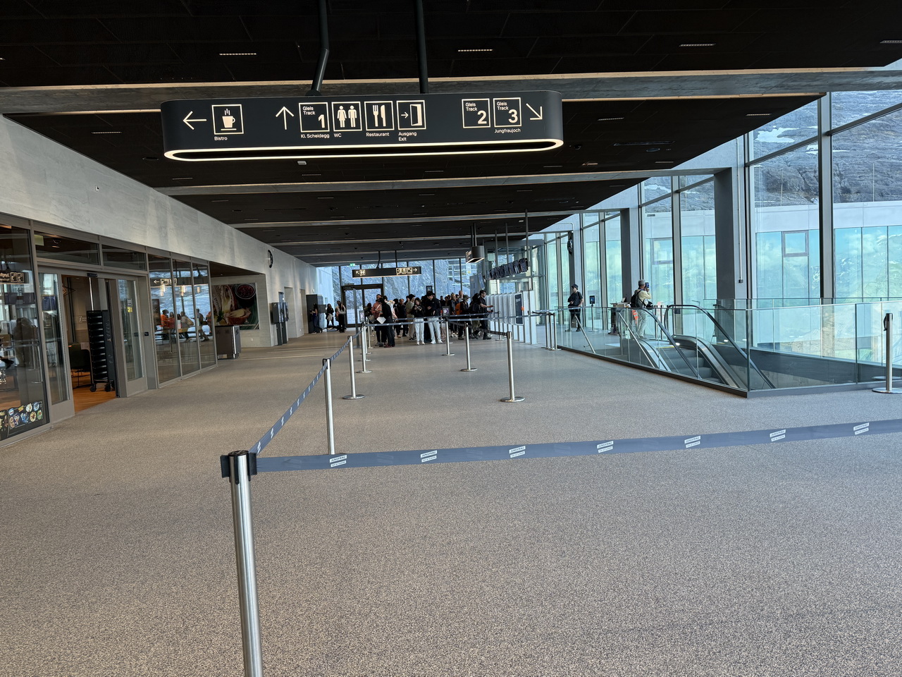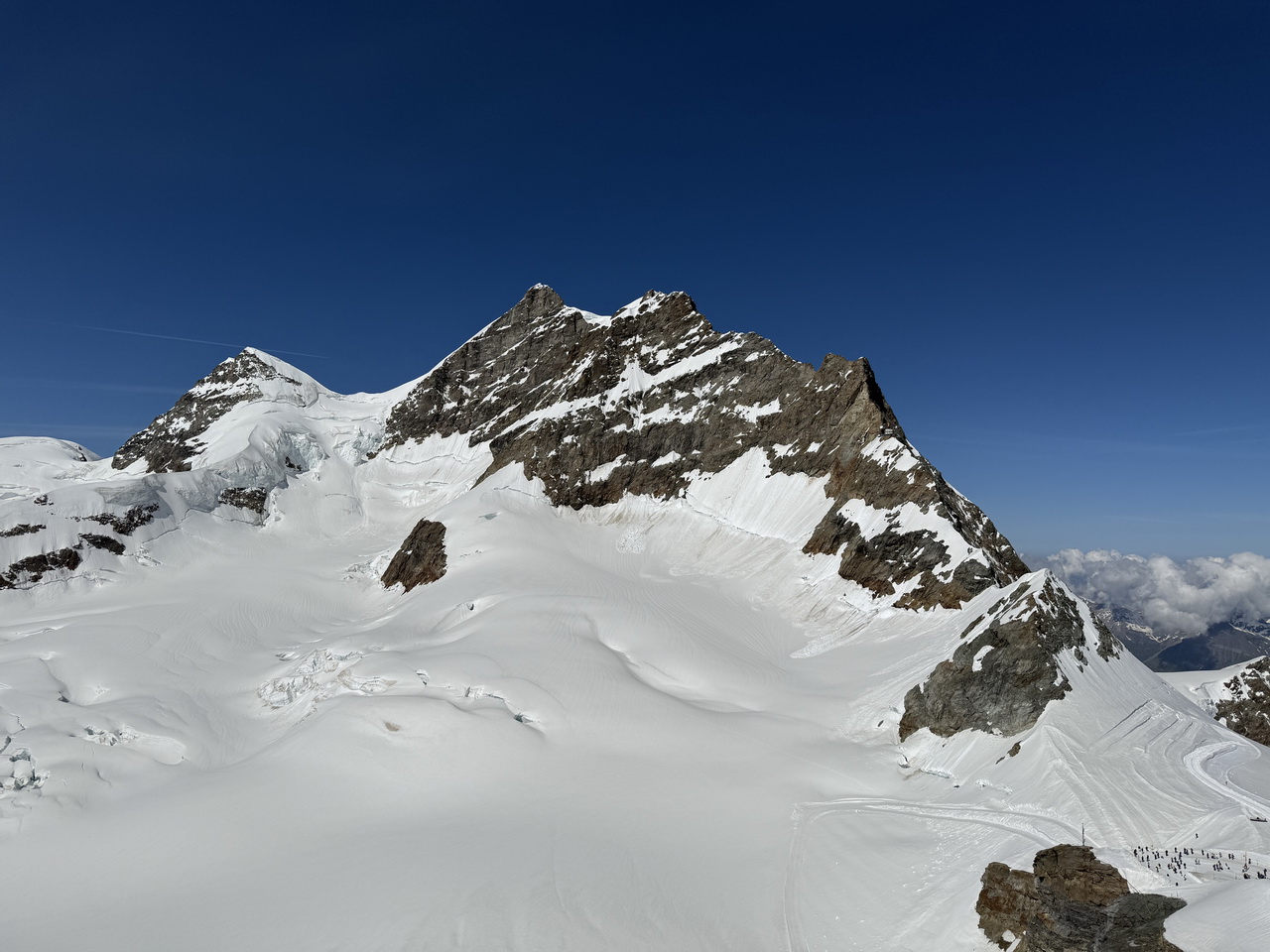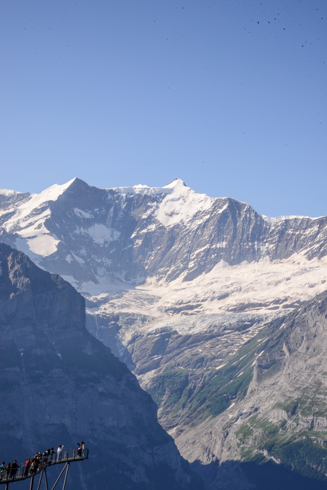 最後一個景點是走出主建築物的戶外,從這裡看到的才是少女峰。此時的賞景廣場上,人山人海,在一支掛有瑞士國旗旗杆前,排了一隊長龍,都是為了要在旗杆下,留下一張一手拉開旗杆下方另一面瑞士國旗的照片。我們不流行這個,找個比較空曠的地方,背景包含了少女峰和瑞士國旗的畫面即可。