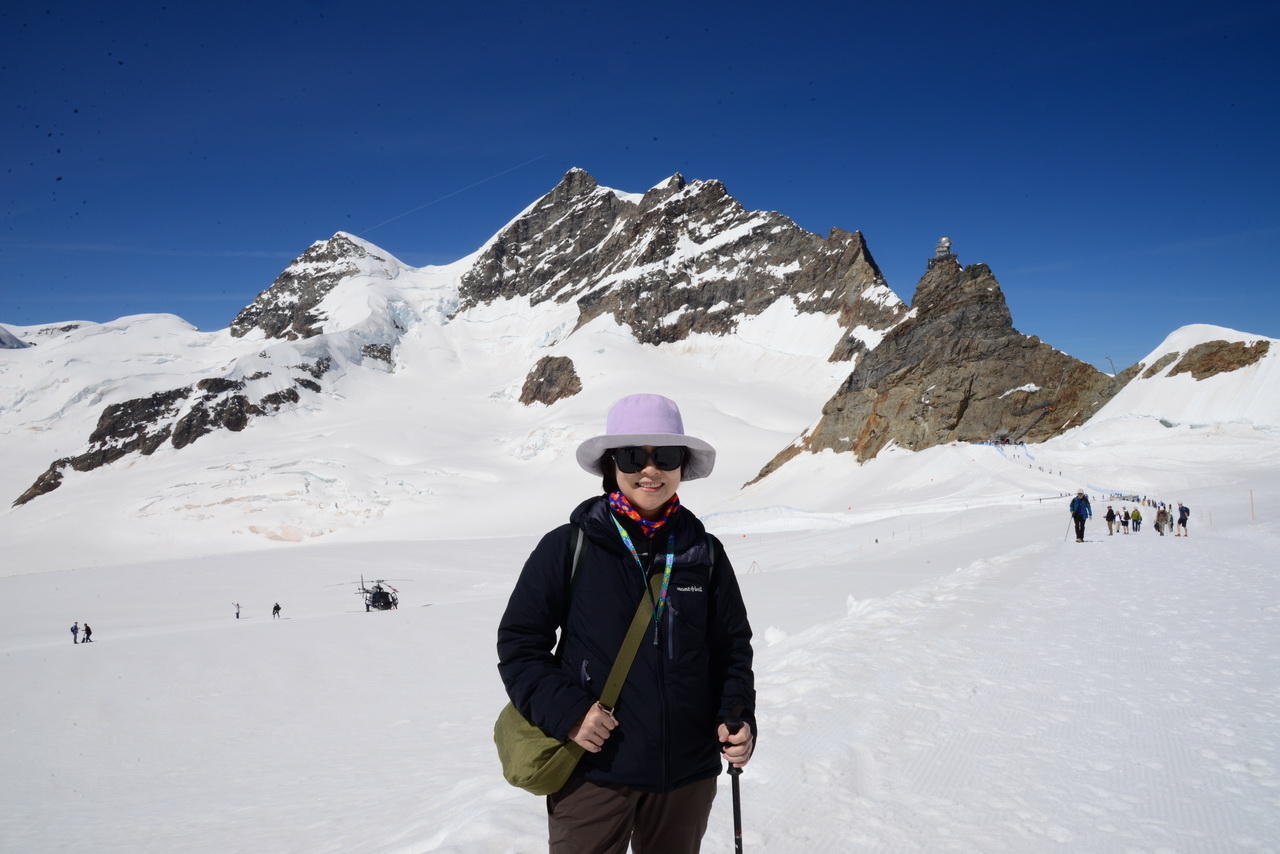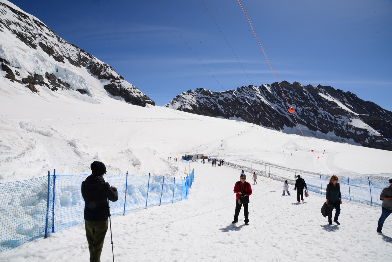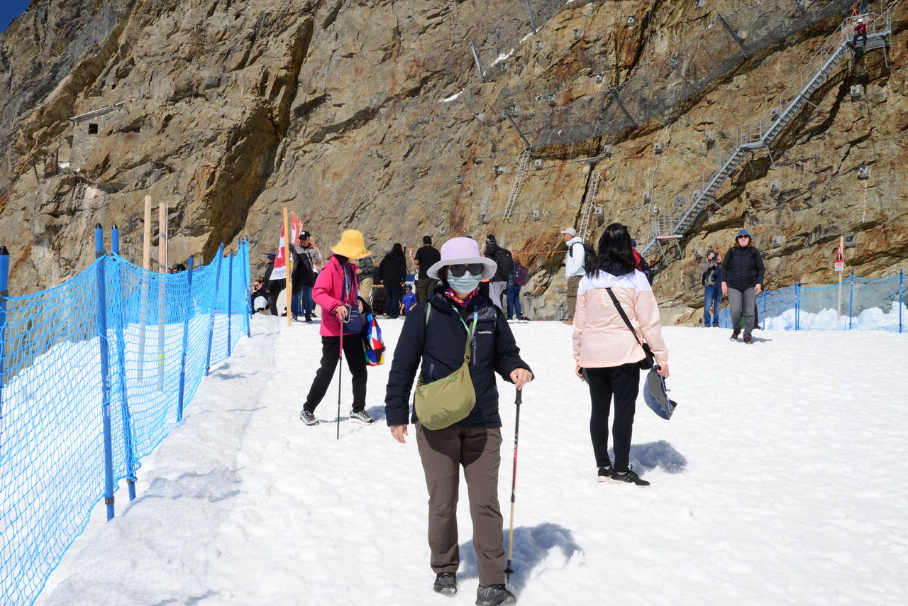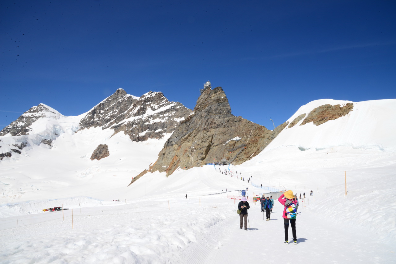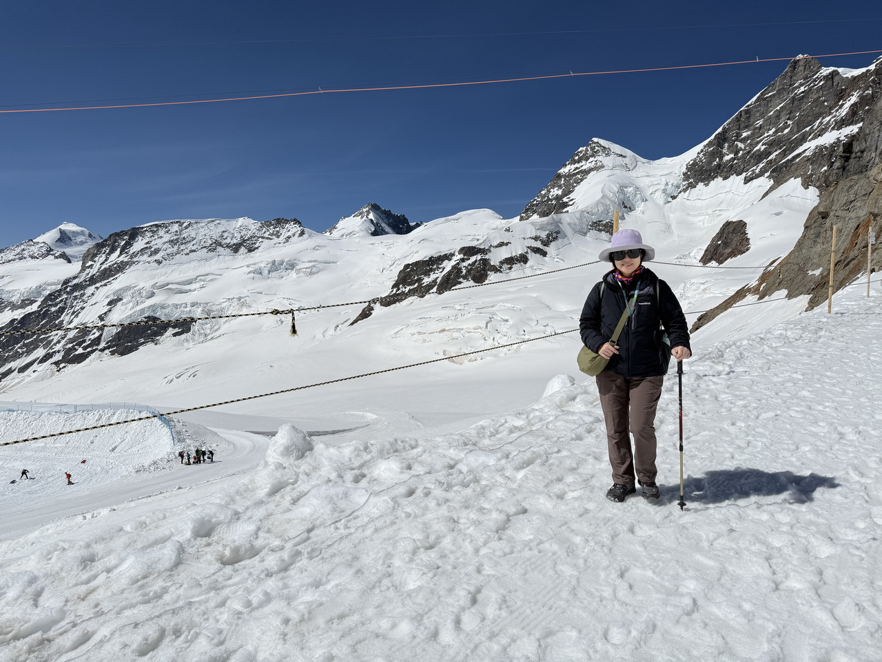 到少女峰車站,依照參觀順序先上觀景台,眺望四周,首先映入眼簾的是阿雷奇冰河。冰河地處很高的山上,還沒有受到土石流的覆蓋,還呈現閃閃發光的白色。搭電梯下樓,通過隧道走到空曠的雪地,雪地步道經雪車整理過,沒有穿冰爪也沒問題。步道前方左側近距離觀賞保護少女的僧侶峰,續往前方可以走到 Monchsioch Hunt 。我們沒有時間走到那裡,走到自己想回頭時就往回走,大家經歷了一次自由自在的雪地步行。