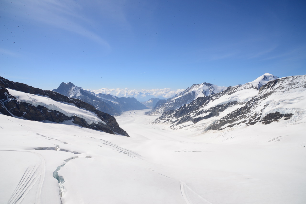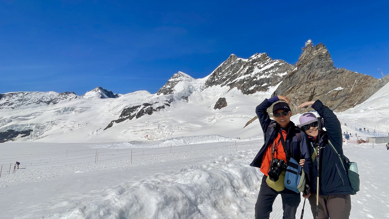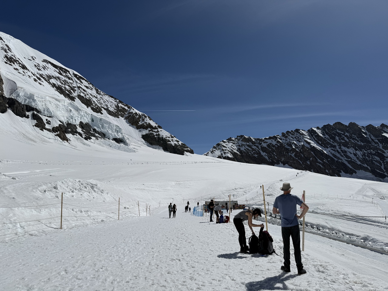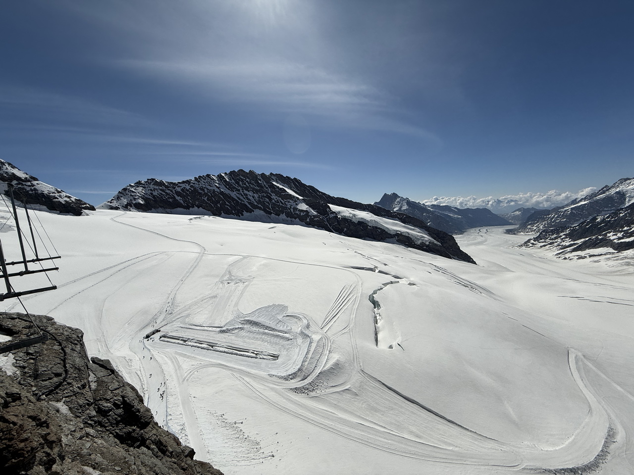 到少女峰車站,依照參觀順序先上觀景台,眺望四周,首先映入眼簾的是阿雷奇冰河。冰河地處很高的山上,還沒有受到土石流的覆蓋,還呈現閃閃發光的白色。搭電梯下樓,通過隧道走到空曠的雪地,雪地步道經雪車整理過,沒有穿冰爪也沒問題。步道前方左側近距離觀賞保護少女的僧侶峰,續往前方可以走到 Monchsioch Hunt 。我們沒有時間走到那裡,走到自己想回頭時就往回走,大家經歷了一次自由自在的雪地步行。