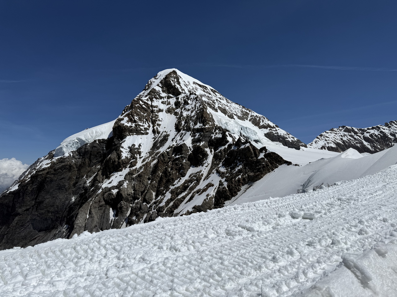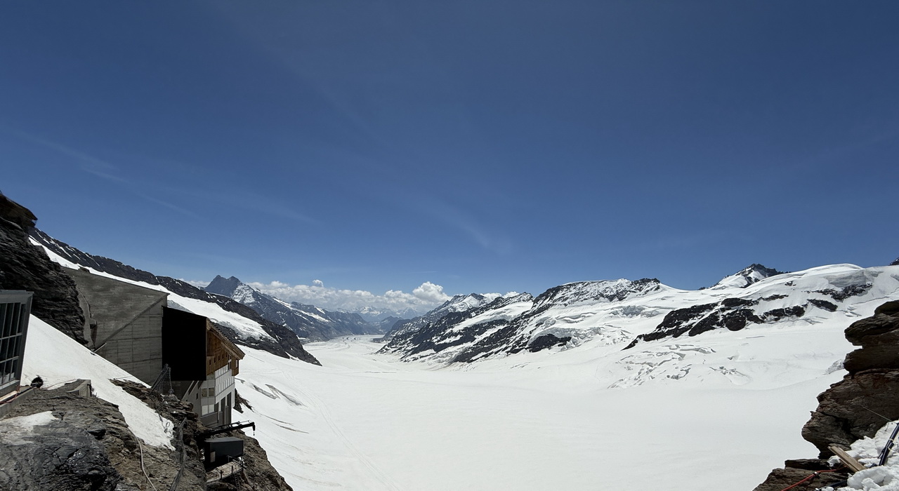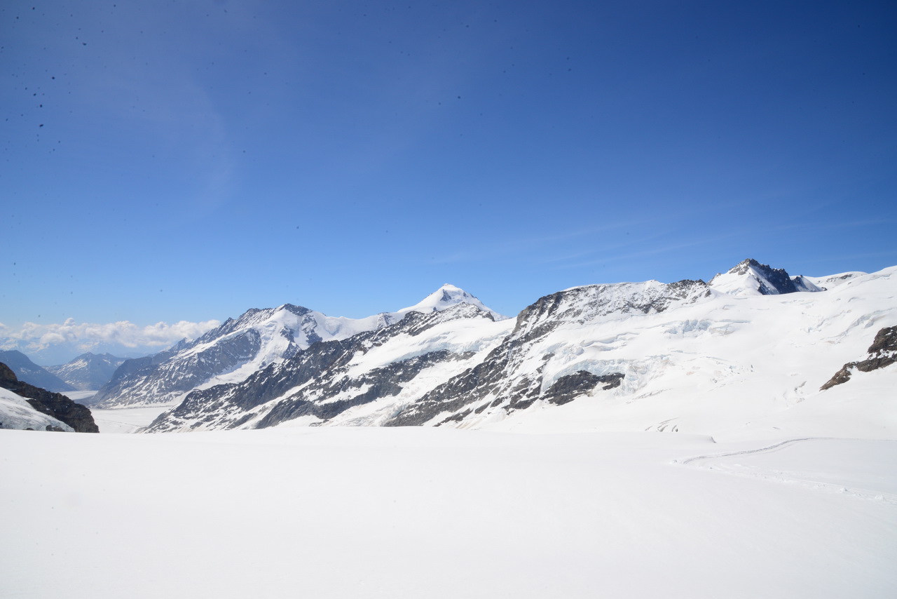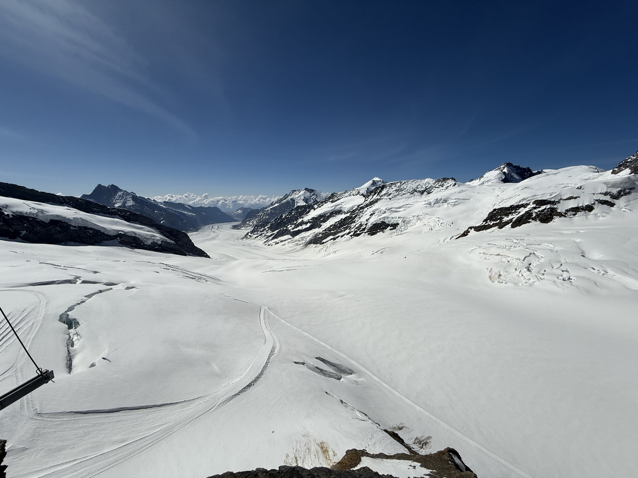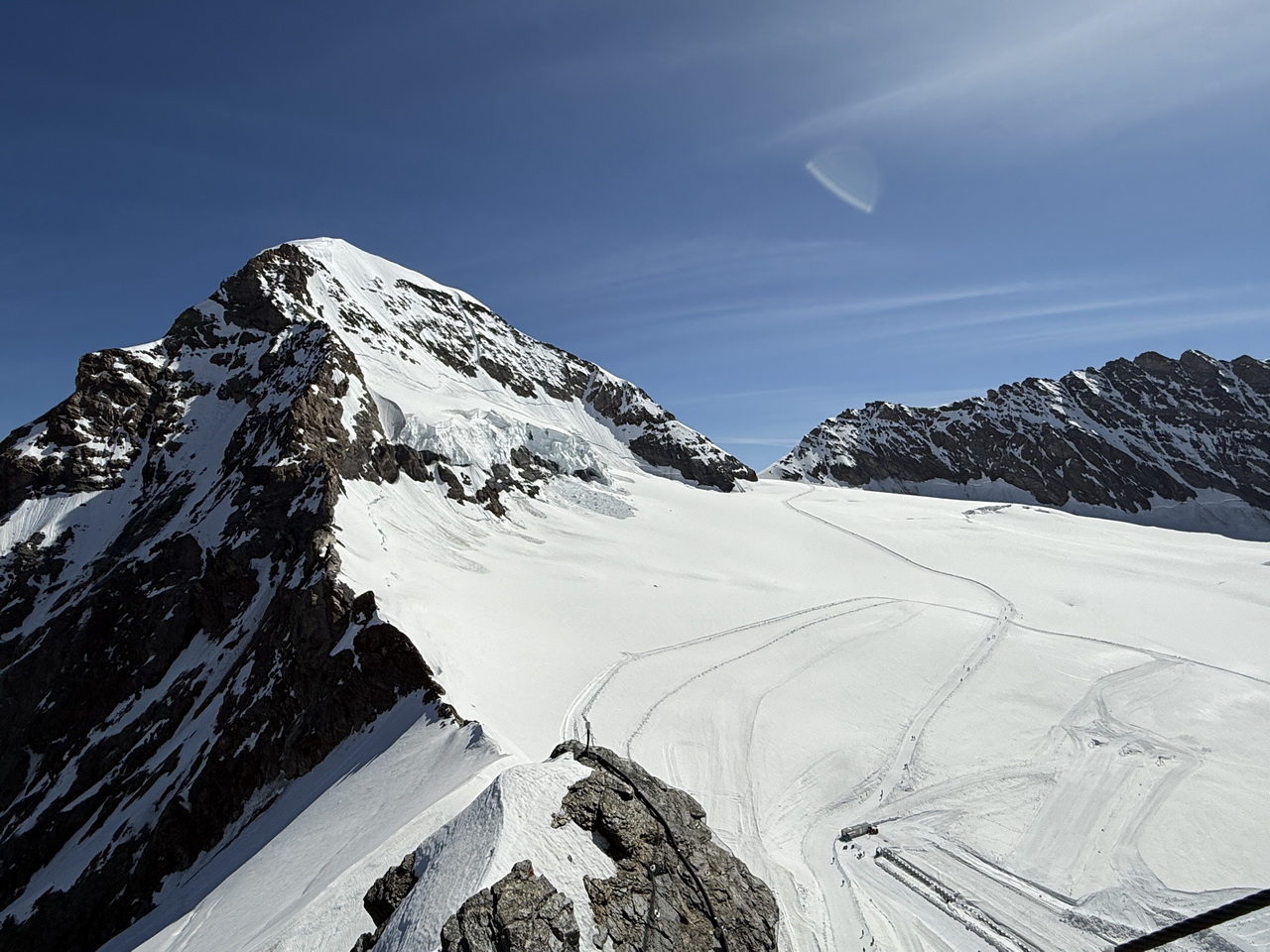 到少女峰車站,依照參觀順序先上觀景台,眺望四周,首先映入眼簾的是阿雷奇冰河。冰河地處很高的山上,還沒有受到土石流的覆蓋,還呈現閃閃發光的白色。搭電梯下樓,通過隧道走到空曠的雪地,雪地步道經雪車整理過,沒有穿冰爪也沒問題。步道前方左側近距離觀賞保護少女的僧侶峰,續往前方可以走到 Monchsioch Hunt 。我們沒有時間走到那裡,走到自己想回頭時就往回走,大家經歷了一次自由自在的雪地步行。