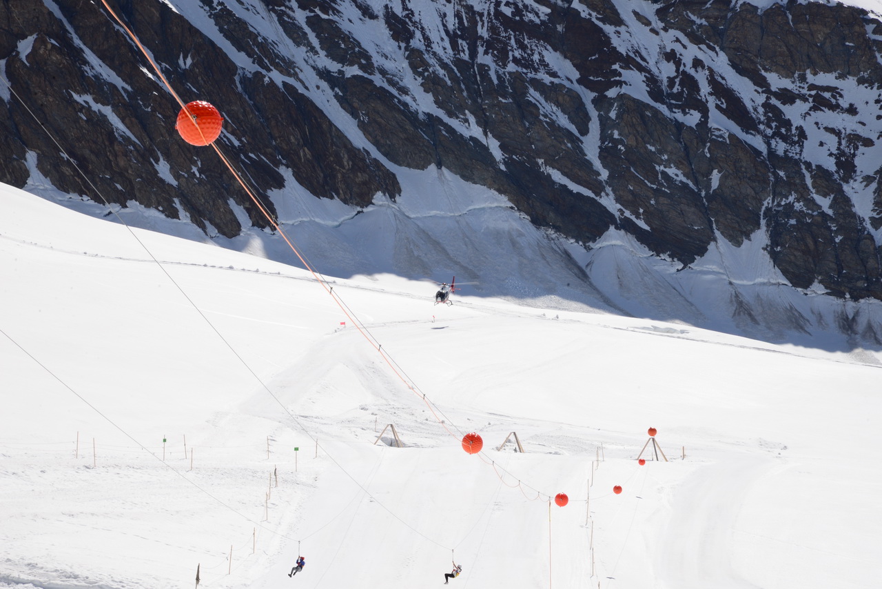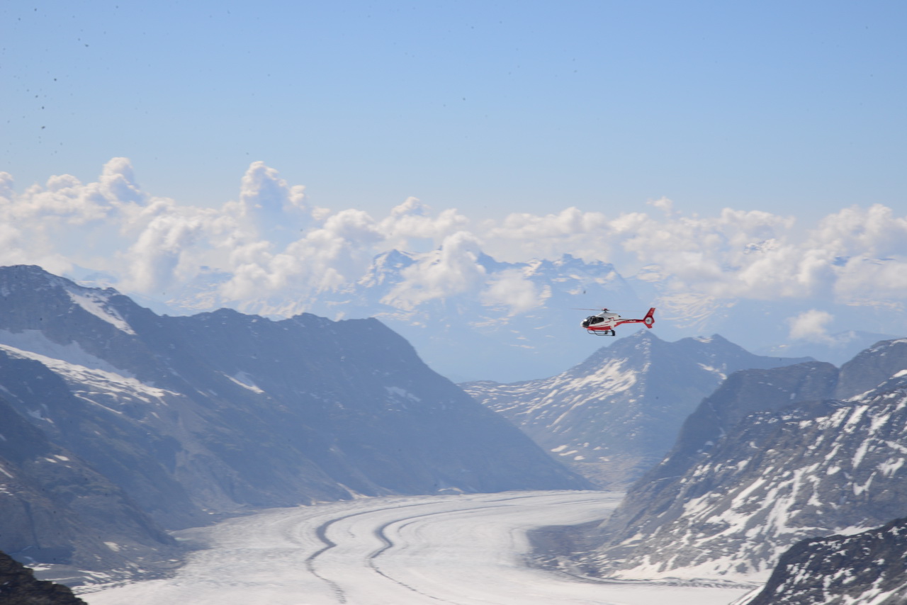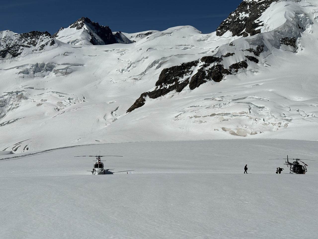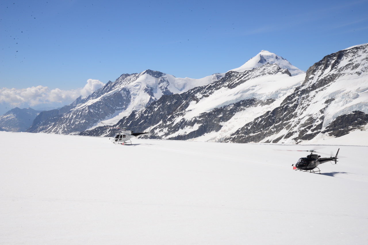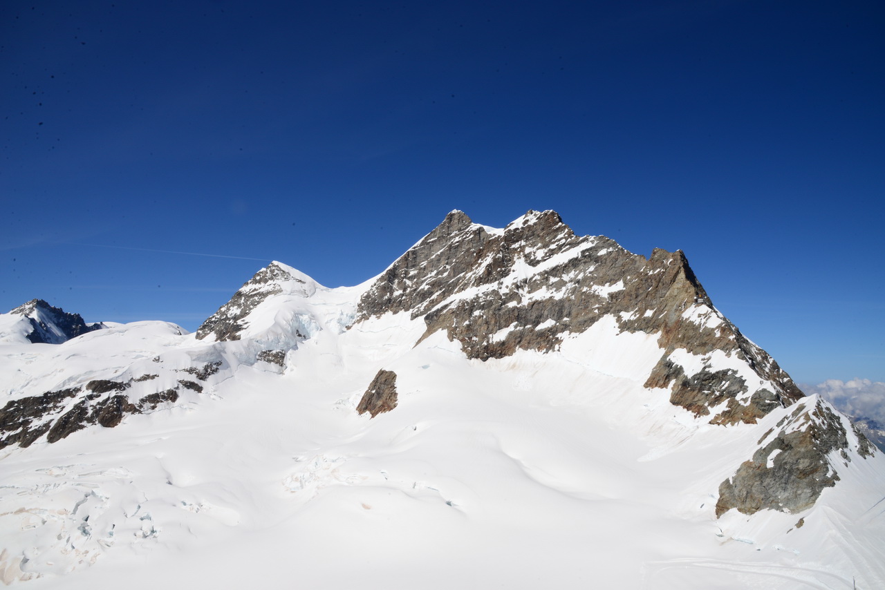 到少女峰車站,依照參觀順序先上觀景台,眺望四周,首先映入眼簾的是阿雷奇冰河。冰河地處很高的山上,還沒有受到土石流的覆蓋,還呈現閃閃發光的白色。搭電梯下樓,通過隧道走到空曠的雪地,雪地步道經雪車整理過,沒有穿冰爪也沒問題。步道前方左側近距離觀賞保護少女的僧侶峰,續往前方可以走到 Monchsioch Hunt 。我們沒有時間走到那裡,走到自己想回頭時就往回走,大家經歷了一次自由自在的雪地步行。
