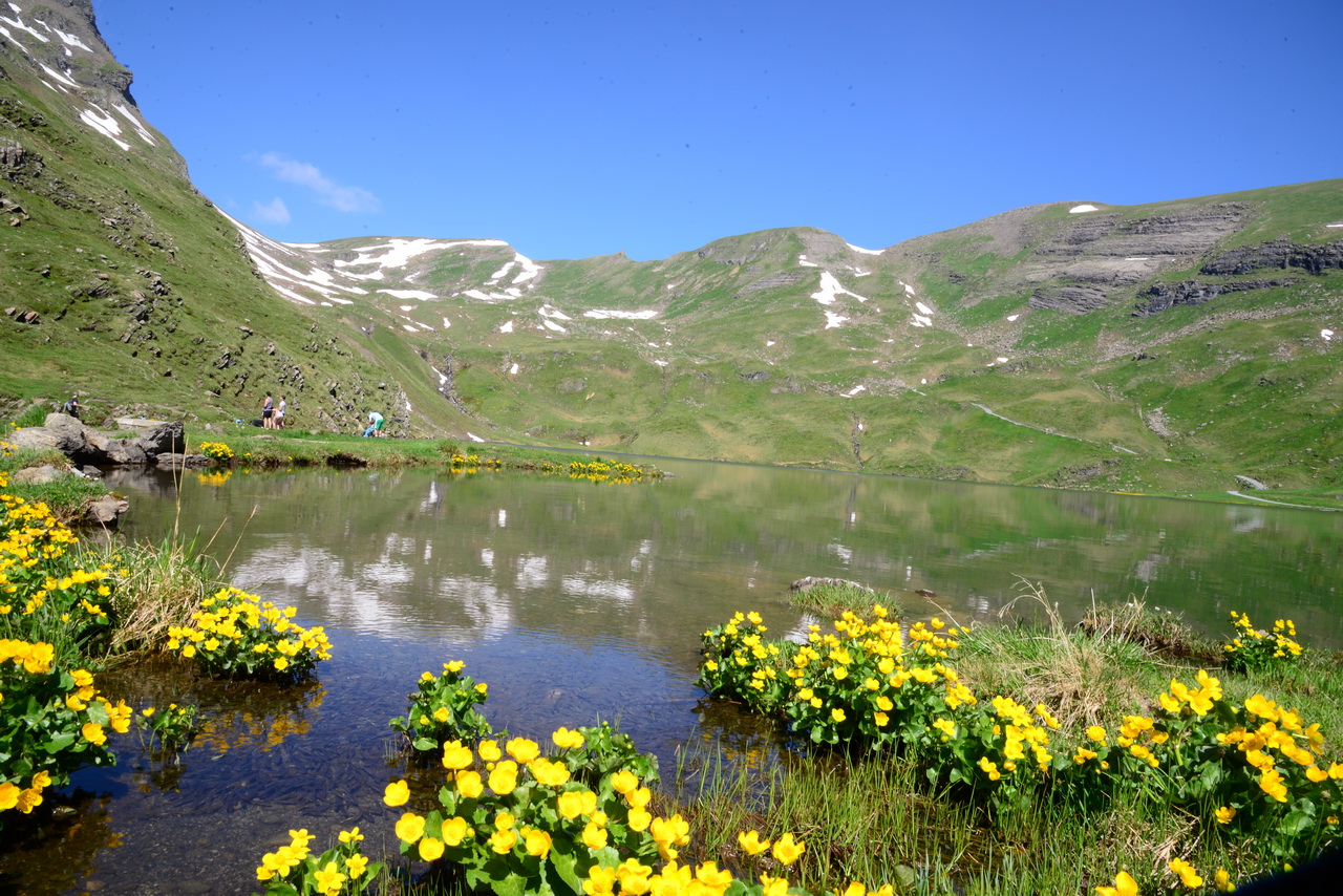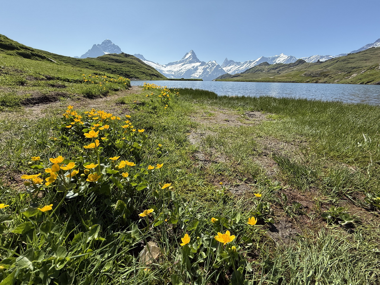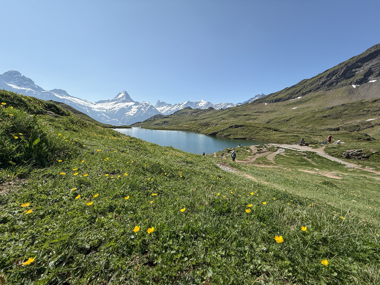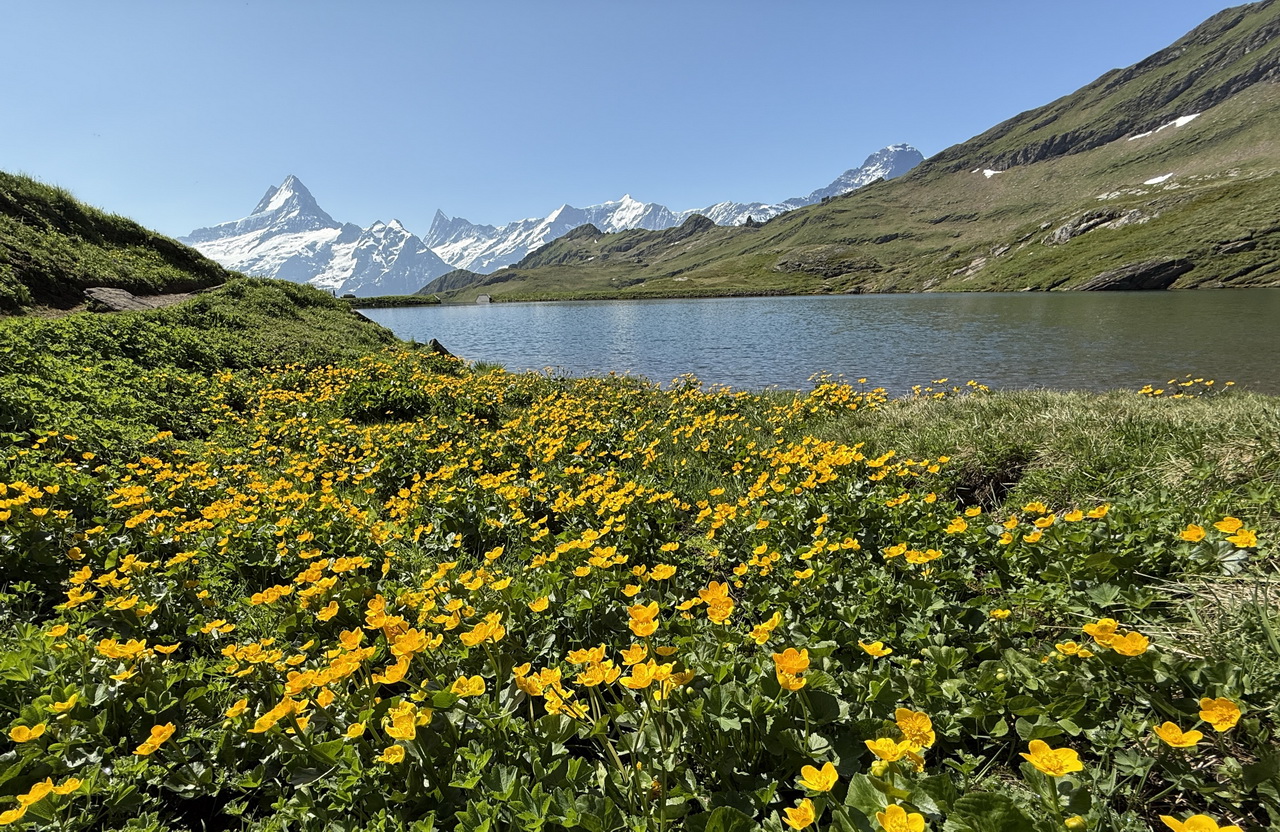 我們的重點是從纜車站走到 Bachalpsee 的健行,步道沿途寬敞,起伏不大,步道旁野花盛開,走來十分輕鬆愉快。這裡的湖有兩個,另一個我不知道名稱是什麼。湖邊的黃色小花開得好燦爛,蹲下來把黃色小花、湖水、山的倒影及遠山拍下來,好美。十一點多了,拿出早上兩位三星主廚準備的午餐,坐在湖邊板凳享用午餐,還有什麼樣的午餐能勝過這一餐。
