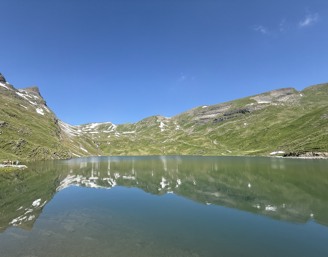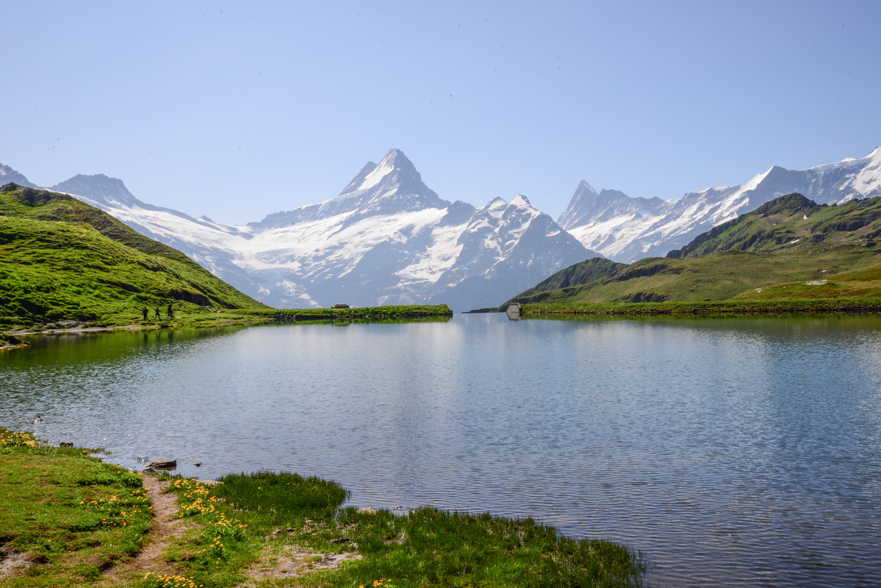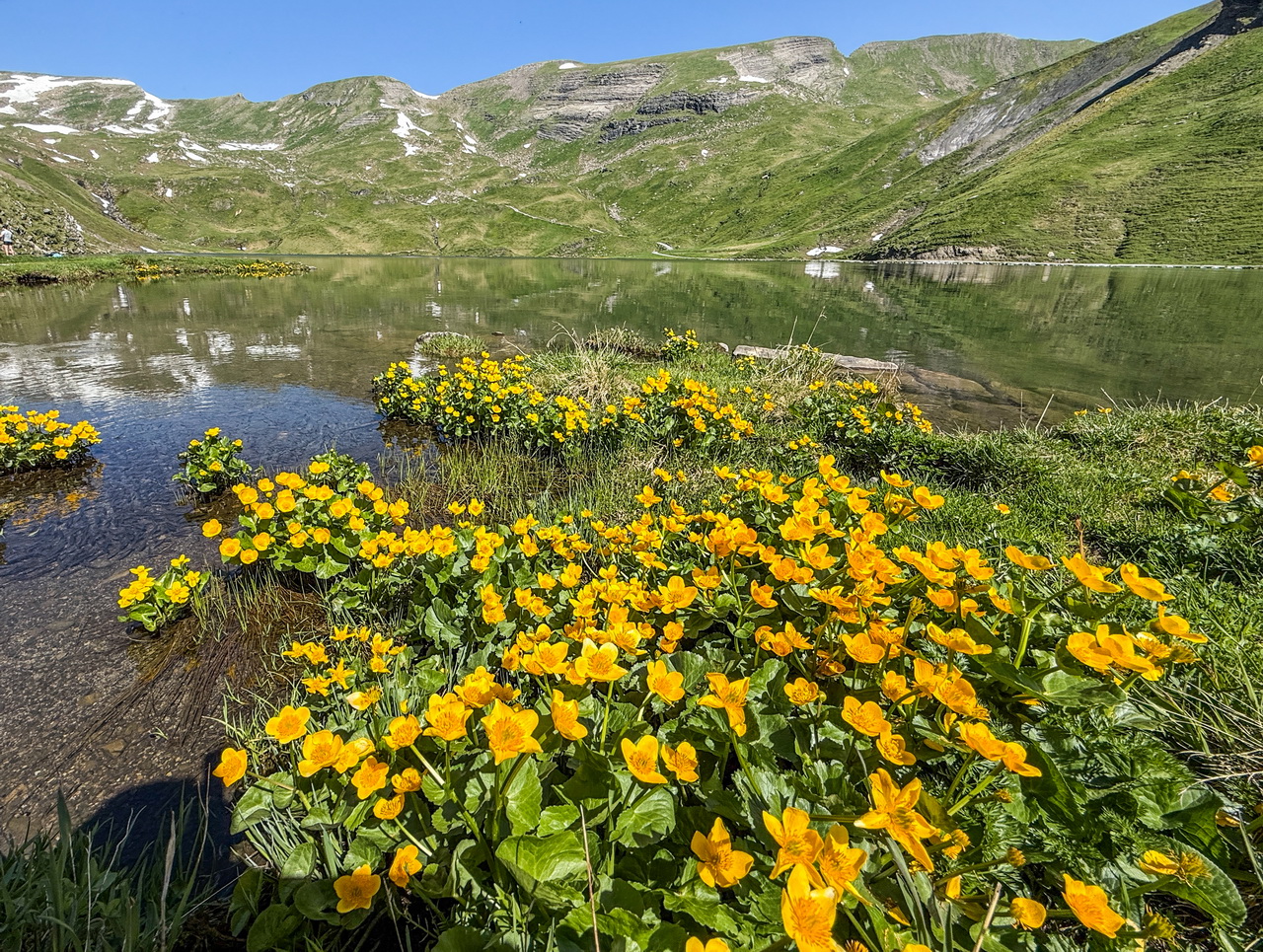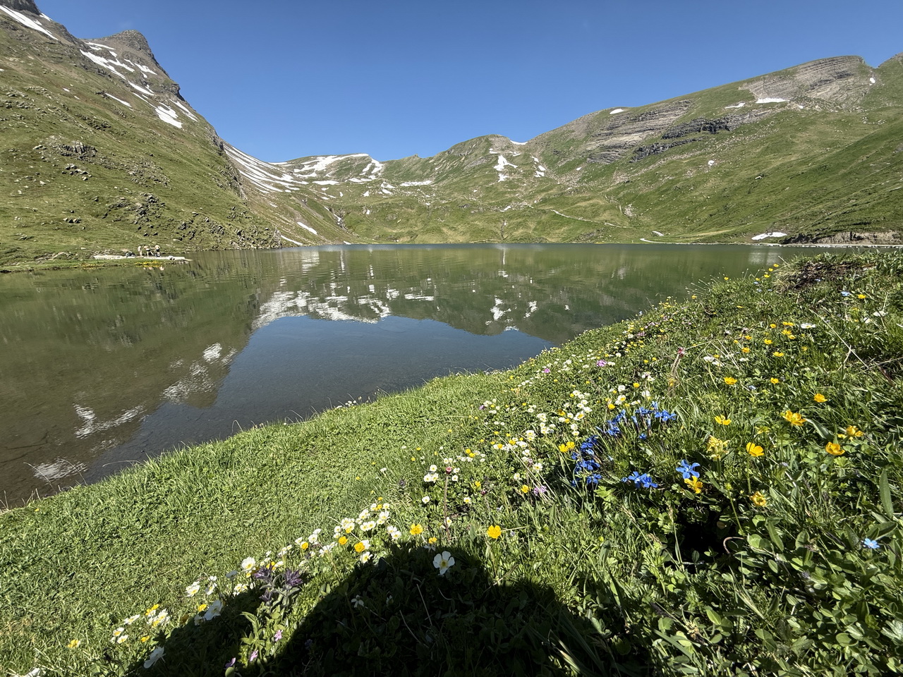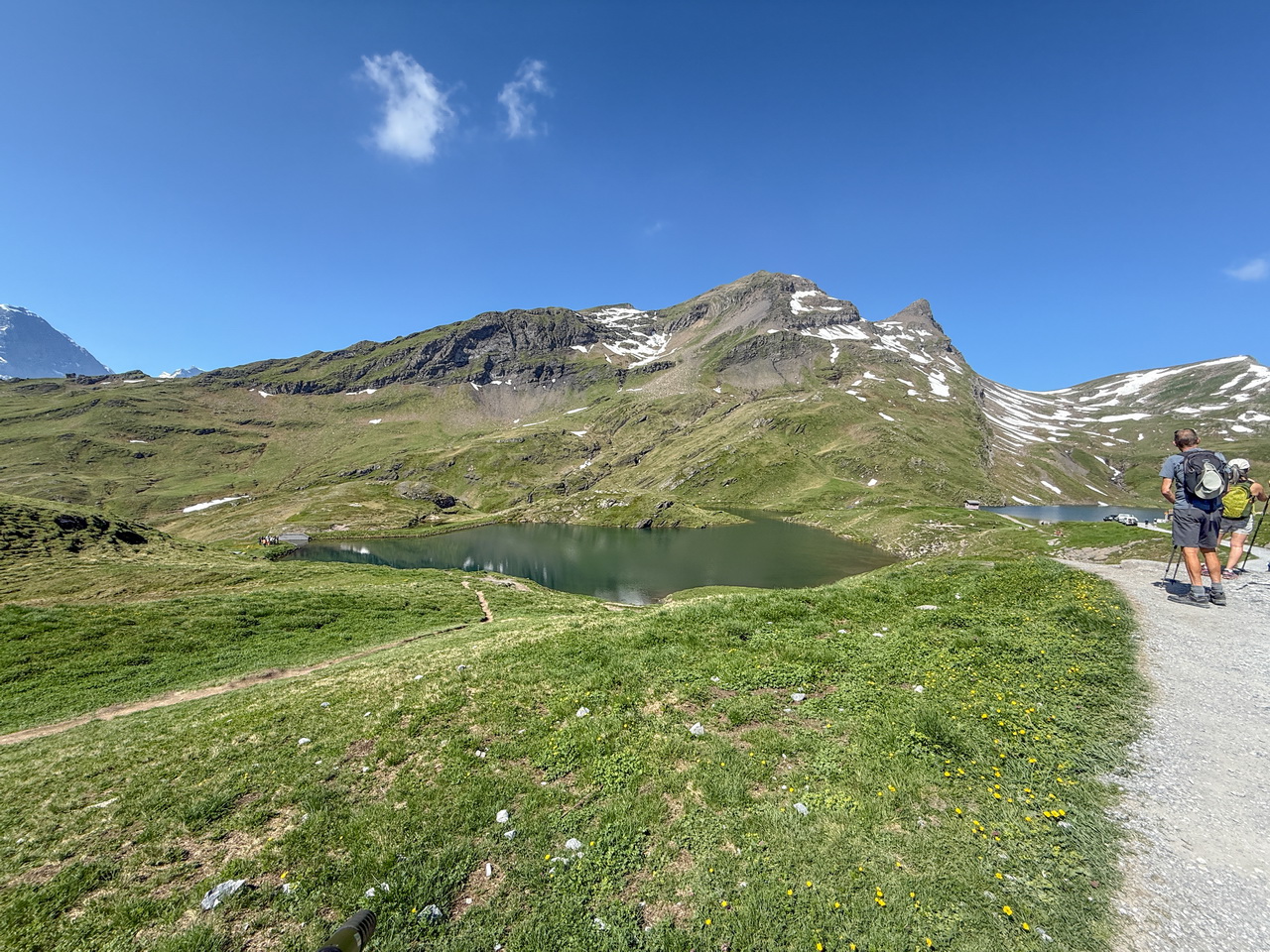 我們的重點是從纜車站走到 Bachalpsee 的健行,步道沿途寬敞,起伏不大,步道旁野花盛開,走來十分輕鬆愉快。這裡的湖有兩個,另一個我不知道名稱是什麼。湖邊的黃色小花開得好燦爛,蹲下來把黃色小花、湖水、山的倒影及遠山拍下來,好美。十一點多了,拿出早上兩位三星主廚準備的午餐,坐在湖邊板凳享用午餐,還有什麼樣的午餐能勝過這一餐。