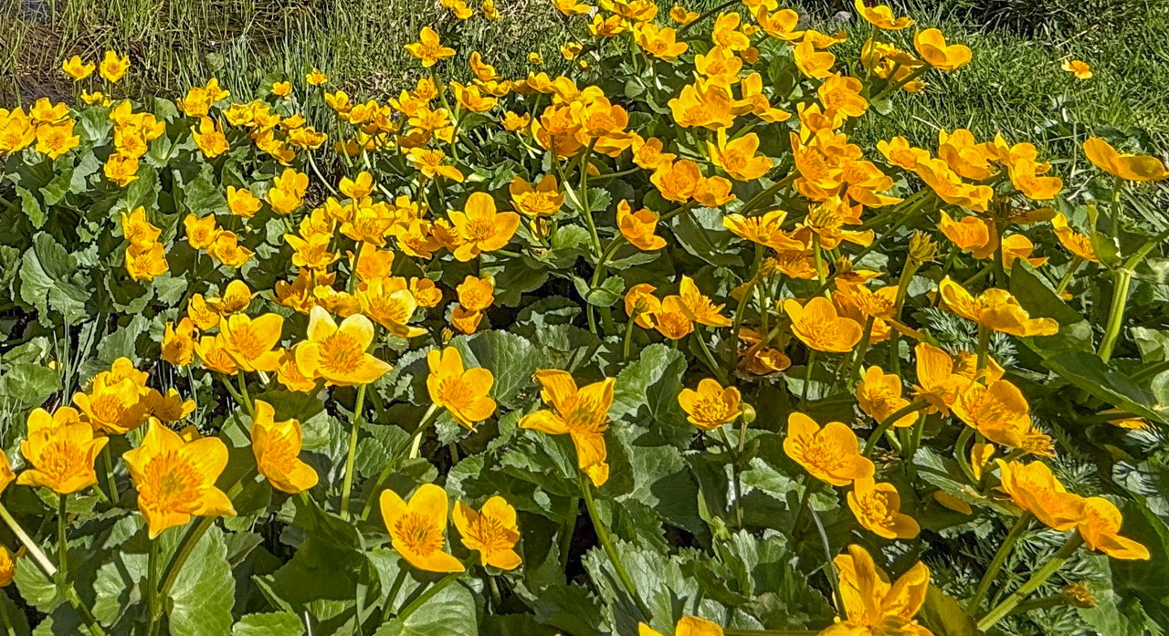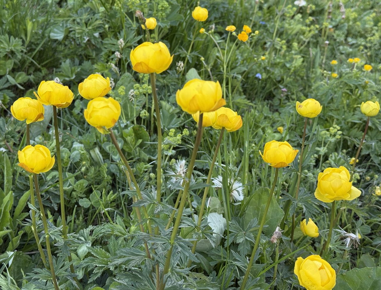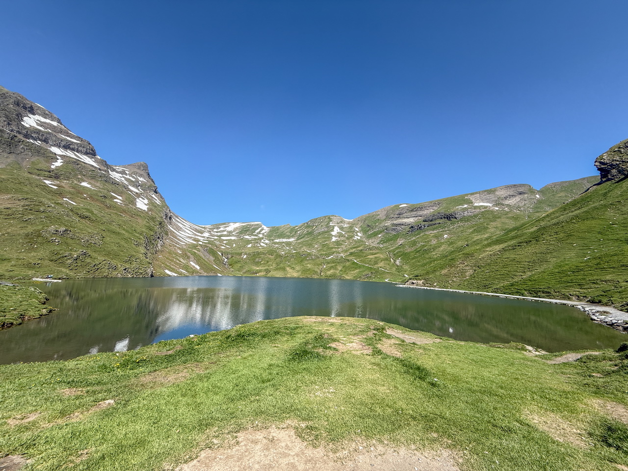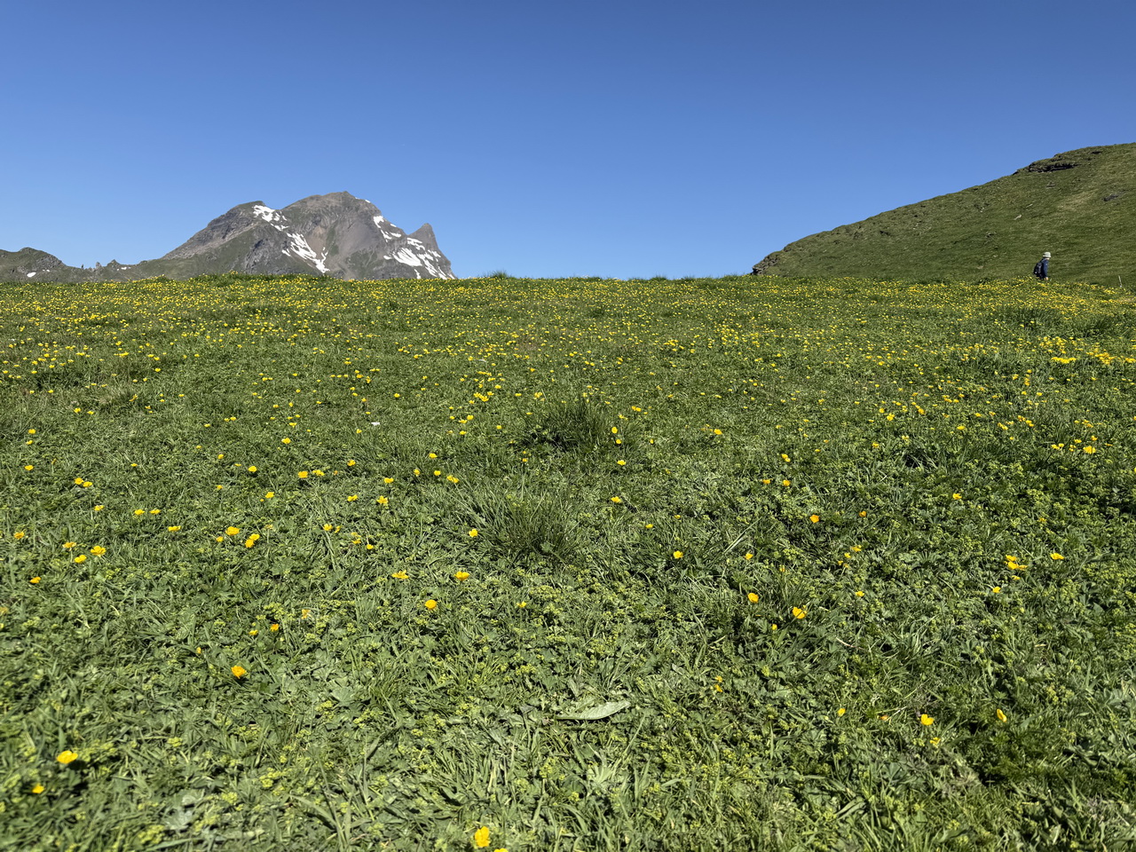 我們的重點是從纜車站走到 Bachalpsee 的健行,步道沿途寬敞,起伏不大,步道旁野花盛開,走來十分輕鬆愉快。這裡的湖有兩個,另一個我不知道名稱是什麼。湖邊的黃色小花開得好燦爛,蹲下來把黃色小花、湖水、山的倒影及遠山拍下來,好美。十一點多了,拿出早上兩位三星主廚準備的午餐,坐在湖邊板凳享用午餐,還有什麼樣的午餐能勝過這一餐。