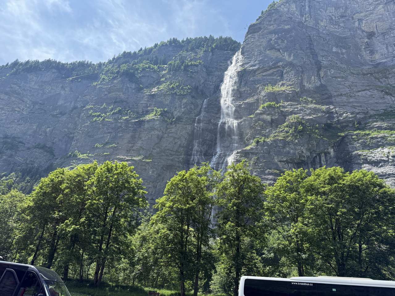 Murren 的纜車站有三處,都不在一起,不過相距都不遠。想去看看往 Stechelberg 的纜車票會不會很貴,價錢可以接受就搭纜車下山。這條纜車線的坡度非常陡,下降時看來近乎是垂直的角度(當然是不可能),是一次全新體驗。纜車站旁有公車站,等公車時看到對面山壁有一瀑布,是 Murrenbachfall 水量比之前近市區的大許多。按我最原始的行程是希望從市區健行到這裡,再從這裡搭纜車上 Murren ,和今天行程反向而行。搭上公車仔細觀察兩側山壁,看看能不能找到其他的瀑布。直到下車時只看到另外一個瀑布,加總今天只看到四個瀑布,離72也未免太多了。