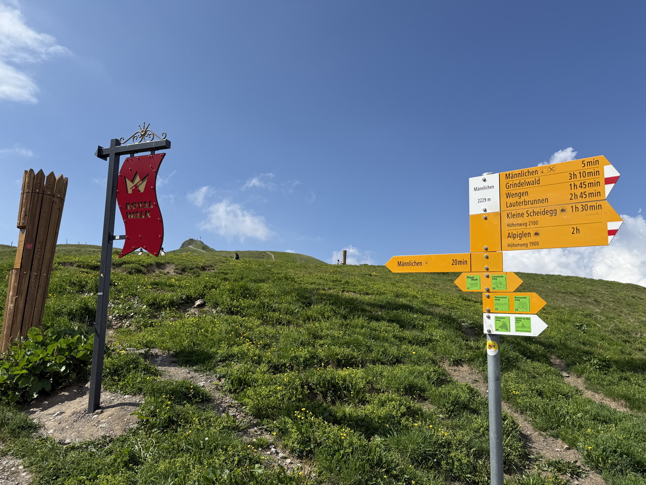 溫根 (Wengen) 也是一座山中小鎮,具有古樸傳統風俗的度假勝地。經過這裡,是要坐纜車上到海拔更高的曼利申 (Mannlichen) 。曼利申有一段步道很短,卻很美麗的皇家步道(Royal Walk) 。正要往步道走,路中間放著告示牌,寫著往格林德瓦的最後一班纜車是下午5:10。看看手錶,顯然我們現在就必需要往纜車站移動。沒辦法,皇家步道就只能遠望了。