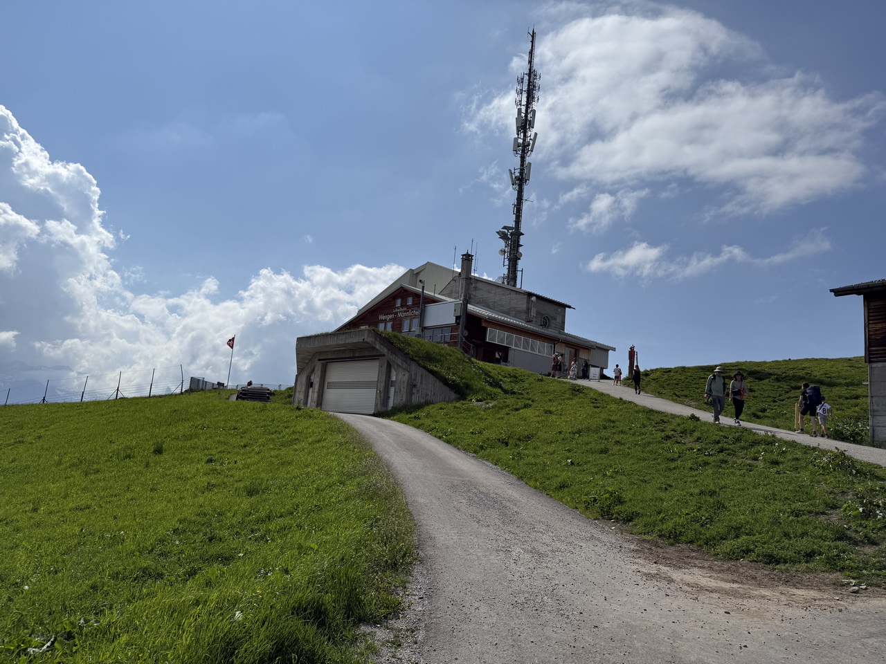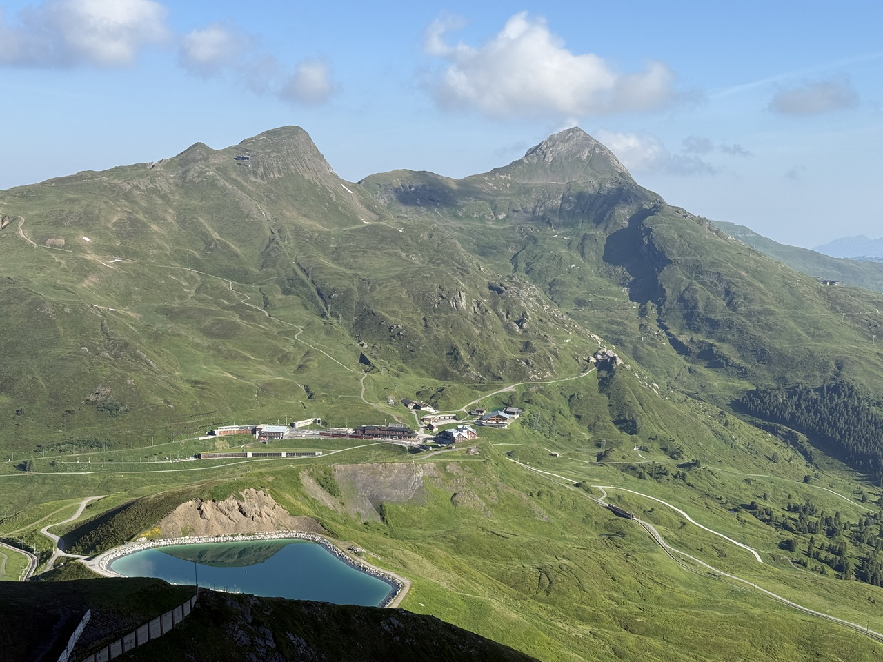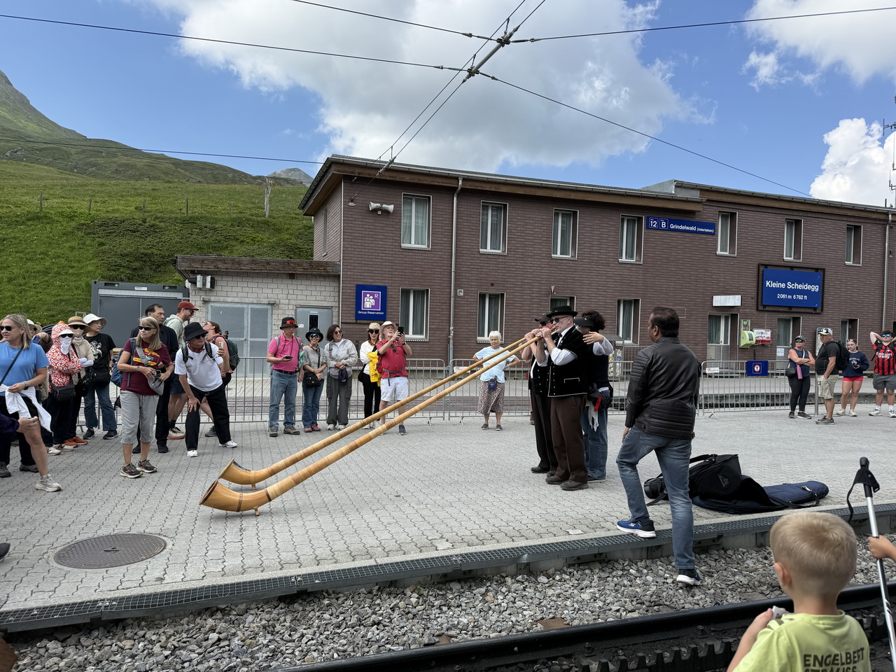 昨天坐火車來到小夏戴克,下車時把兩支登山杖遺落在車上。今天又來到這裡,第一件事是找穿黃背心的車站工作人員,問問看是否有留在車站,很幸運的拿回來了登山杖。在遊客中心內休息等火車時,外面傳來了悠揚的音樂聲。到外面看,發現是兩位樂手,在月台上以阿爾卑斯長號吹奏樂曲。這是第一次在瑞士高山上,現場觀賞表演當地特色樂器,十分難得。