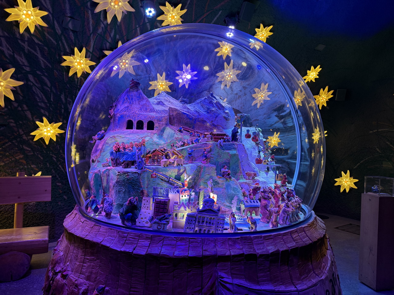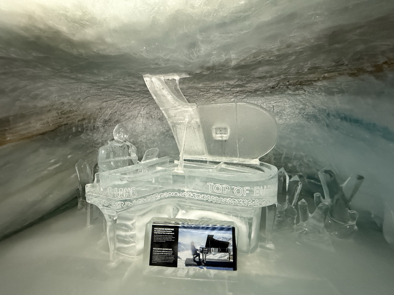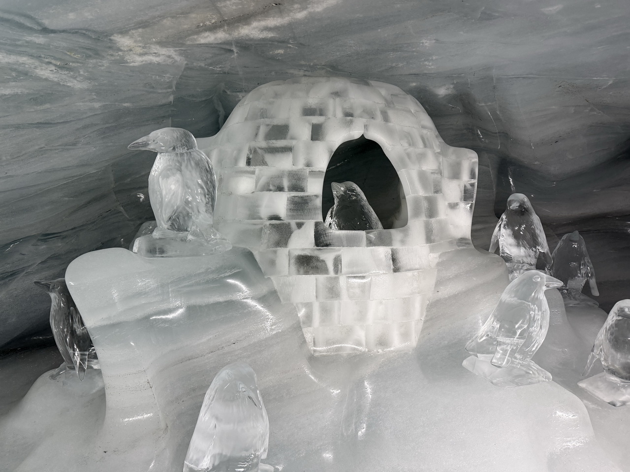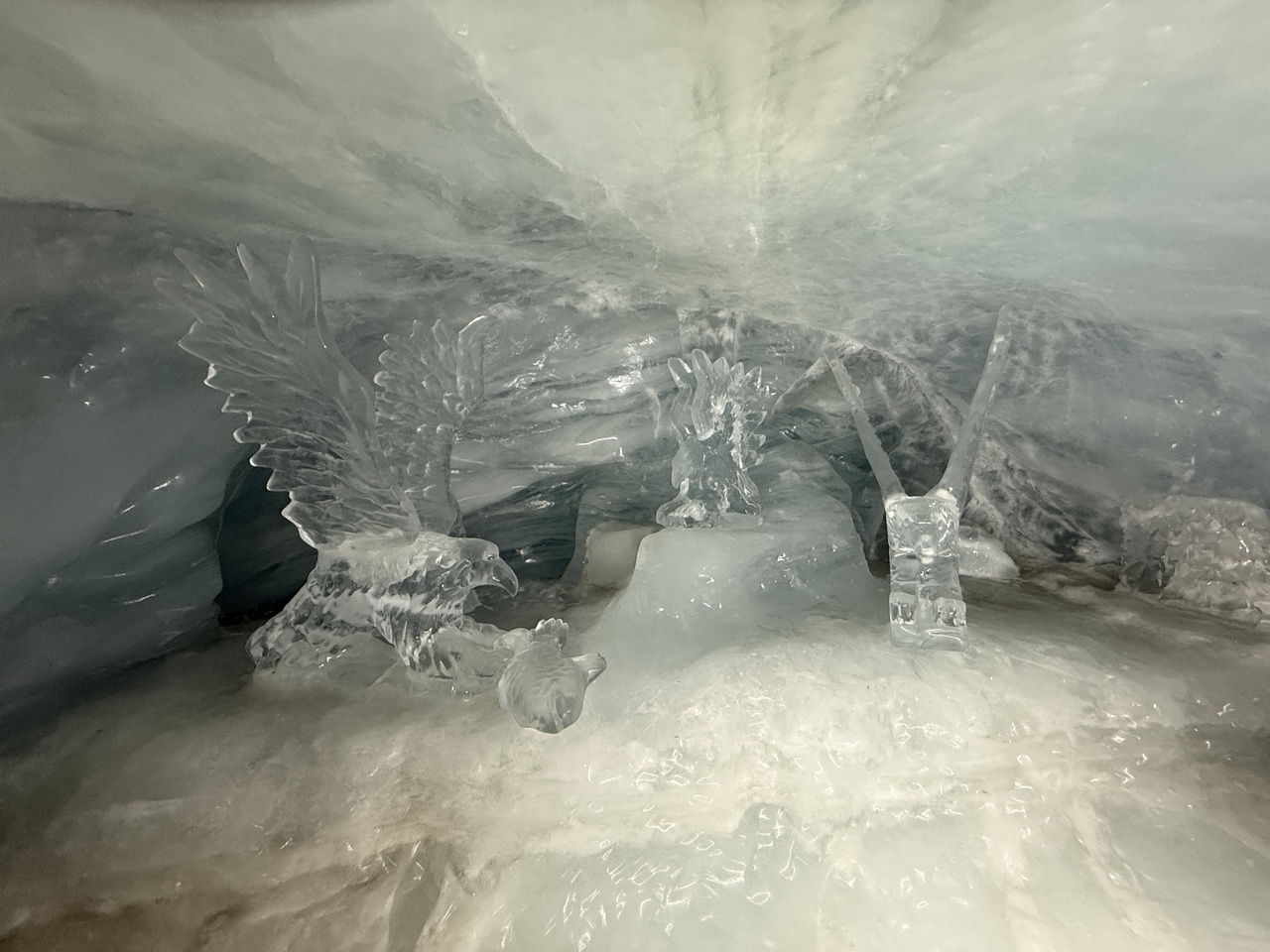 冰宮是在冰河下方挖的小隧道,走道邊有幾個冰雕作品。冰雕作品有北極熊、朗朗的演奏鋼琴曲的神情、老鷹等。走馬看花很快就走完了。