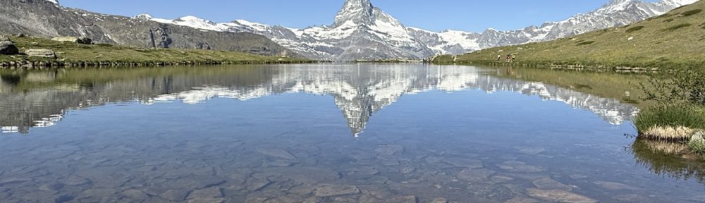 從纜車站出發,一路往上走,坡度不大,很好走。第一個湖Stellisee,湖形比較狹長,是看馬特洪峰倒影的好地方。剛到時水面上有些漣漪,山的倒影並不清楚。由於我們在這裡停留的時間夠長,湖面平靜時馬特洪峰的倒影終於出現了。今天的倒影比昨天在利菲爾湖的更清晰,不過今天距離馬特洪是更遠的。