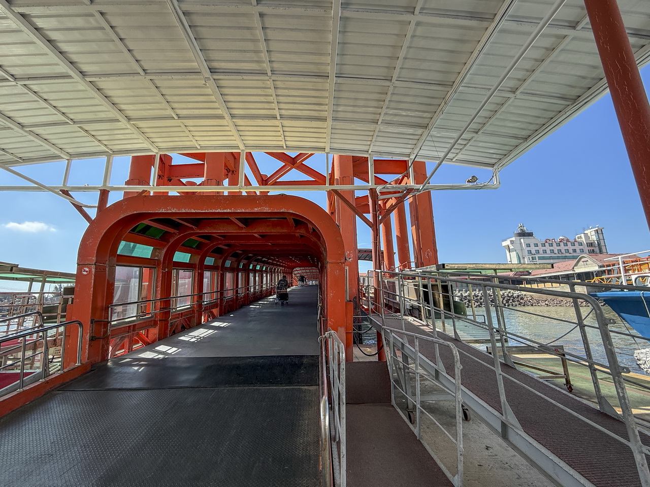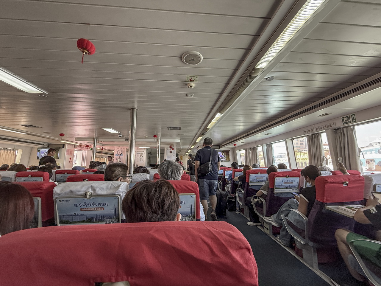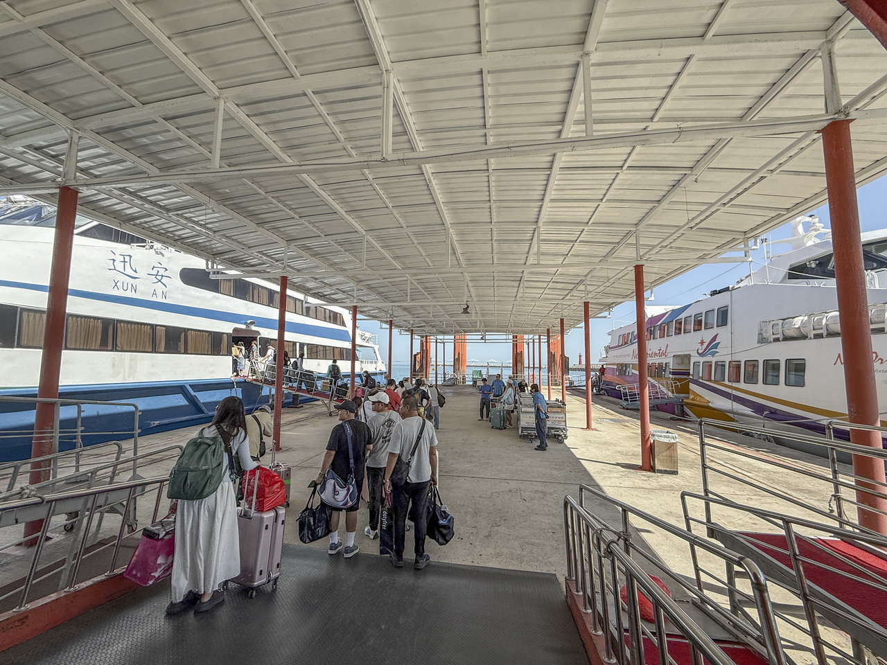 首先,在金門尚義機場,下飛機領到行李,走出航厦,就要快速找到負責接駁的車輛。到了水頭碼頭,有專人幫忙領取船票,然後自行通過安檢通關等程序。為了在廈門的五通碼頭能爭取時間,快速通關,在水頭碼頭上船時就要講究一下方法。依黃兄事前的指導,依序上船後,找到座位稍稍放鬆一下,等船在五通碼頭靠岸,再進行下一步驟。