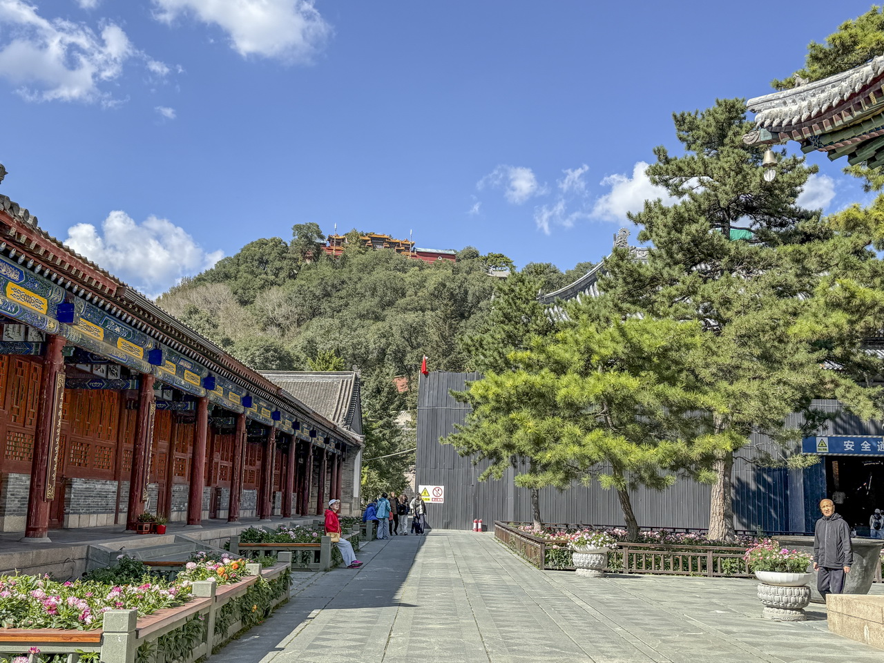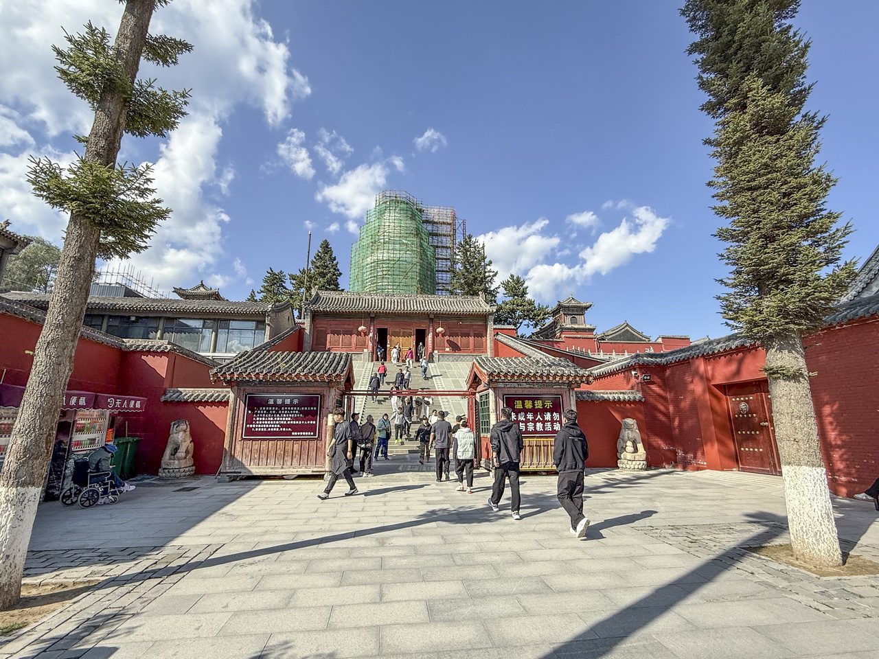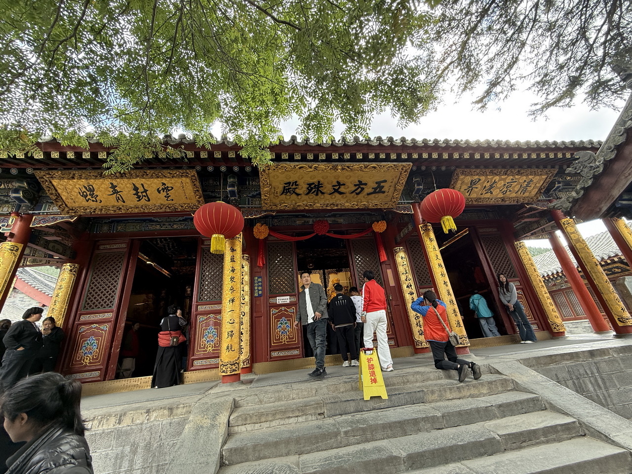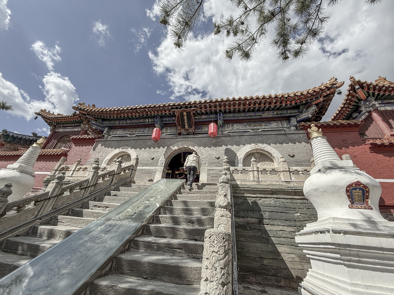 下黛螺頂後前次往菩薩頂,此寺建於北魏孝文帝時期,為五台山最大的藏傳佛教寺院。從大照壁上行,為108個石階,牌樓中門為康熙皇帝御題「靈峰勝境」。相傳清朝在位皇帝,曾多次來菩薩頂禮拜。