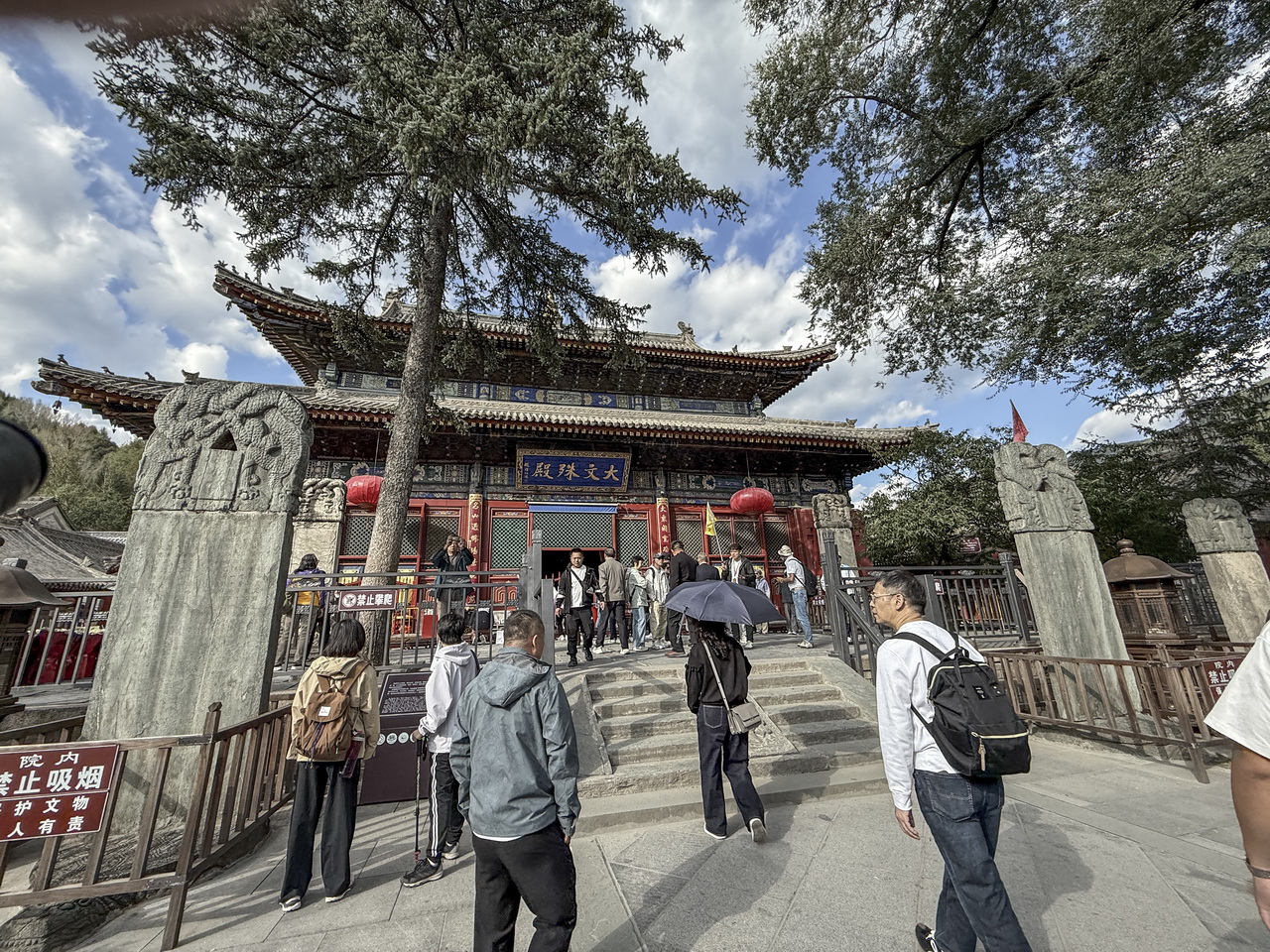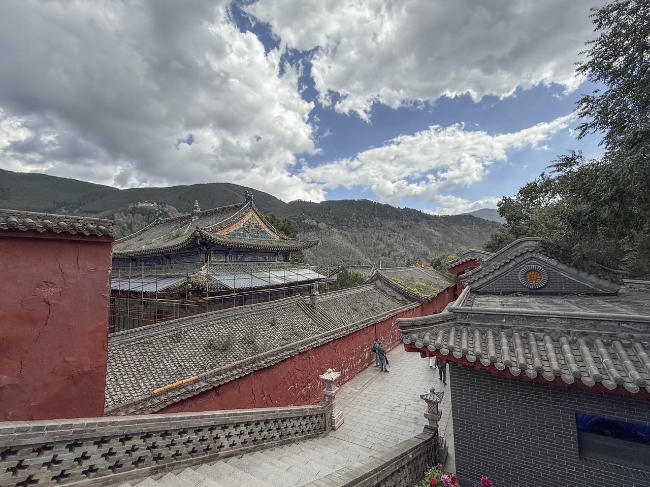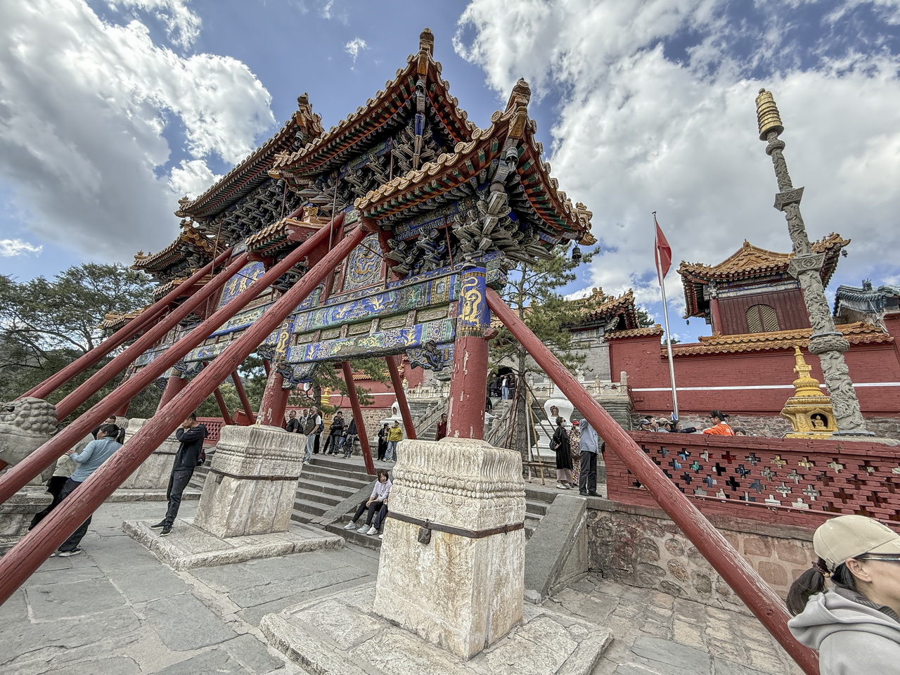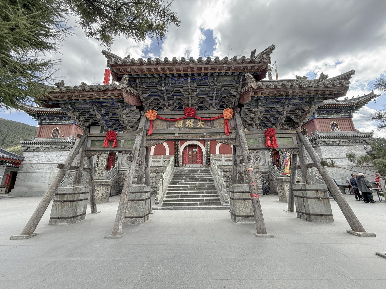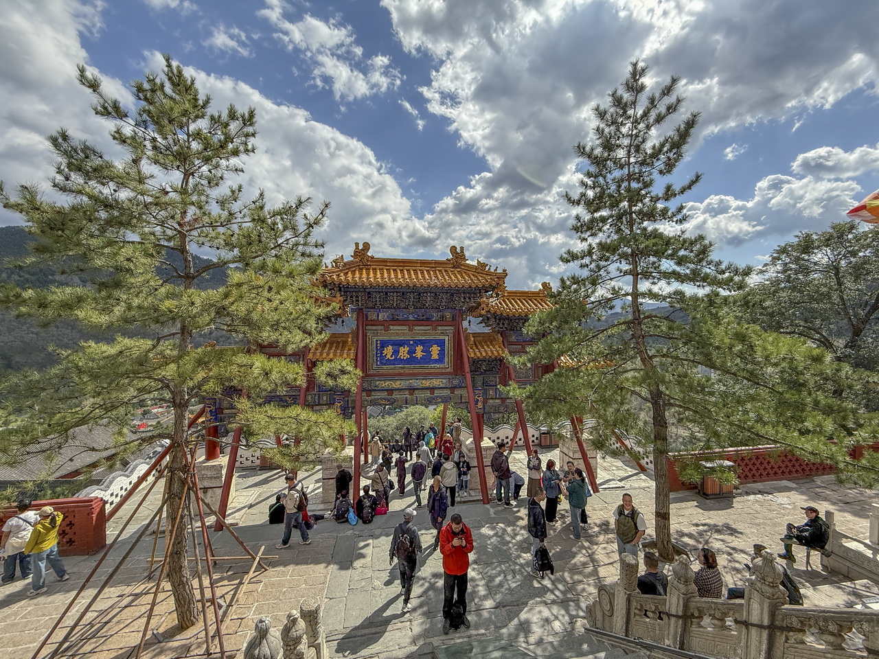 下黛螺頂後前次往菩薩頂,此寺建於北魏孝文帝時期,為五台山最大的藏傳佛教寺院。從大照壁上行,為108個石階,牌樓中門為康熙皇帝御題「靈峰勝境」。相傳清朝在位皇帝,曾多次來菩薩頂禮拜。