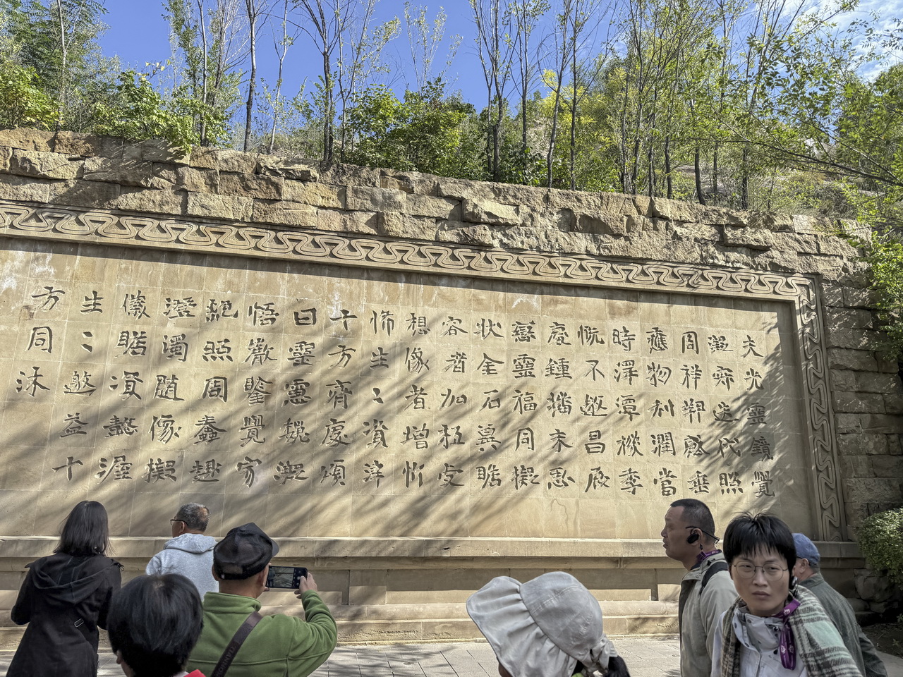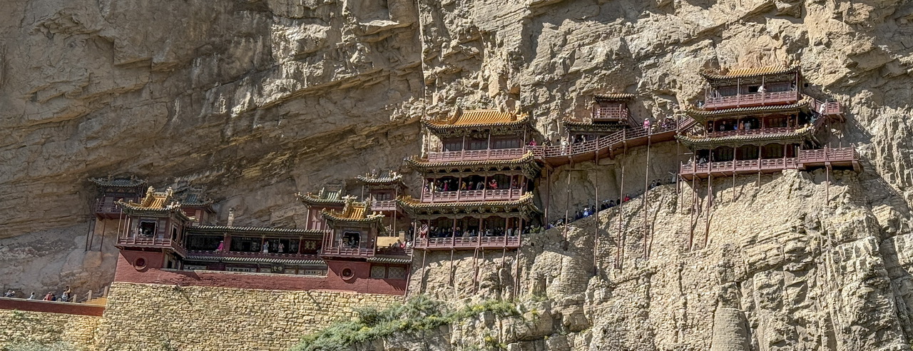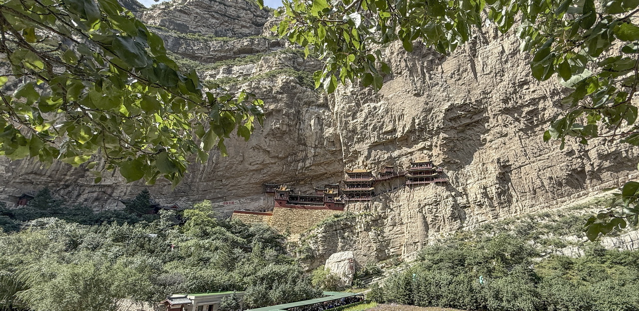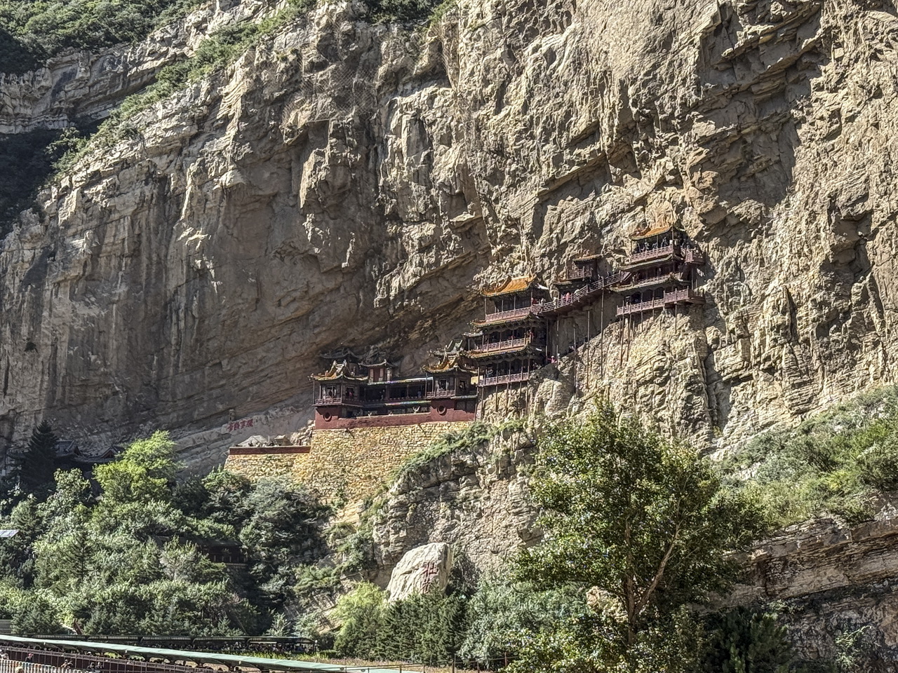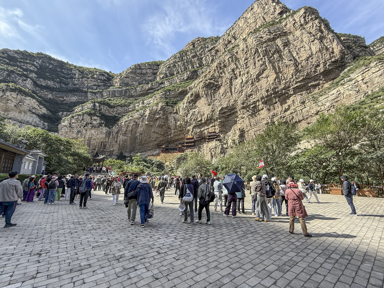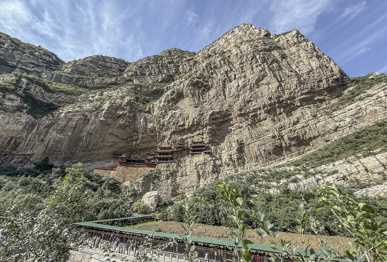 繼續顧用昨天的計程車,到了恒山遊客中心,司機還告訴我們前往懸空寺和恒山搭擺渡車的注意事項。本來計劃要買票登上懸空寺的,來到售票口,當日的票已經售完。看來想要買到票,必需得提前在網路預約購票才有可能。搭車來到懸空寺,遊客非常多。沒有買到登臨懸空寺的票,就只能在對岸遠望構築在峭壁間的懸空寺。懸空寺以獨特的建築風格,建於獨的山崖上,被稱之為掛在懸崖上的寺。刻有懸空寺的大石,和對岸的寺構成的圖,就成為遊客排隊拍照的重要任務。
