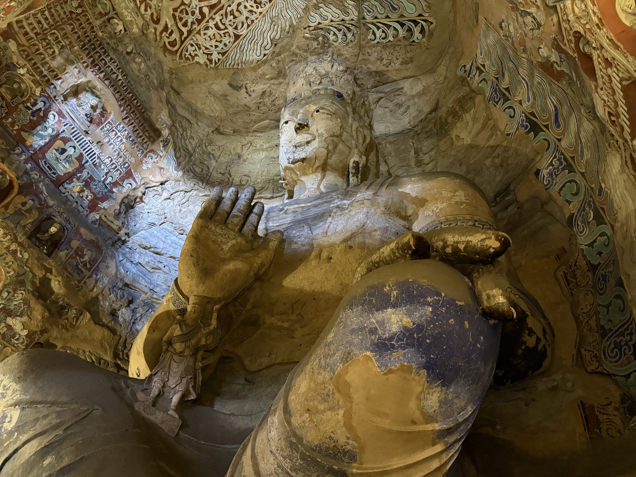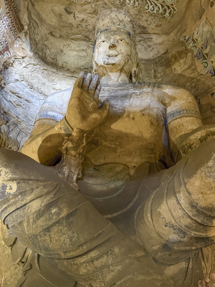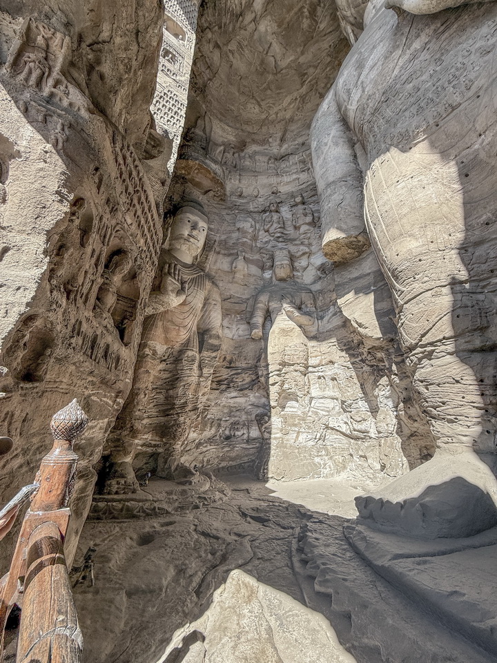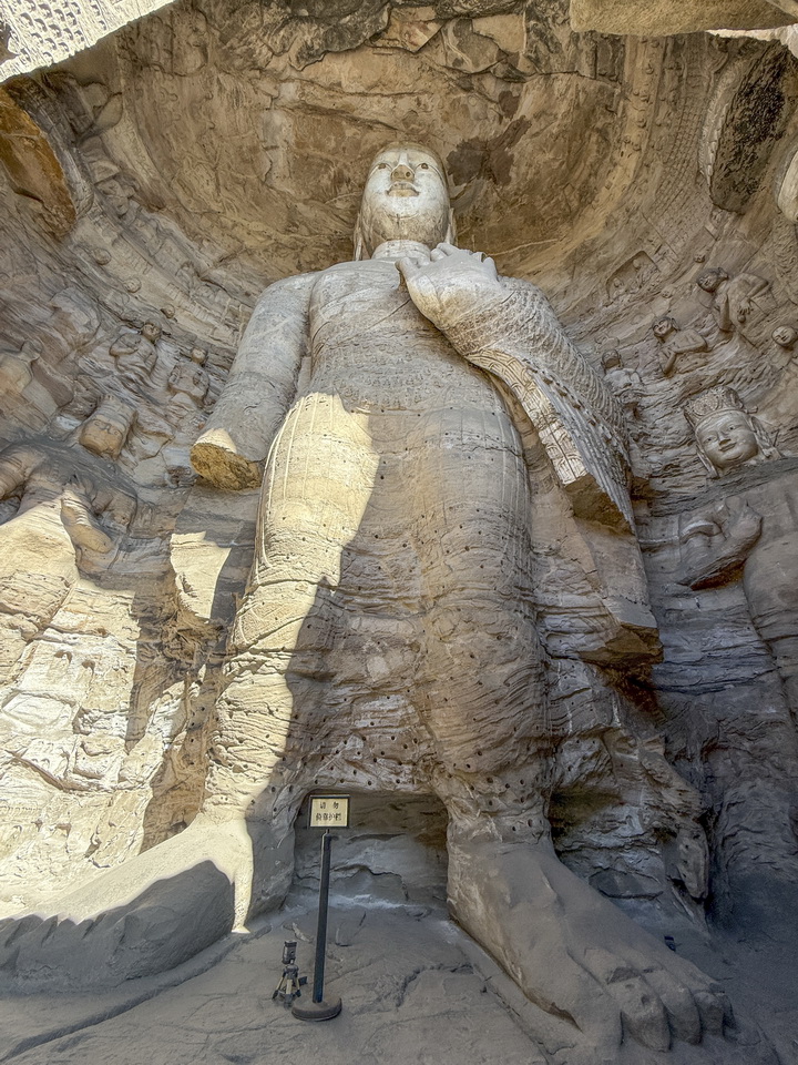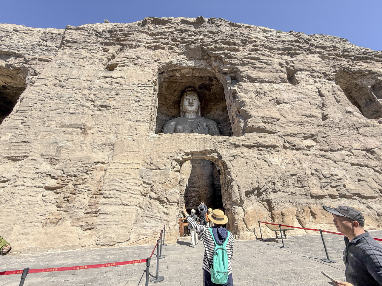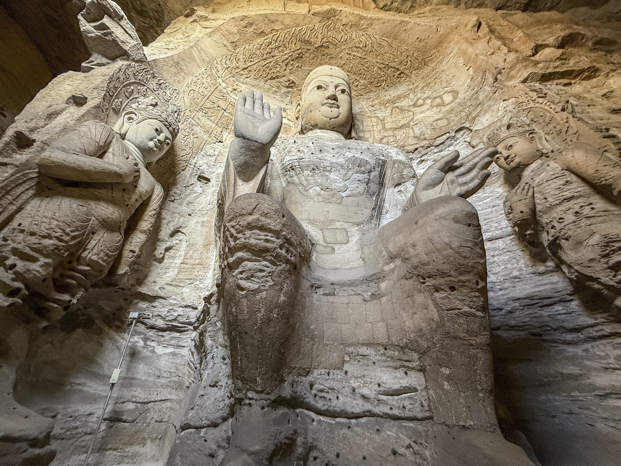 第十九窟:主佛像跏趺坐高16.8公尺,是雲崗第二大佛,耳輪齊肩。