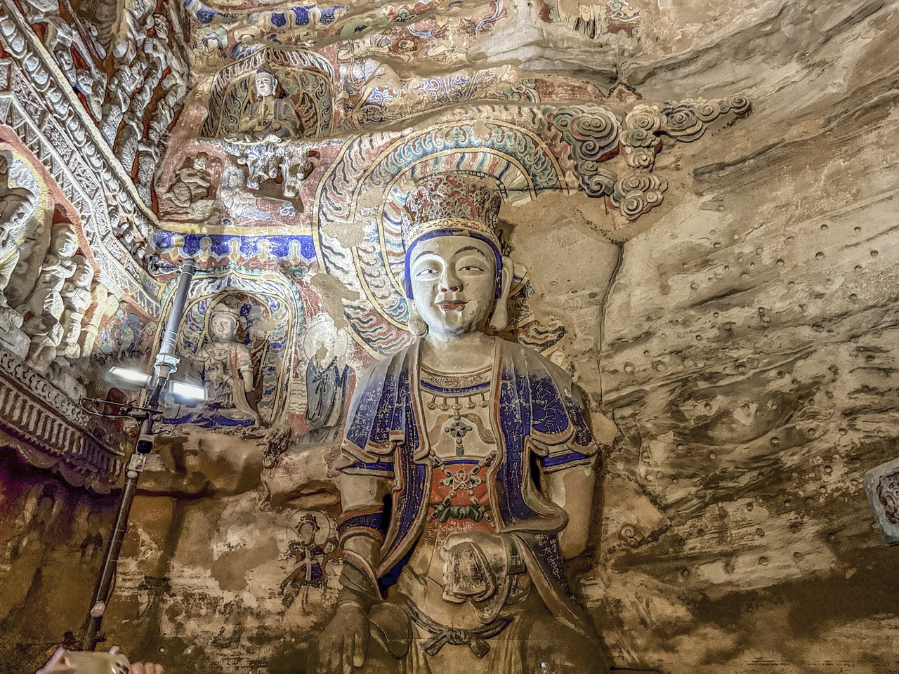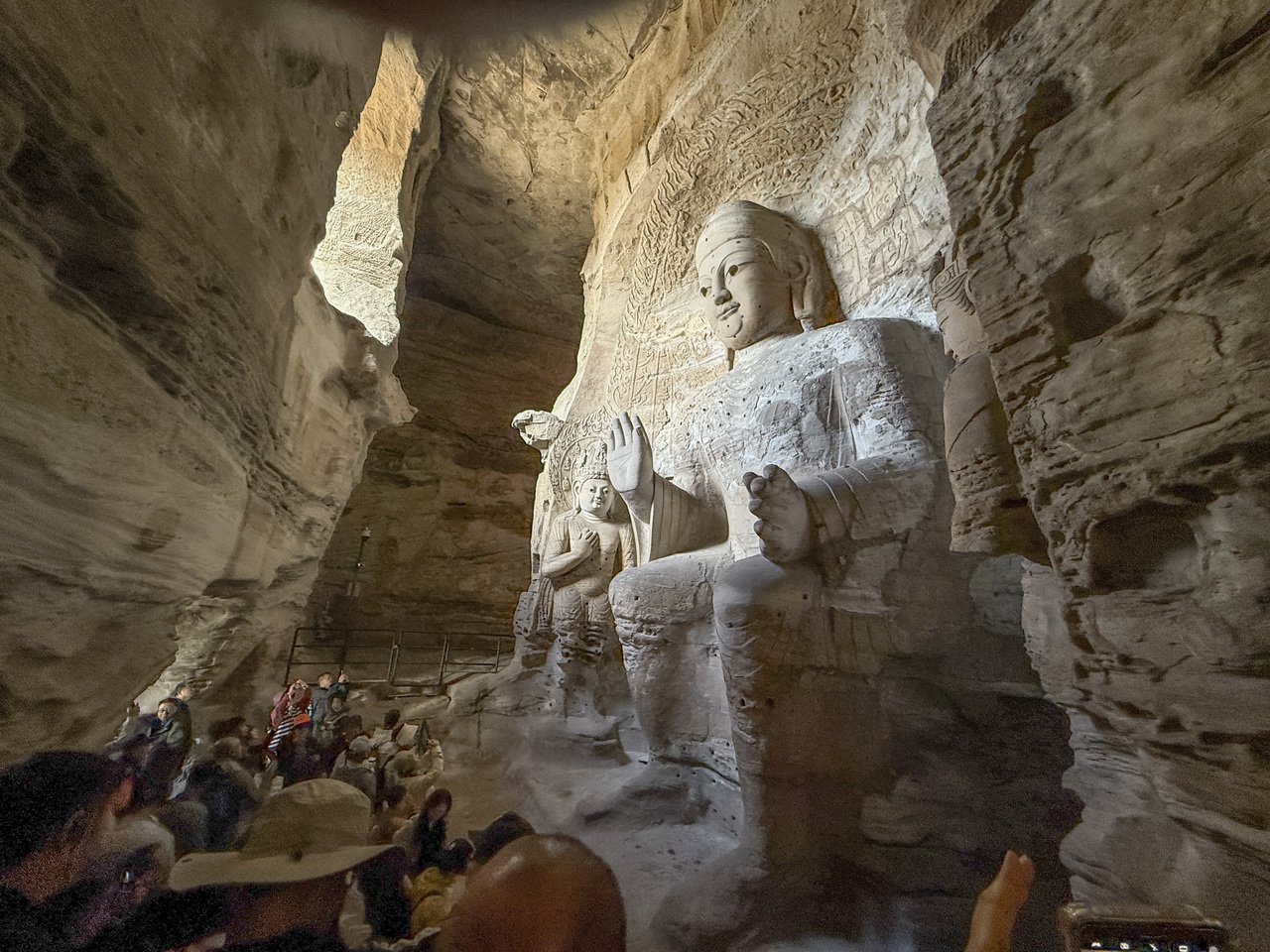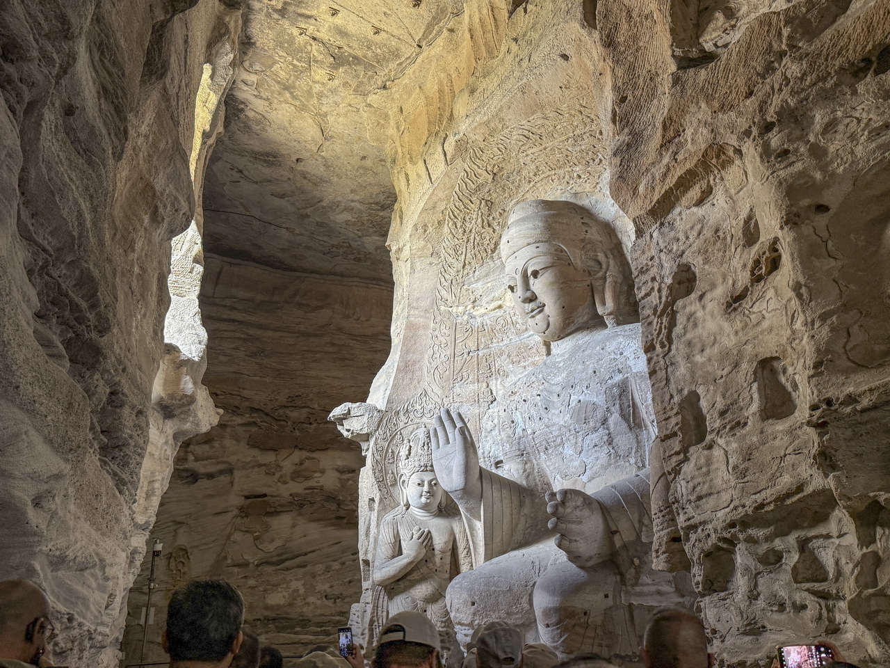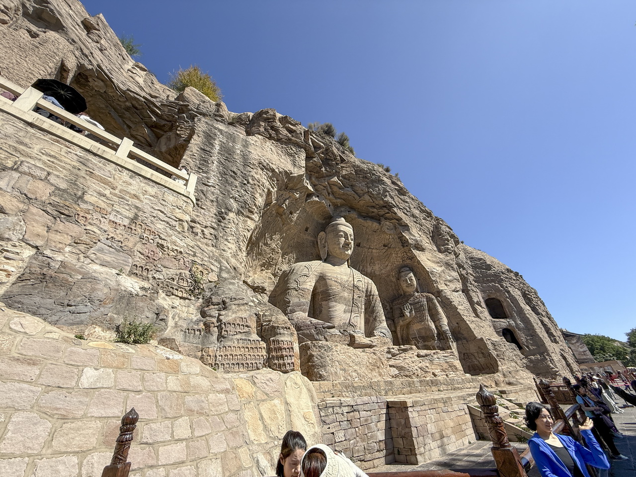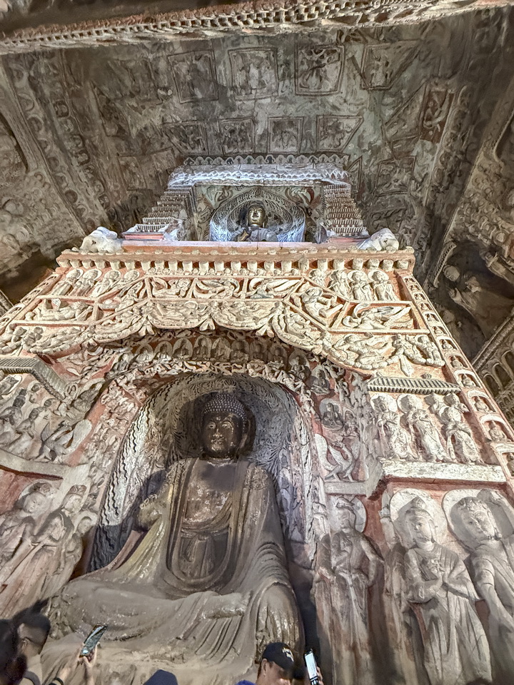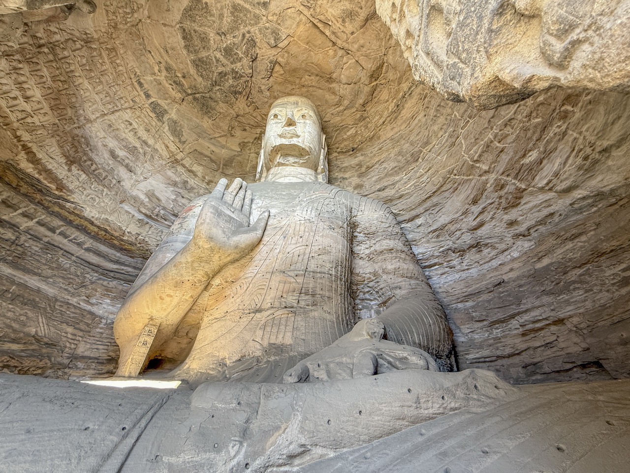 第十九窟:主佛像跏趺坐高16.8公尺,是雲崗第二大佛,耳輪齊肩。