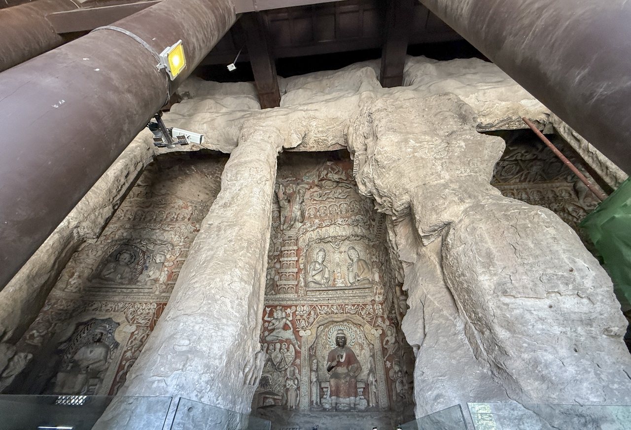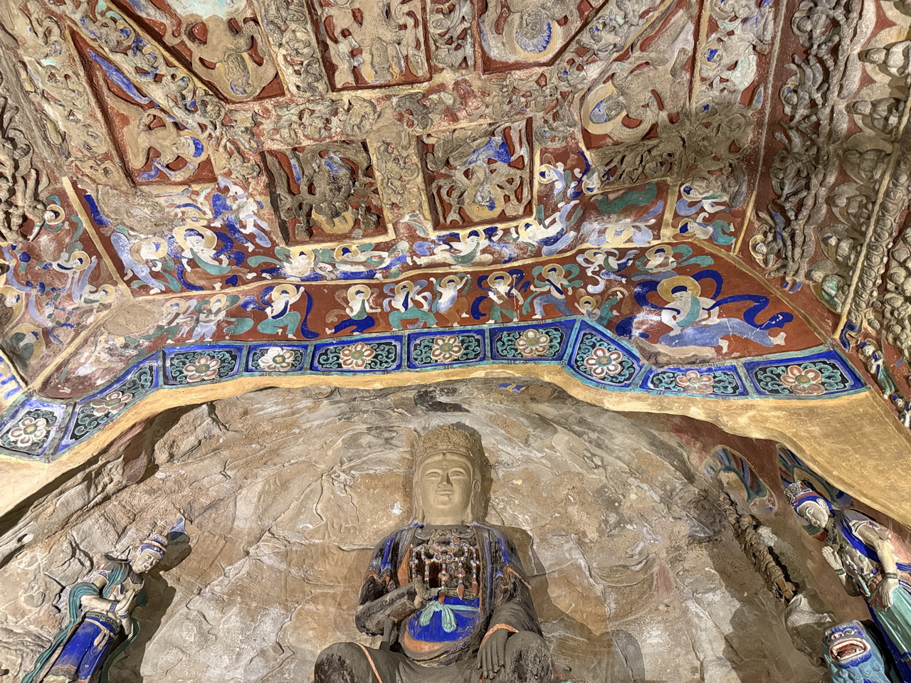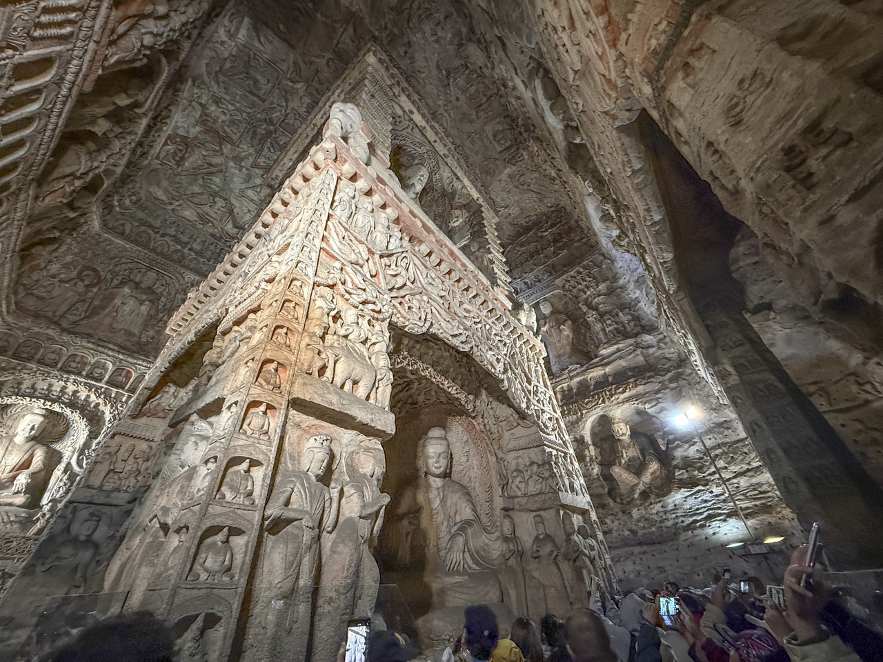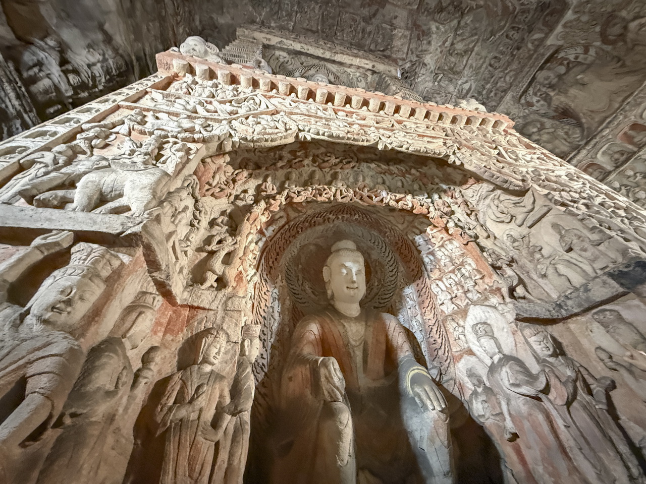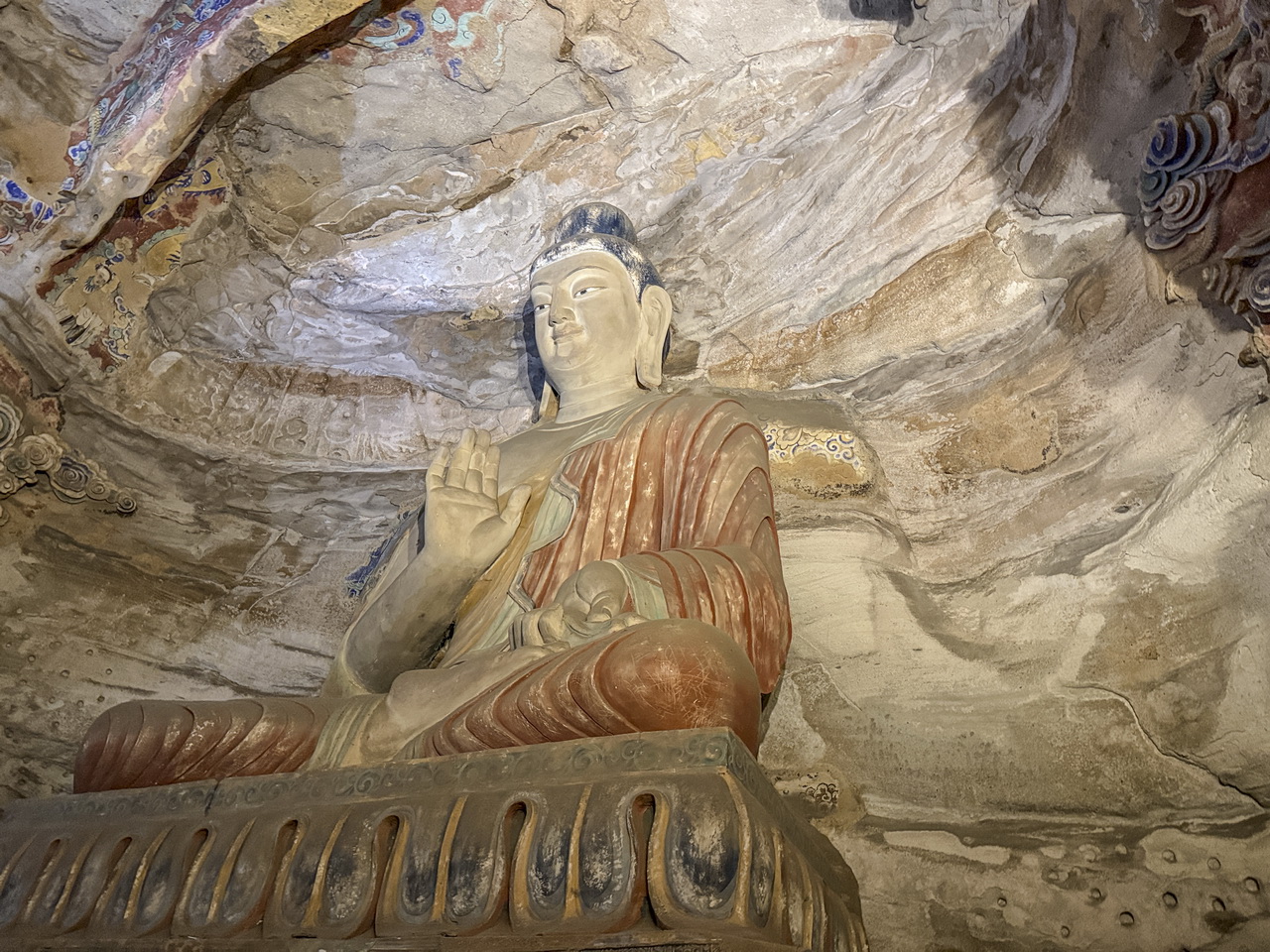 第十九窟:主佛像跏趺坐高16.8公尺,是雲崗第二大佛,耳輪齊肩。