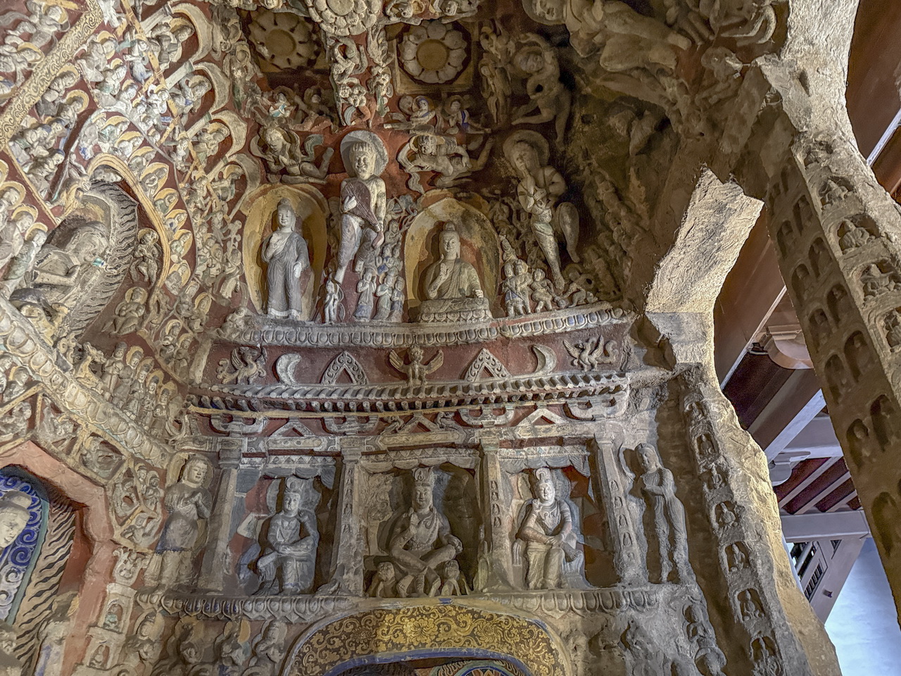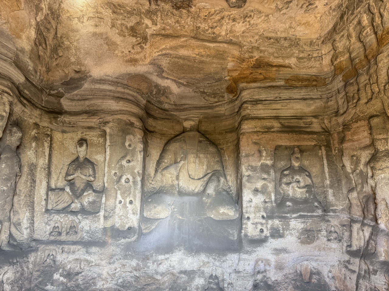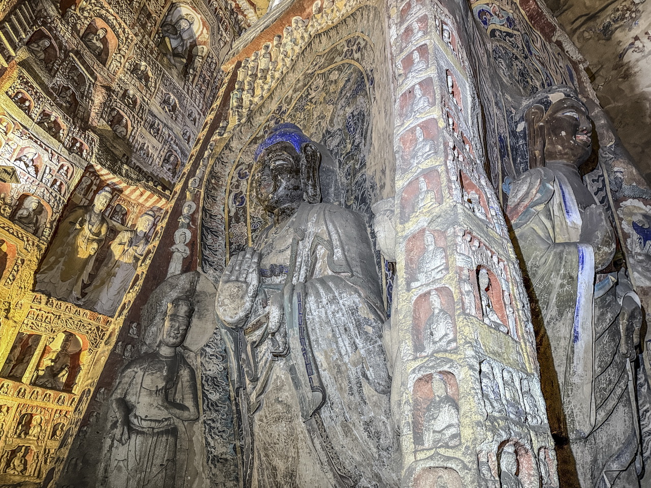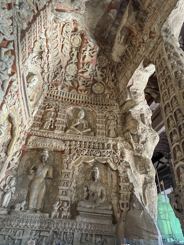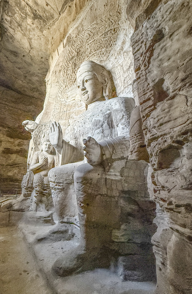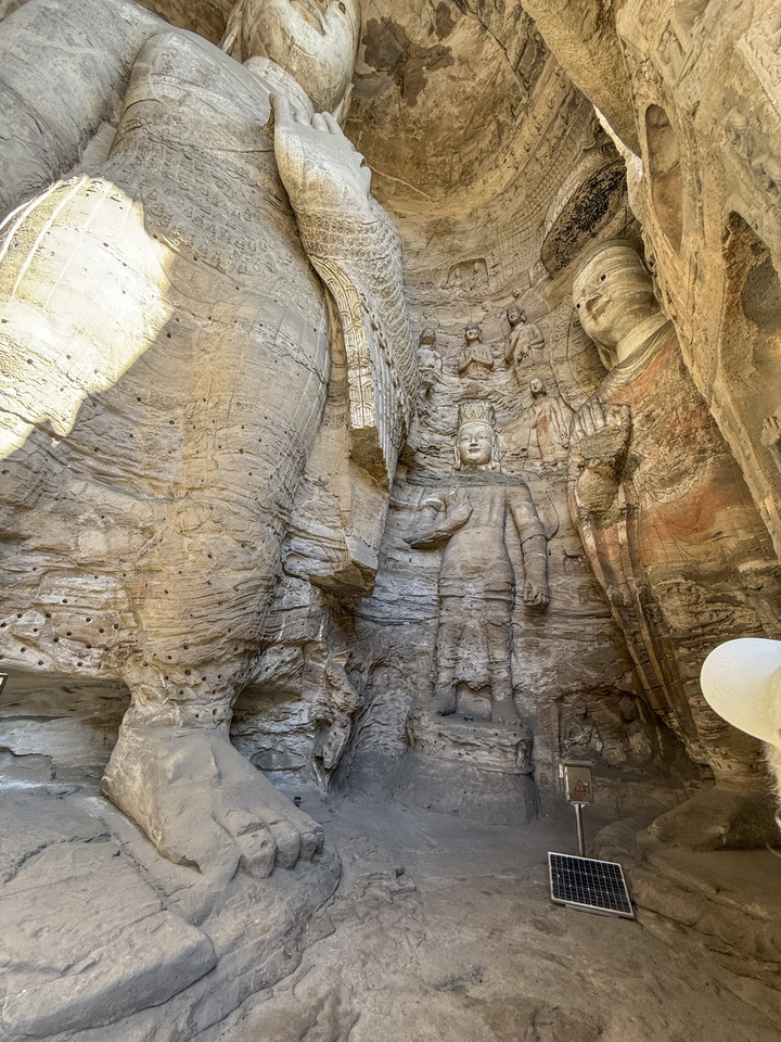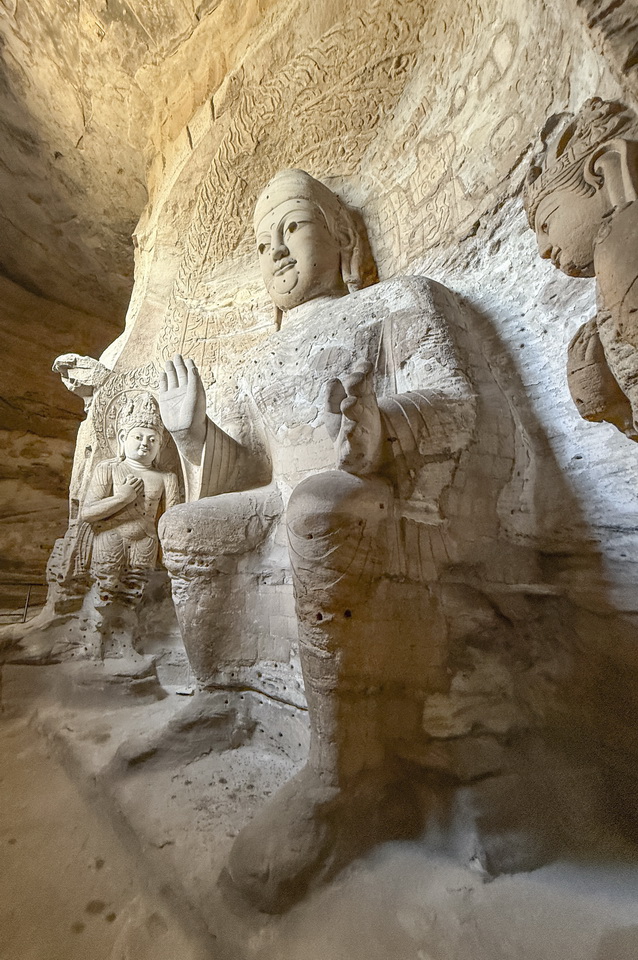 第三窟:是雲崗最大的洞窟,原設計尖型塔廟窟,窟外山崖僅存十二個梁木孔。北壁雕阿彌陀佛、觀世音和大勢至菩薩,即西方三聖。