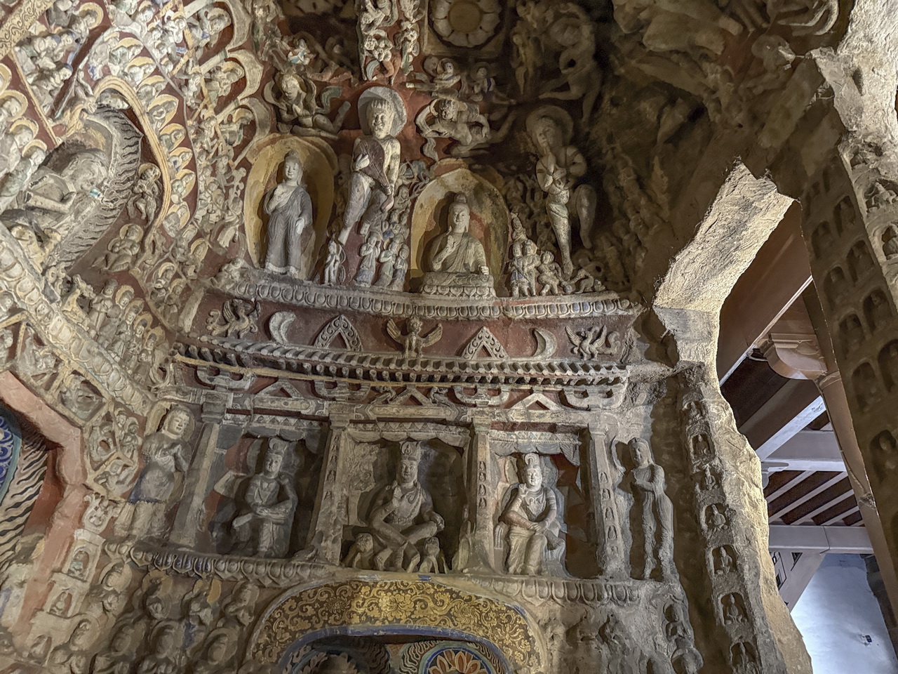 第五、六窟:五、六窟為雙窟。現今5、6窟(7、8、9、10、11、12、13等也是)外部的窟檐都是近代新增的加固建築。第五窟北壁坐佛高17公尺,為雲崗最高大的佛像。六窟現存佛傳故事圖三十多幅,呈現佛陀誕生、出家、成道、弘法的場面。