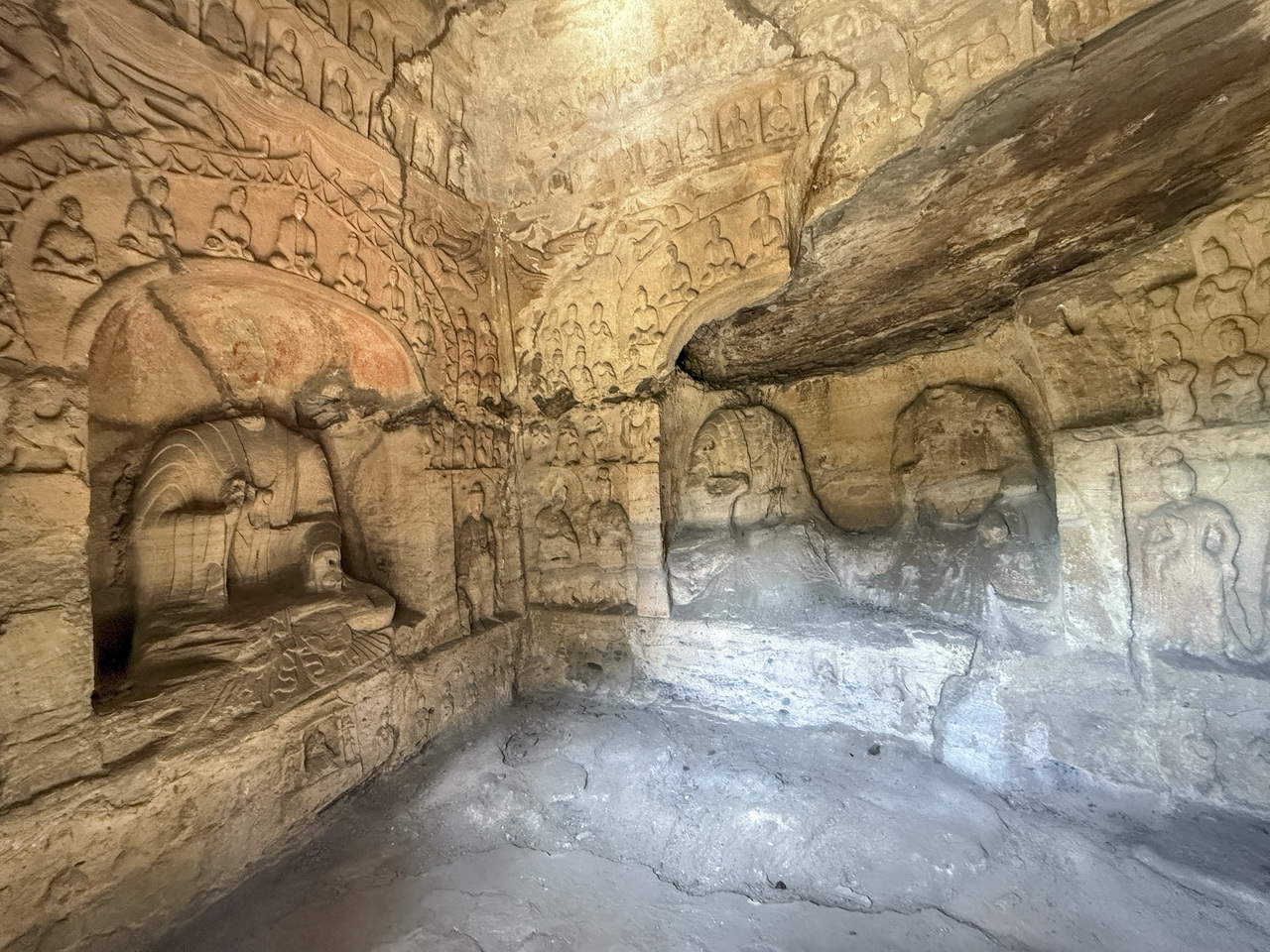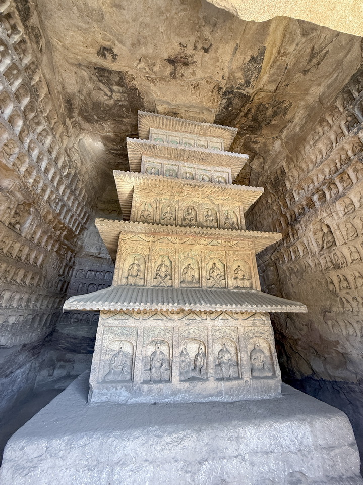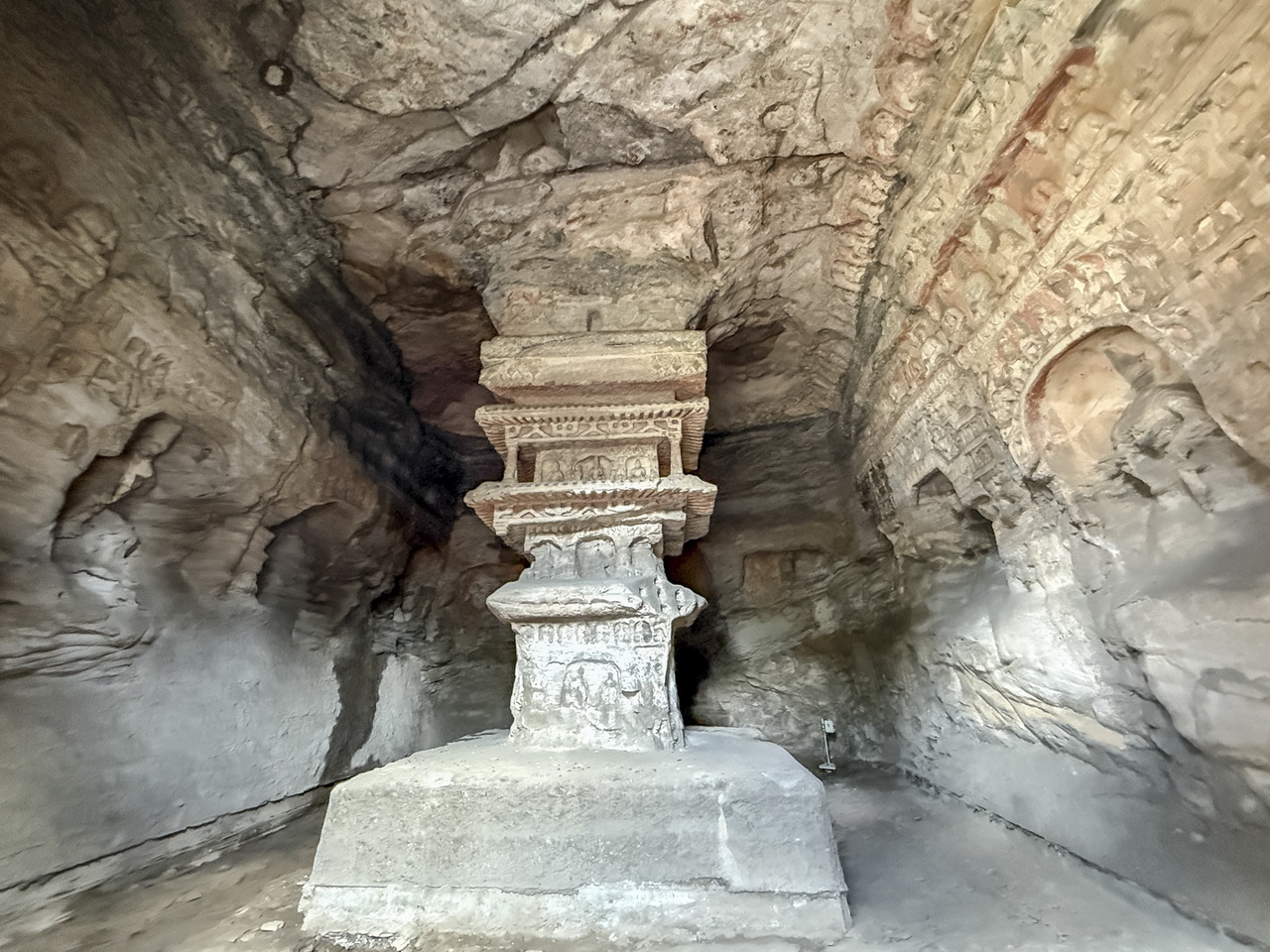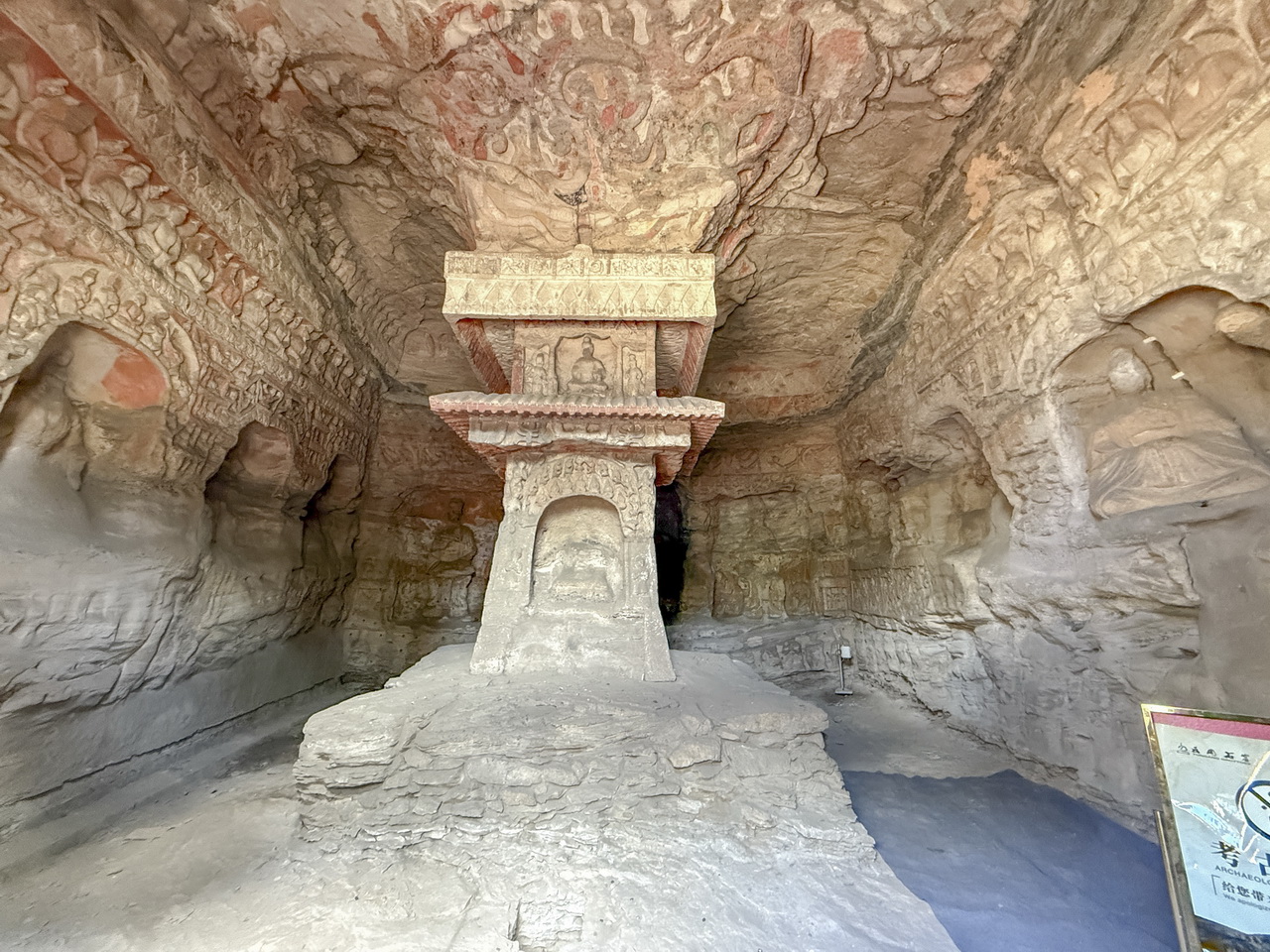 第四窟:塔廟窟,未完工。中心塔柱四面都是一佛二菩薩。