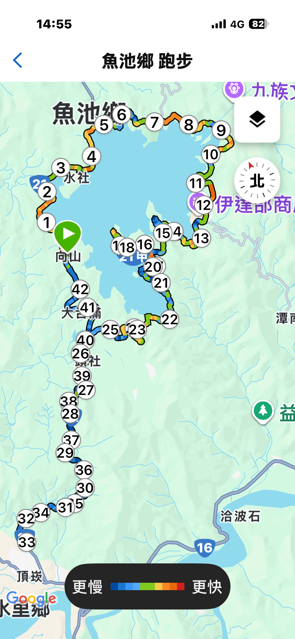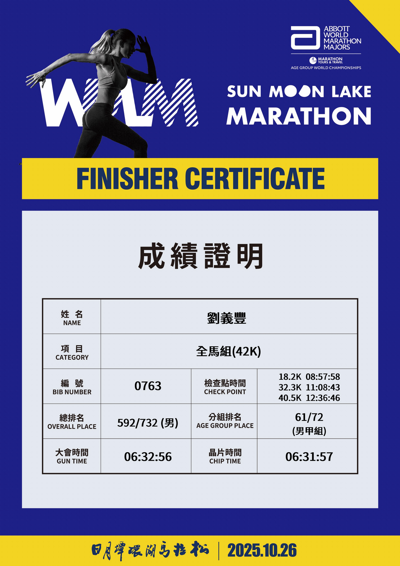 今天參加路跑的人看起來非常多,大會說有六千人。在會場參賽人的號碼牌以紅色的佔大多數,那是參加29K環湖的超半馬,看來這個項目比較受歡迎。參加42K的人數明顯偏少,只有732人報名。今天的天氣上午是多雲,近中午時太陽露臉,此時氣溫略高。賽道的東側都有樹木遮蔭,會曬到太陽的路程並不多。整體賽程跑下來,如原先所知,在折返點後的陡坡路段,大部分只能步行。為了能在中午13點前返回終點,偶爾還是要小跑步,只是能力不足,多了近兩分鐘,才抵達終點。還好,有完成全部賽程。