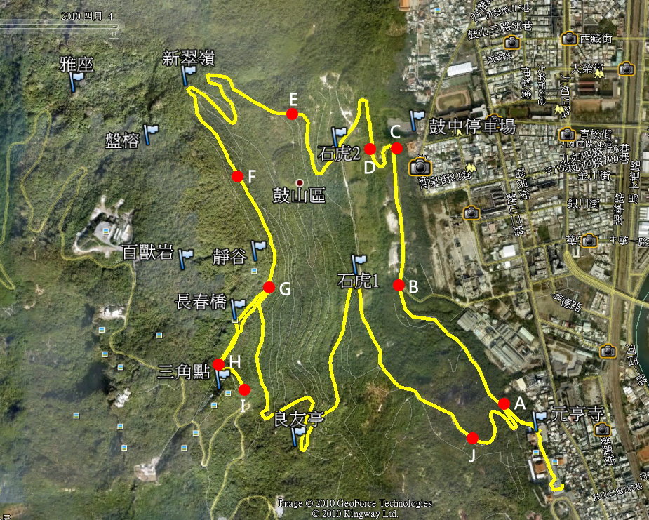 從元享寺最裡面的停車場起算,全程約8.9公里,去程是上坡,回程則全是下坡。騎車時請絕對要禮讓步行的登山遊客,當登山遊客自動讓我們時,也請一定說聲"謝謝"。 99/04/11 說明:1.建議出元亨寺第二座鐵門時向右騎(雖然這裡有禁止通行的告示牌)。理由是這段路較寬,行人較少,坡度也較緩。AB間是下坡。BCDE間都是上坡。 2.D點是下山時通往停車場的木棧登山步道。E點是四棵榕樹。EF間是比較陡的坡。 3.FG間是平緩的步道,請特別小心步行的登山遊客,並請禮讓行人。G點是長壽園,也是三叉路口。 4.GH是全程道路最狹窄且陡的路段,若不禮讓行人,非常容易撞傷行人。尤其遇有下山騎士錯車時,更是容易發生相撞的危險。 5.HI為緩坡。I點為好漢亭,終點。 6.回程可原路折返,也可在G點右轉,經良友亭,在石虎1右轉,經J點回到A點。從I點到石虎1都是陡降坡,一定要非常小心,不然很容摔車或與行人相撞。JA也是下坡路段。 |